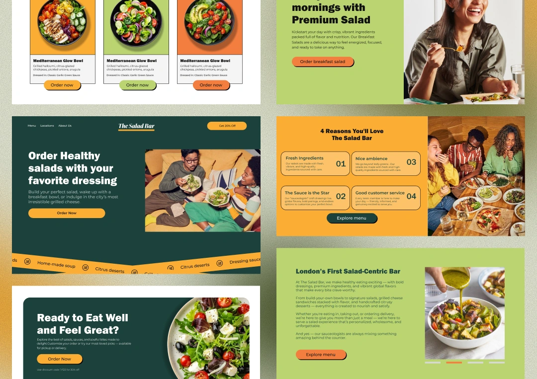 The Salad Bar is the first salad-centric restaurant in London, offering a vibrant mix of signature and customizable salads, grilled cheese, handcrafted sauces, breakfast salads, and healthy desserts. The brand combines fresh, premium ingredients with a colorful, cosmopolitan identity. The project was to design a homepage that reflects their personality while guiding users seamlessly to place an order.
