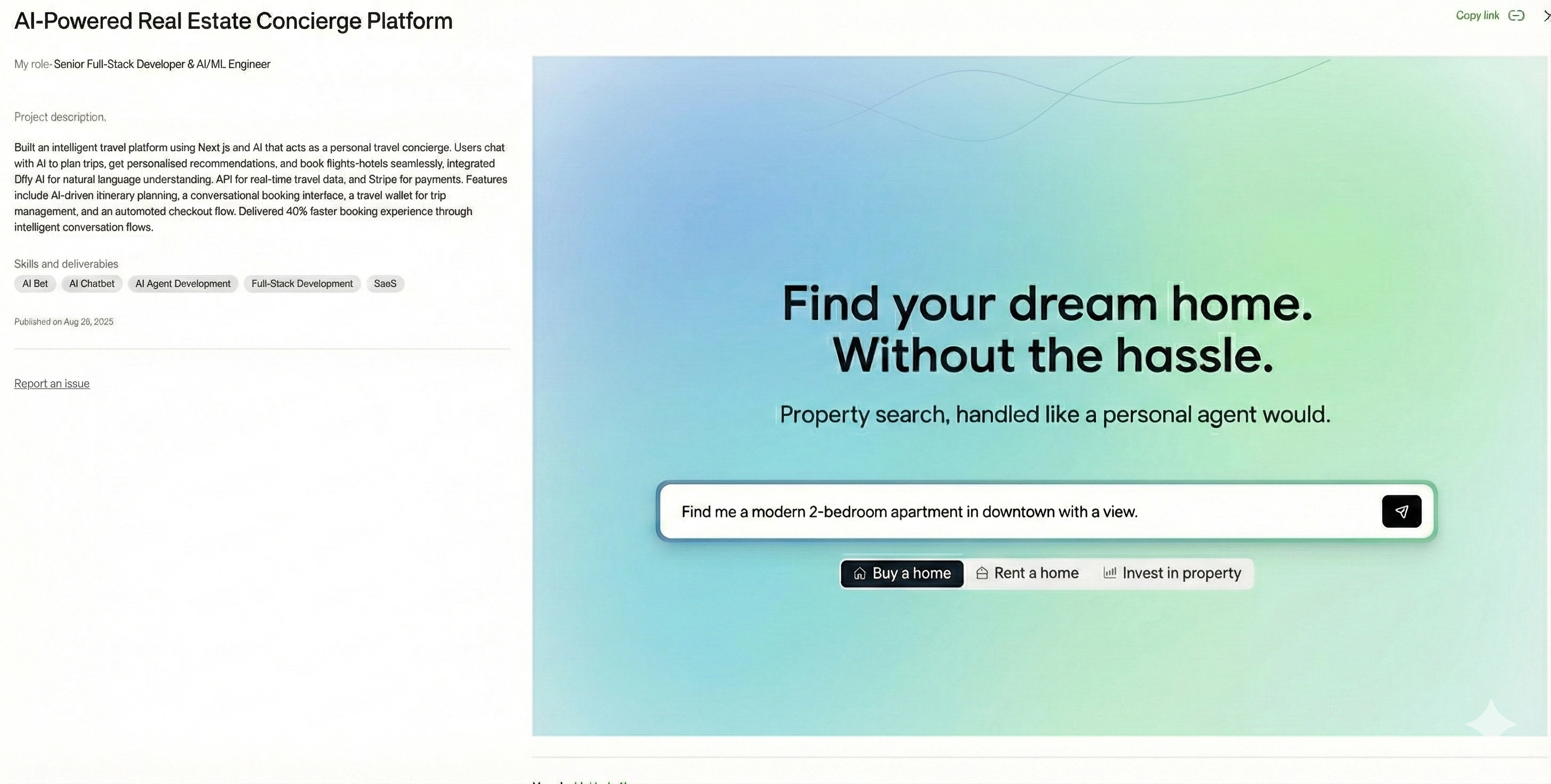 Instead of ticking boxes, users describe their dream lifestyle (e.g., "Find me a modern 2-bedroom apartment in downtown with a view"). The platform uses Retrieval-Augmented Generation (RAG) to understand user intent and perform semantic searching across property databases in real-time, delivering highly relevant results that match the user's emotional and practical needs.