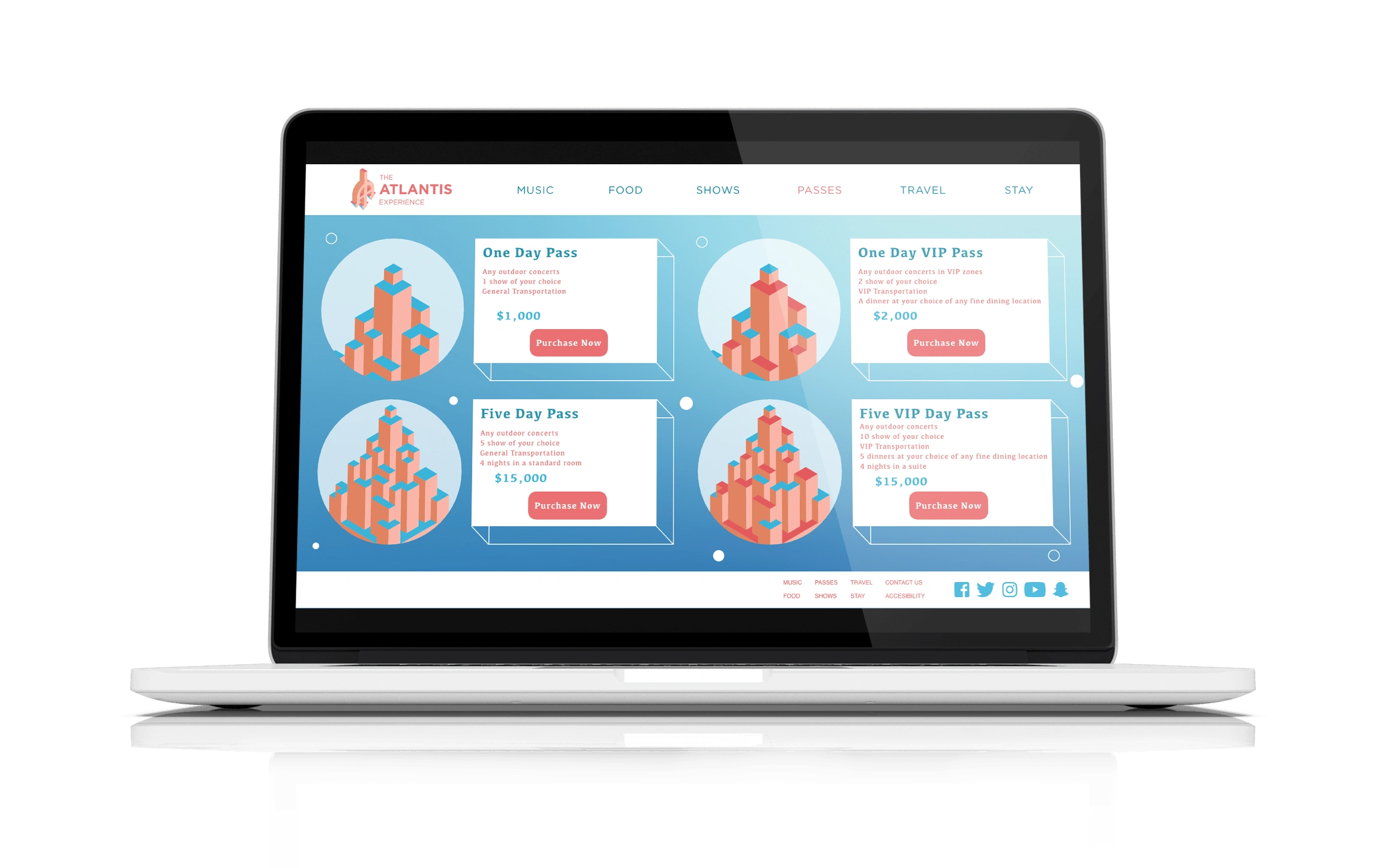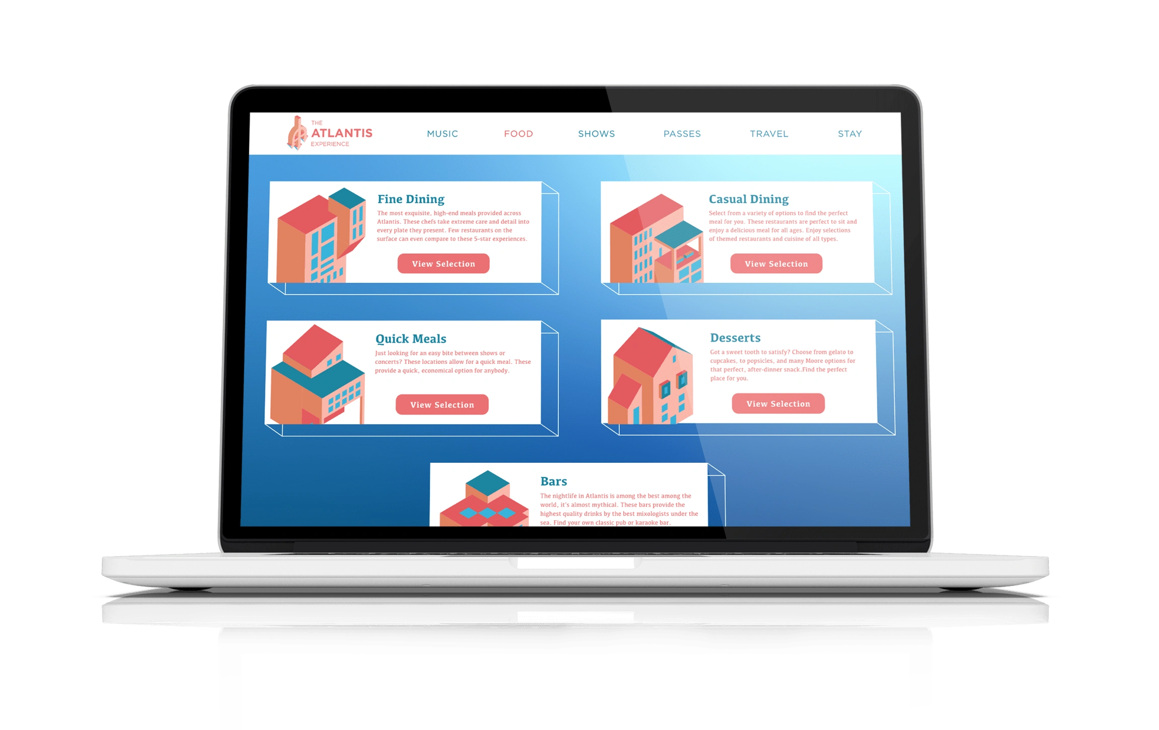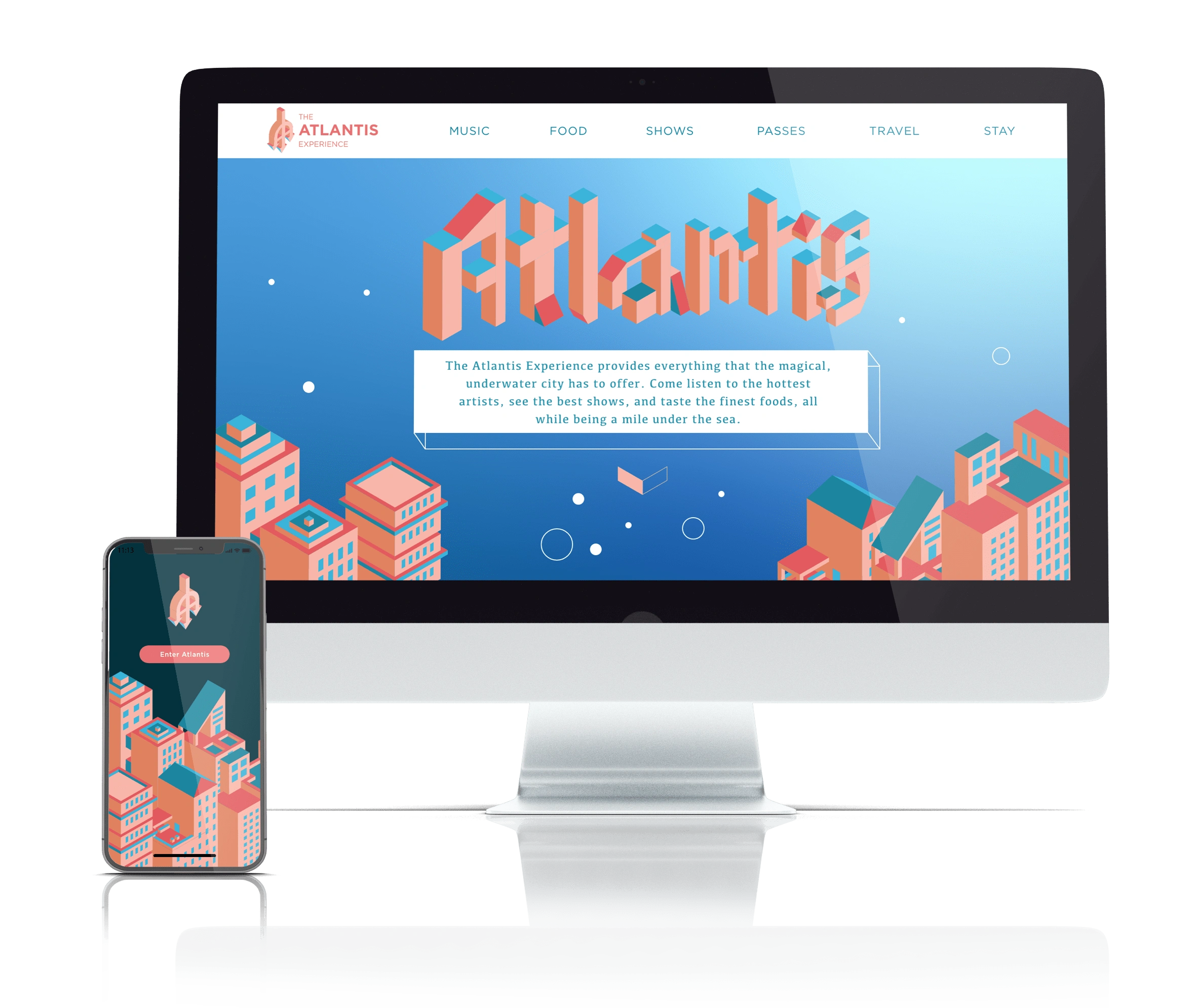 The Atlantis Experience is a fictional festival taken place in the mythical city of Atlantis. The website promotes and provides all the information needed to know to attend the fantastical, five day, festivities. Considering Atlantis is a fictional location, the website is largely illustrative and works with a color palette that works well for an underwater city and pays homage to the origin of Atlantis, Ancient Greece.