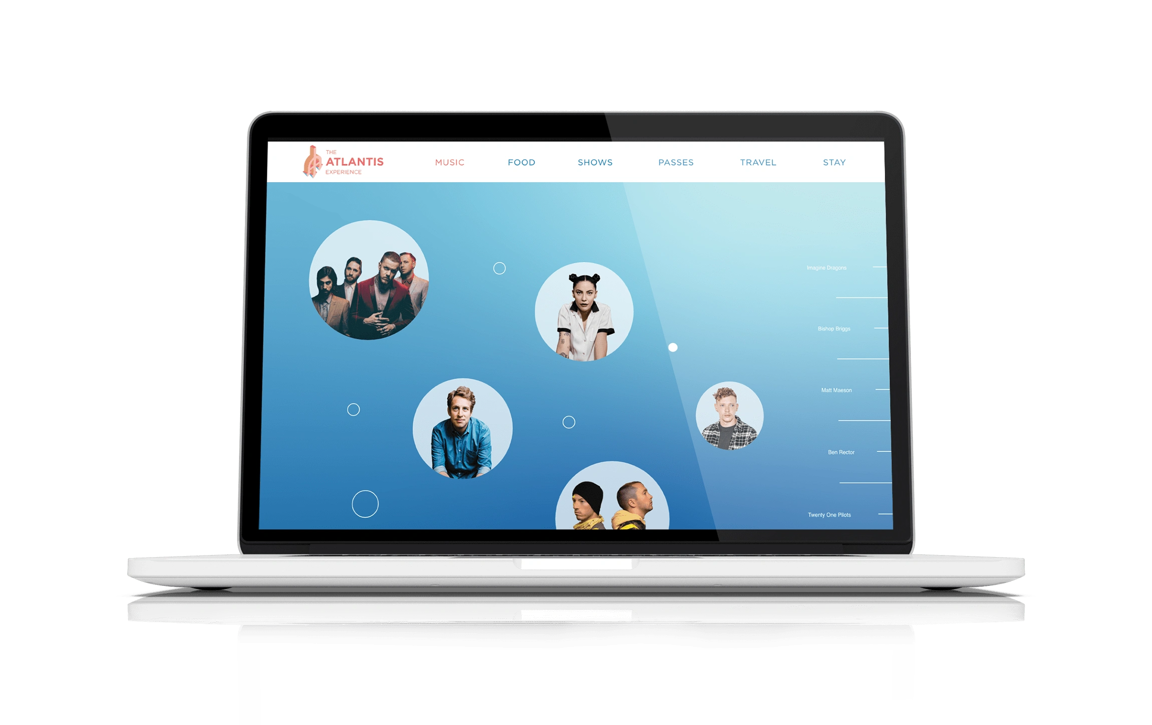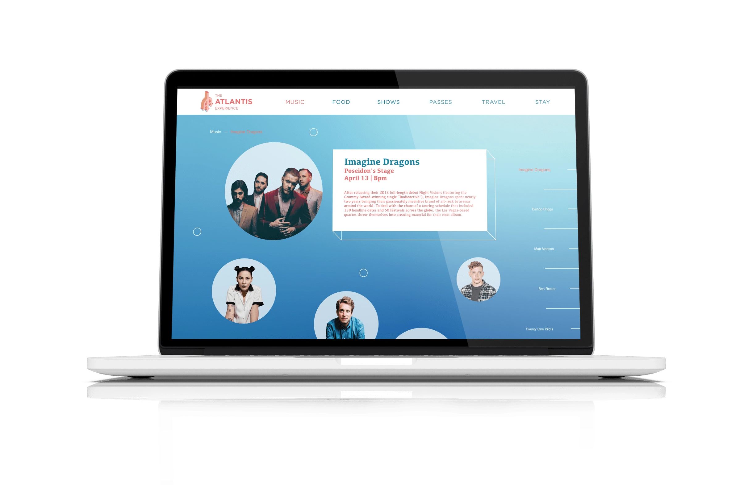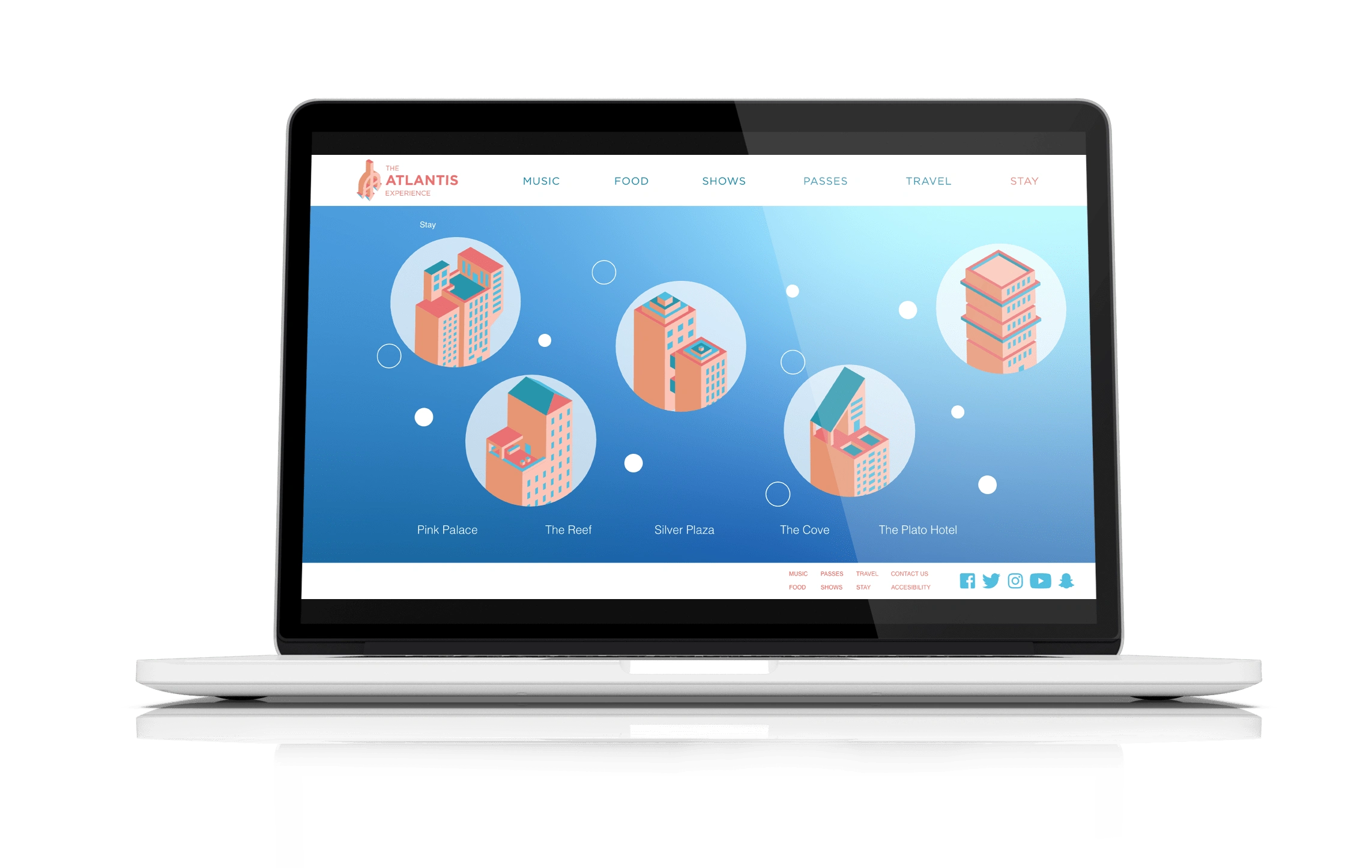 The Atlantis Experience is a fictional festival taken place in the mythical city of Atlantis. The website promotes and provides all the information needed to know to attend the fantastical, five day, festivities. Considering Atlantis is a fictional location, the website is largely illustrative and works with a color palette that works well for an underwater city and pays homage to the origin of Atlantis, Ancient Greece.