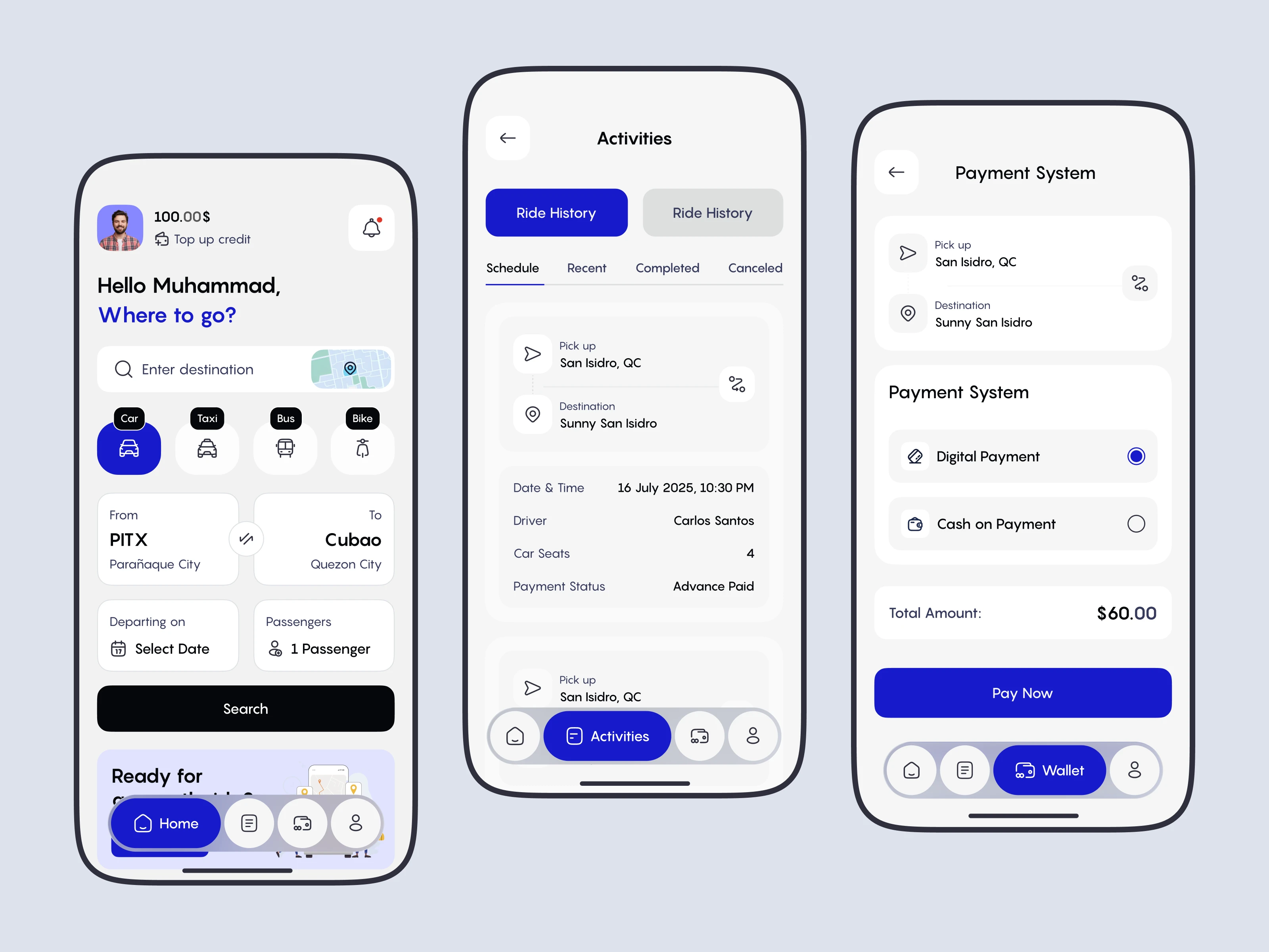 A modern ride-sharing mobile app UI designed to simplify booking, tracking, and paying for rides in one seamless experience. The interface focuses on clarity, ease of use, and fast interactions—allowing users to choose transport types, set pickup and destination points, review ride history, and complete secure payments effortlessly.