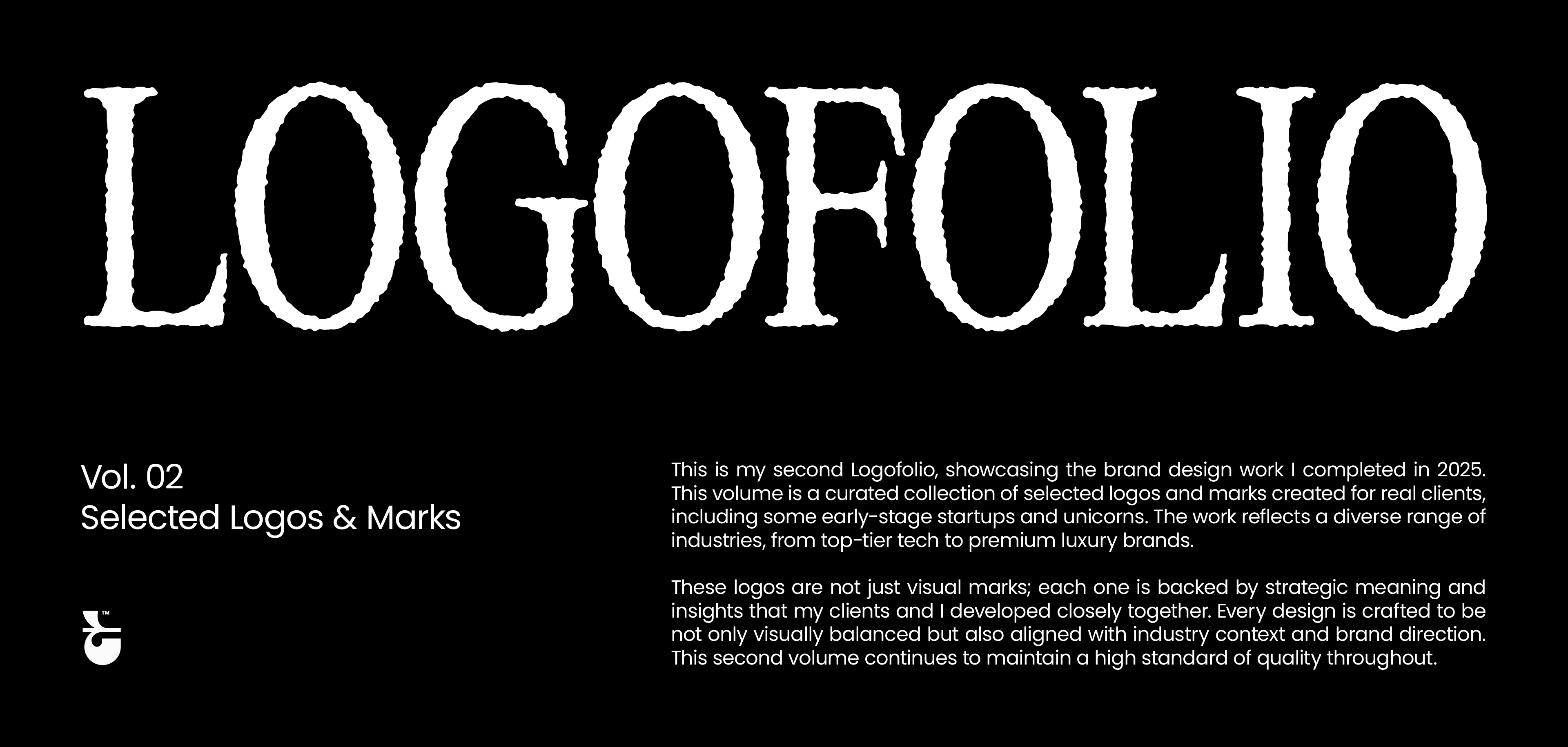 This is my second Logofolio, showcasing the brand design work I completed in 2025. This volume is a curated collection of selected logos and marks created for real clients, including some early-stage startups and unicorns. The work reflects a diverse range of industries, from top-tier tech to premium luxury brands. These logos are not just visual marks; each one is backed by strategic meaning and insights that my clients and I developed closely together. Every design is crafted to be not only visually balanced but also aligned with industry context and brand direction. This second volume continues to maintain a high standard of quality throughout.