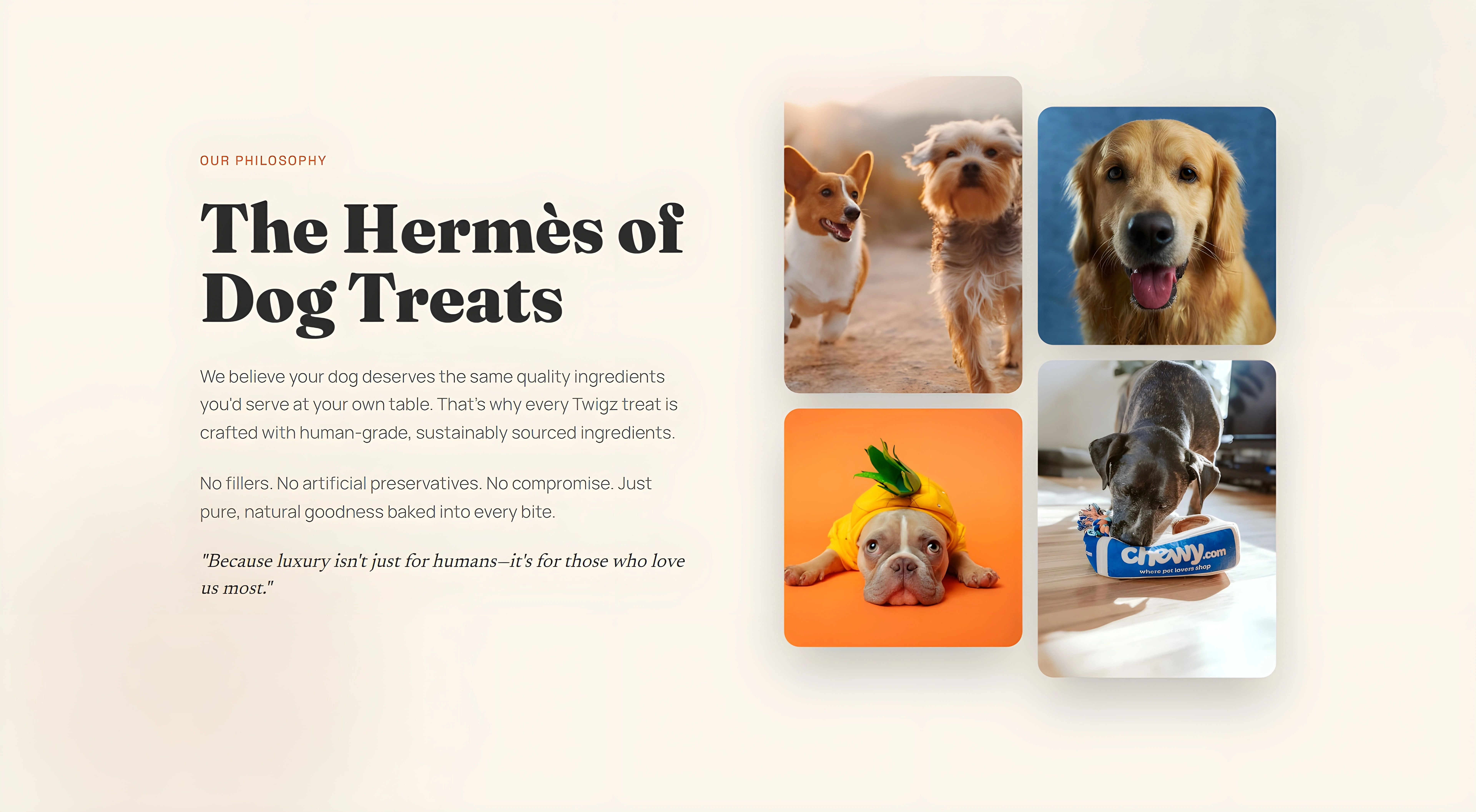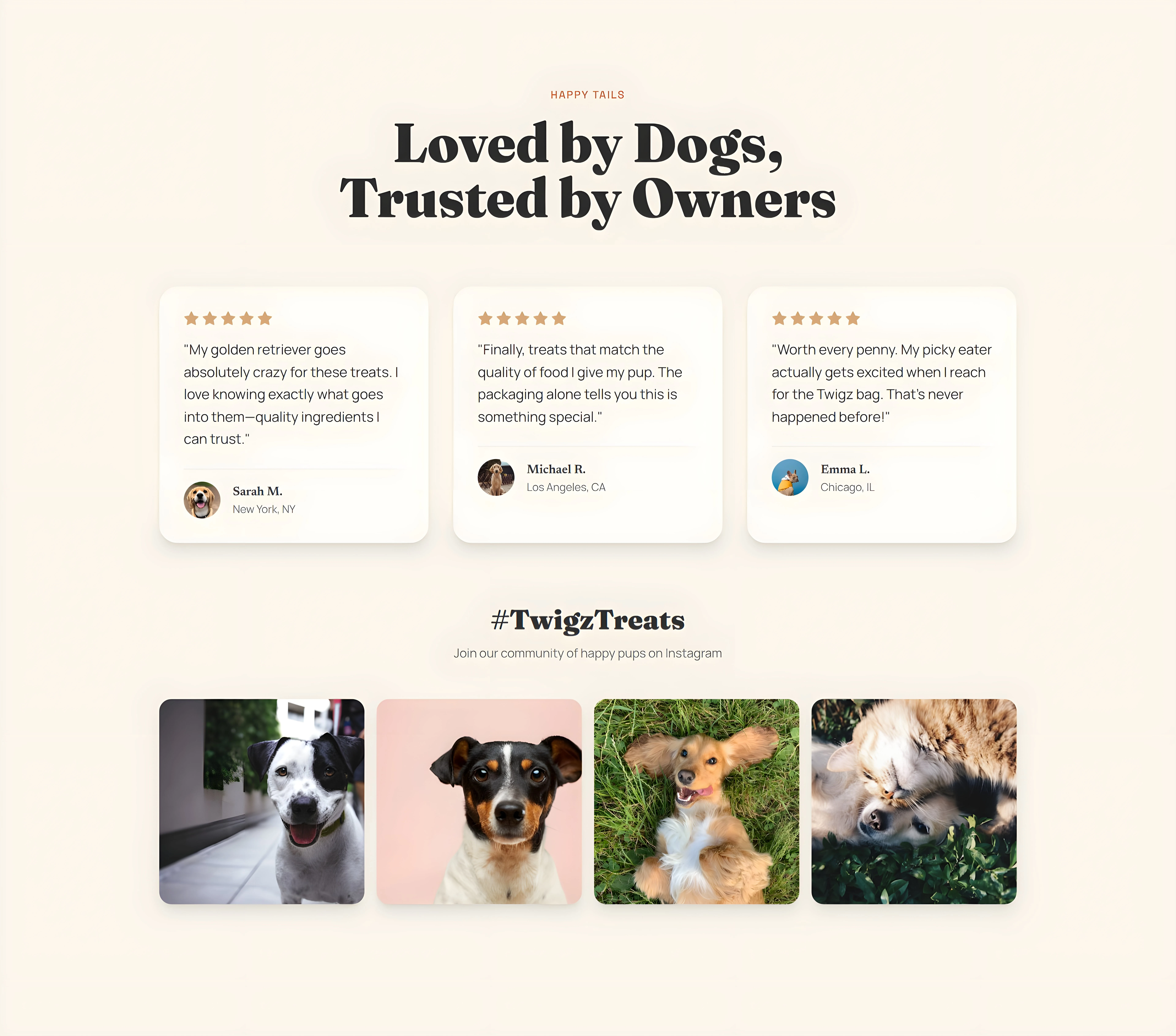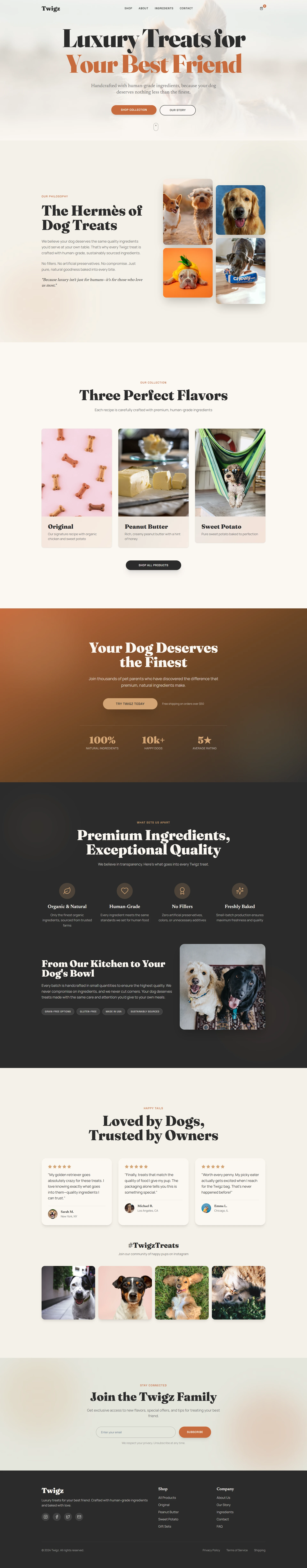 I designed the Twigz website to highlight its premium, human-grade dog treats through a clean, warm design that reflects quality, trust and natural ingredients.