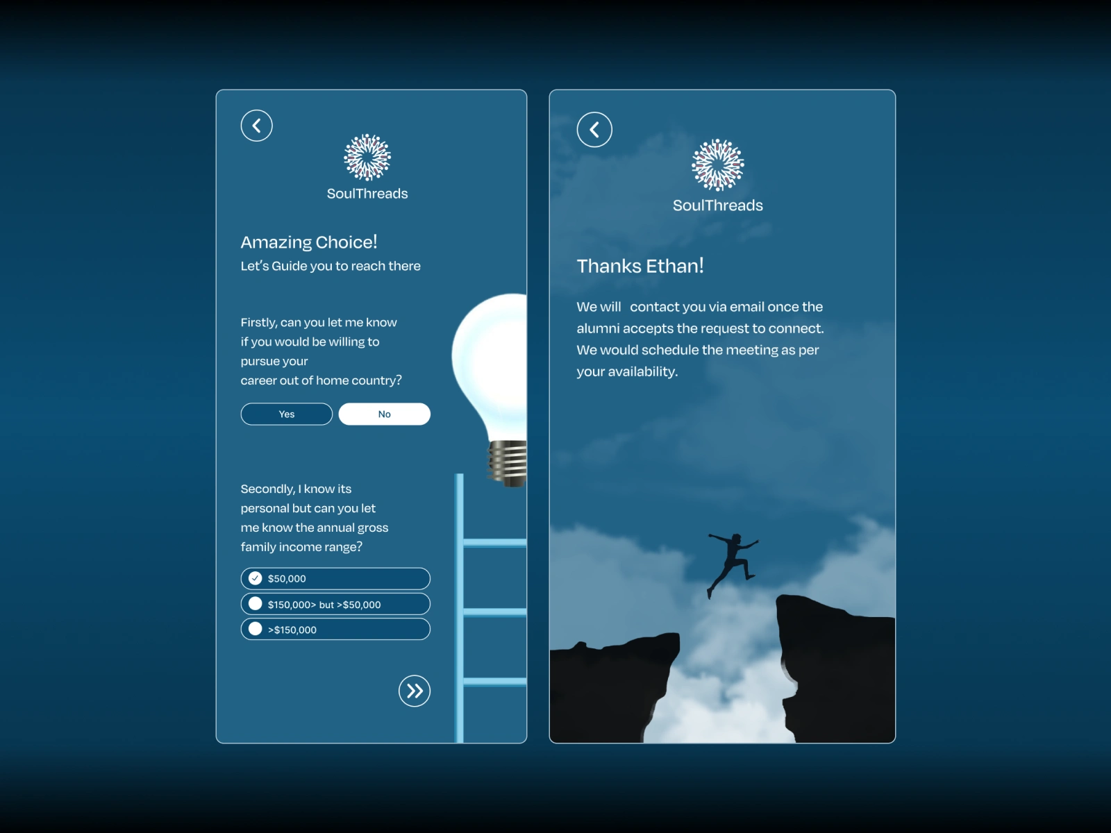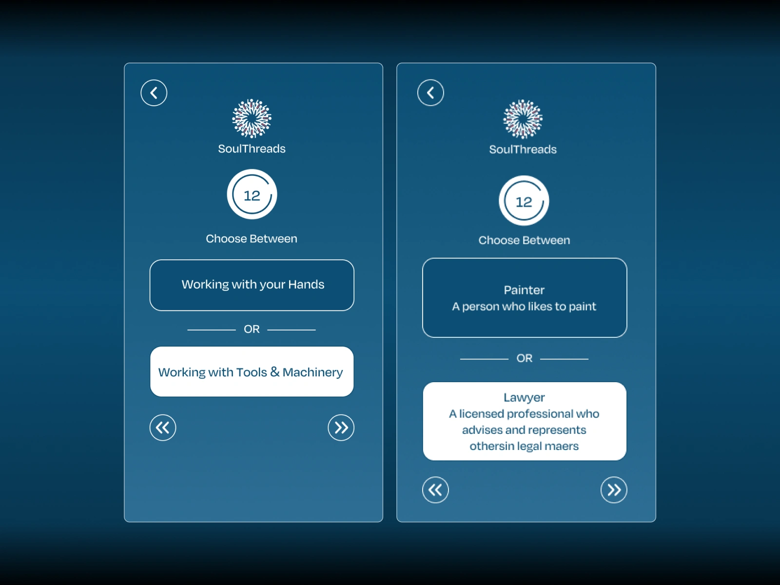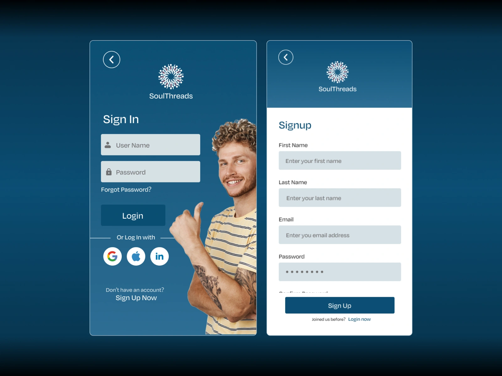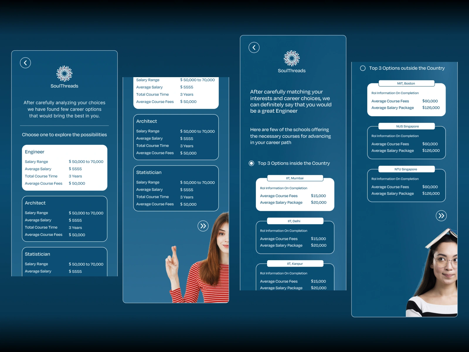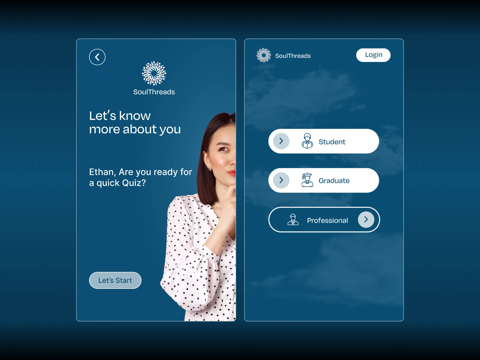 Designed Soulthreads app UI for personalized career guidance. Sleek, futuristic mobile interface with smooth navigation for students, grads, and pros.