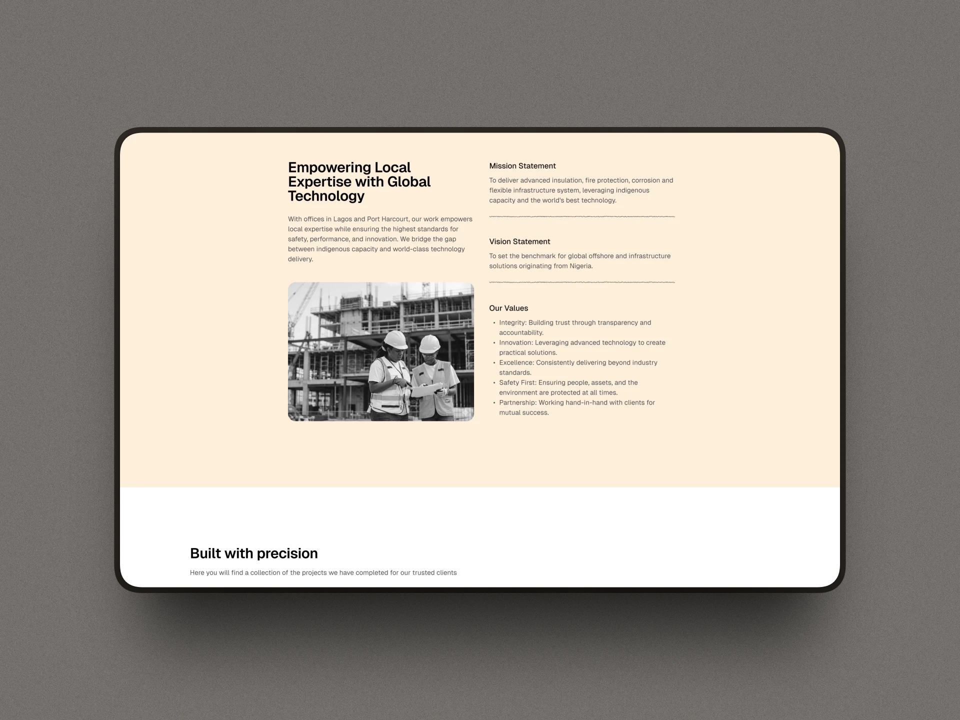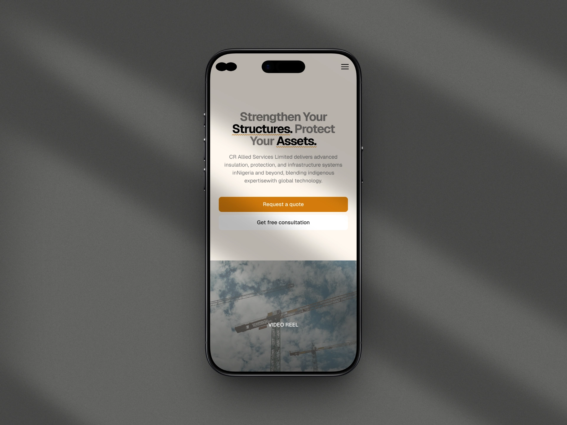 Landing page for a construction company redefining infrastructure standards through world-class construction, protection, insulation, and integrated infrastructure solutions across Nigeria and beyond.