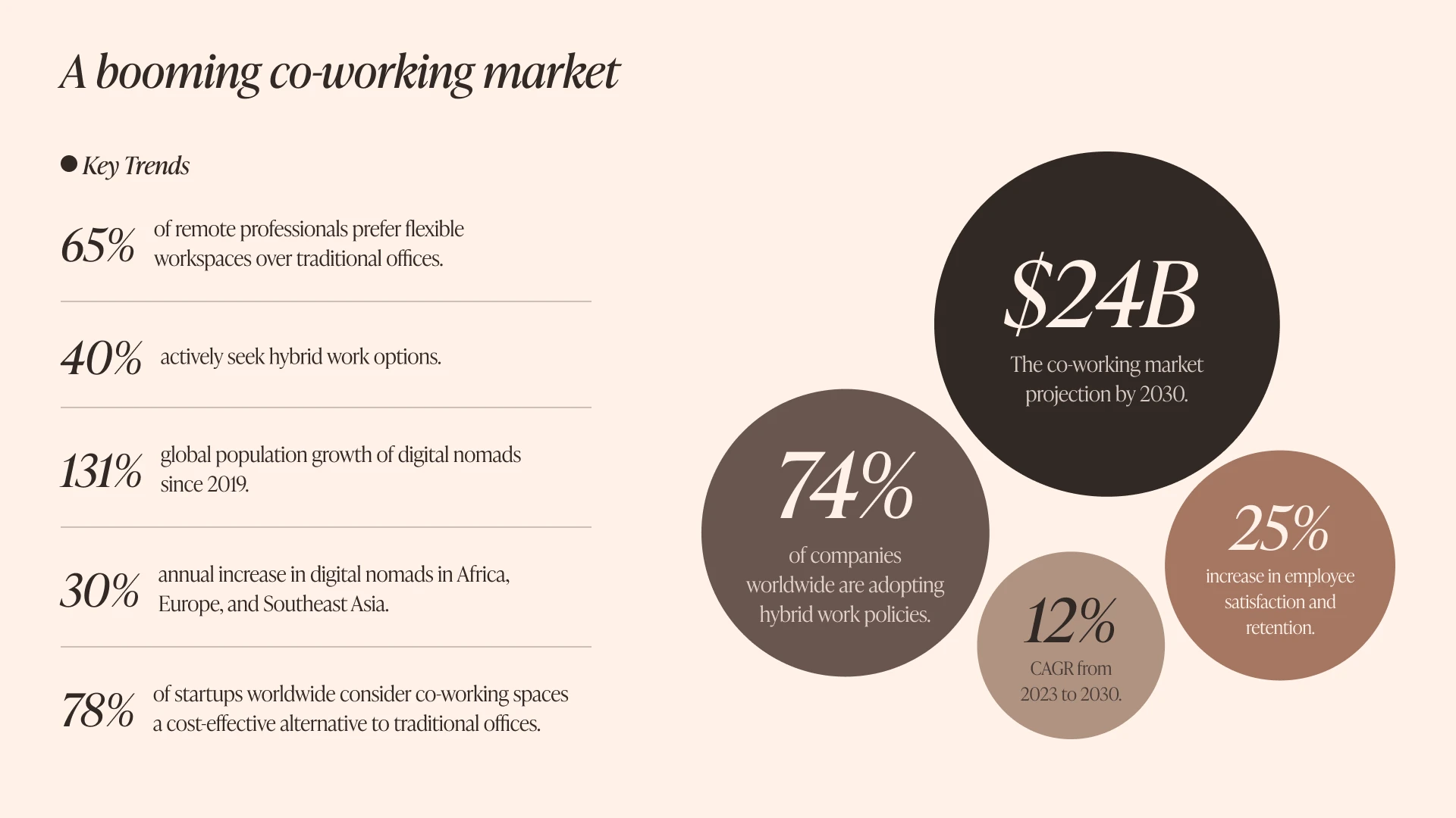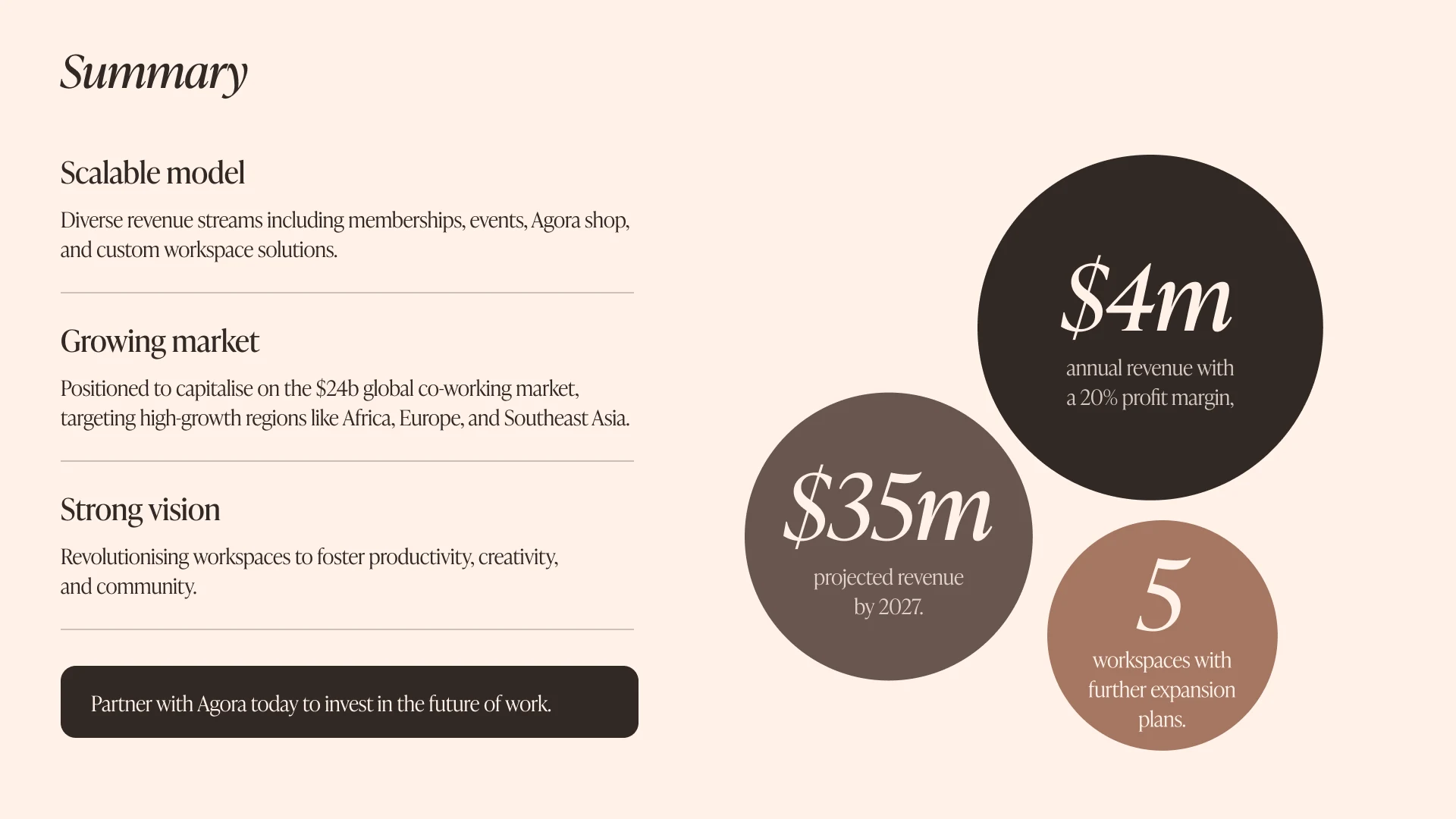 The Agora Pitch Deck was designed to communicate vision with clarity and conviction. I translated Agora’s brand system into an investor-facing narrative that balances data and design—highlighting market opportunity, growth strategy, and impact with precision. Through clean layouts, thoughtful hierarchy, and confident visual storytelling, the deck positions Agora as a credible, global leader in the workspace industry while inspiring trust and excitement among investors.