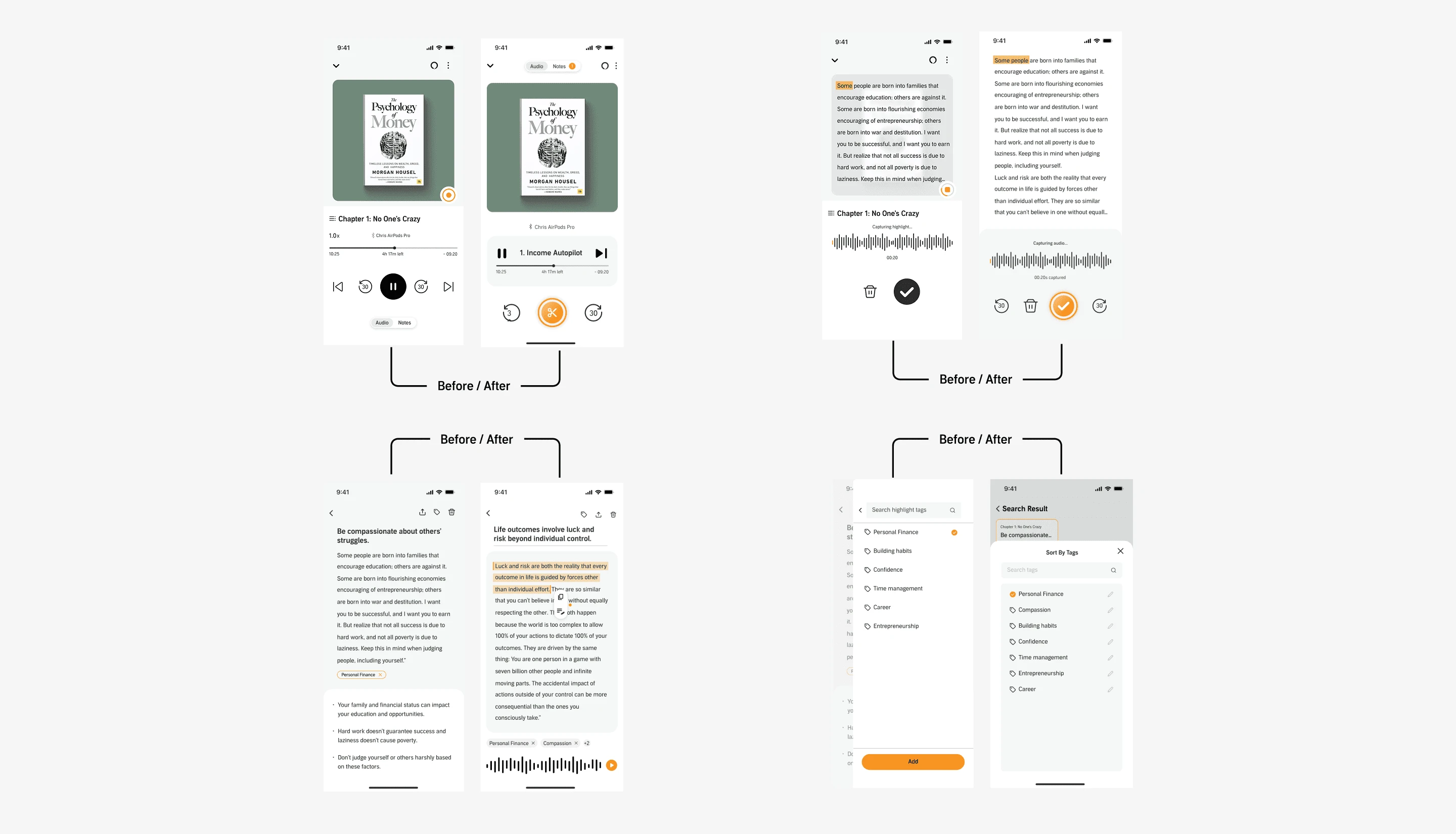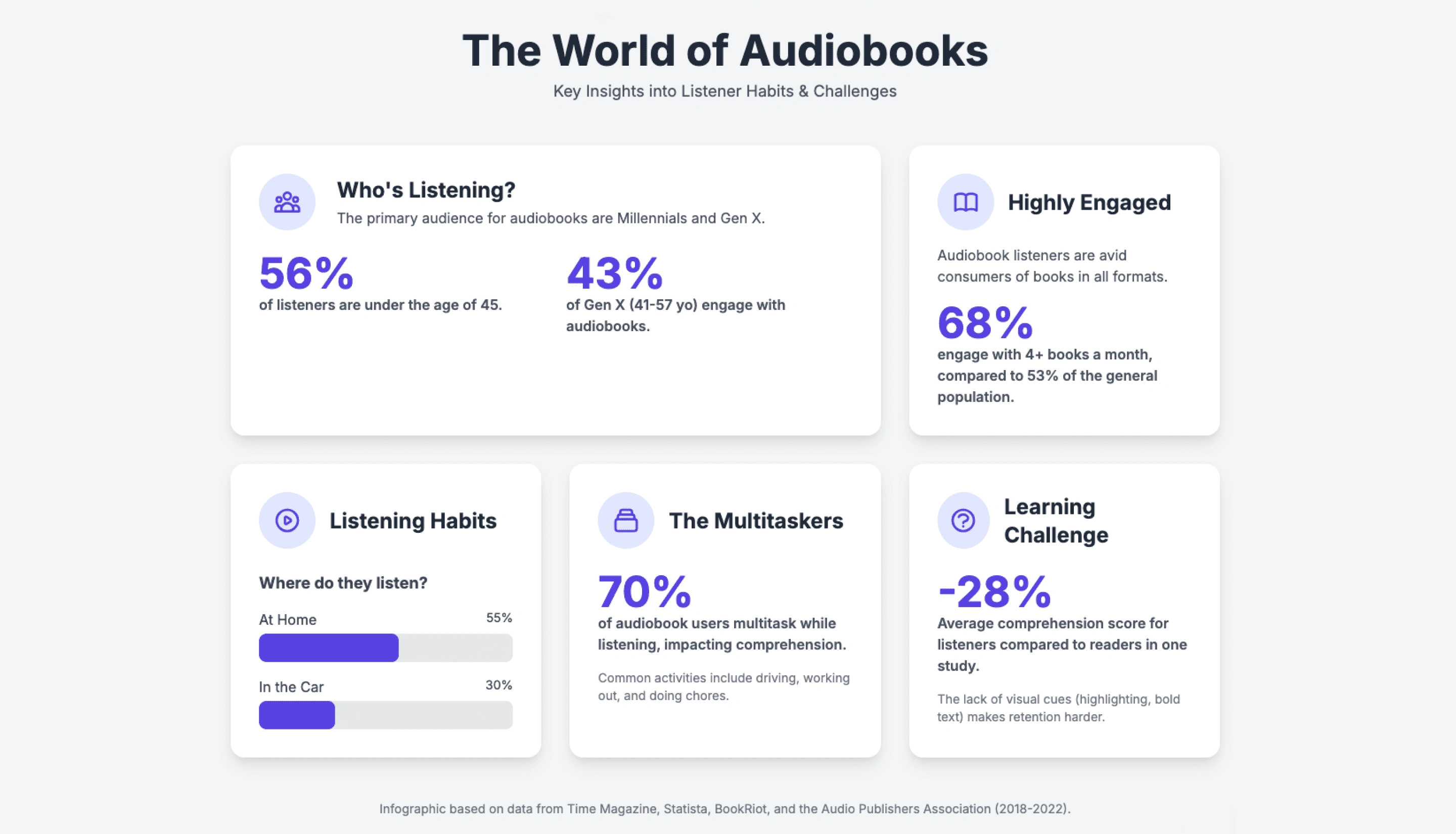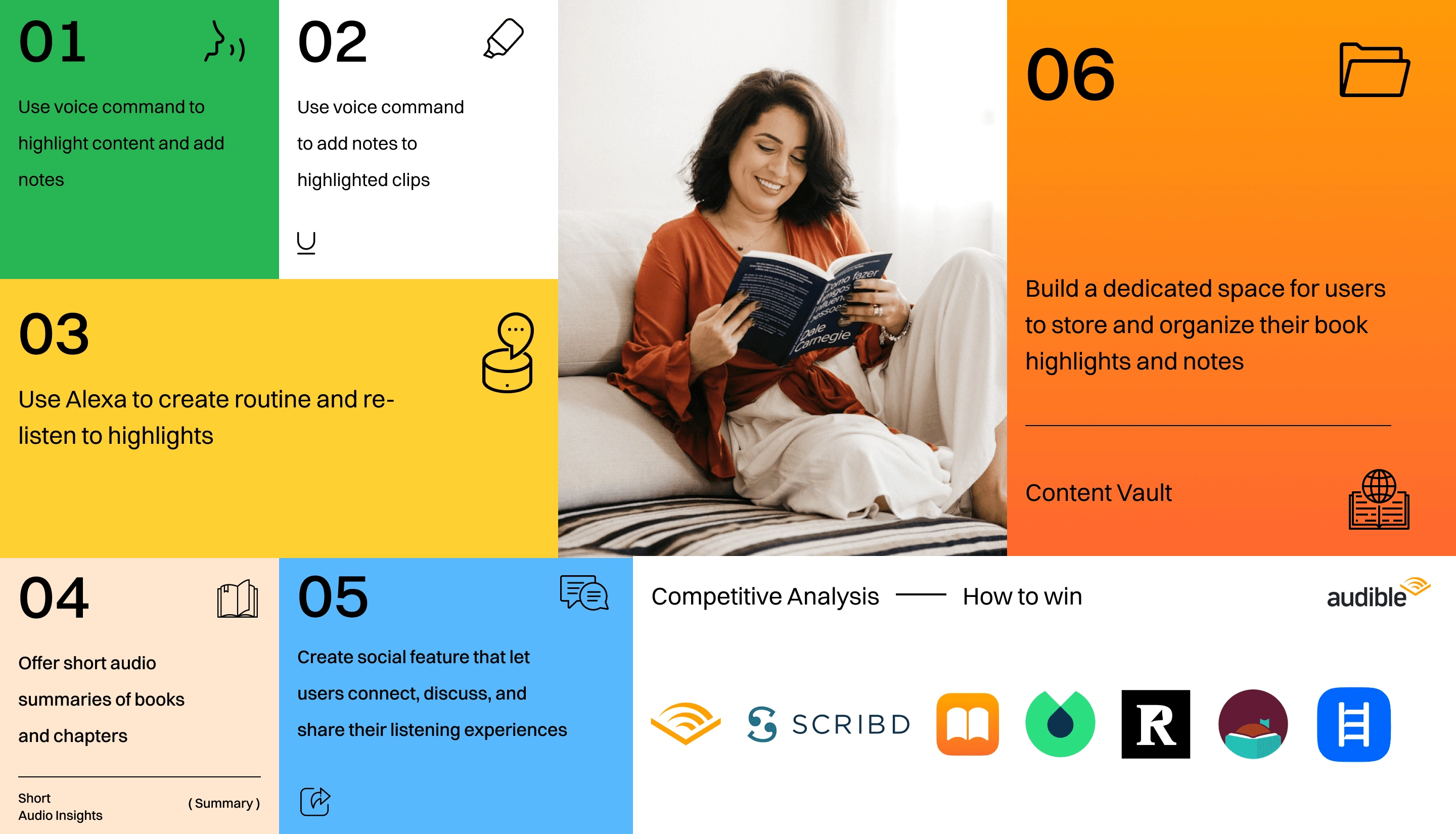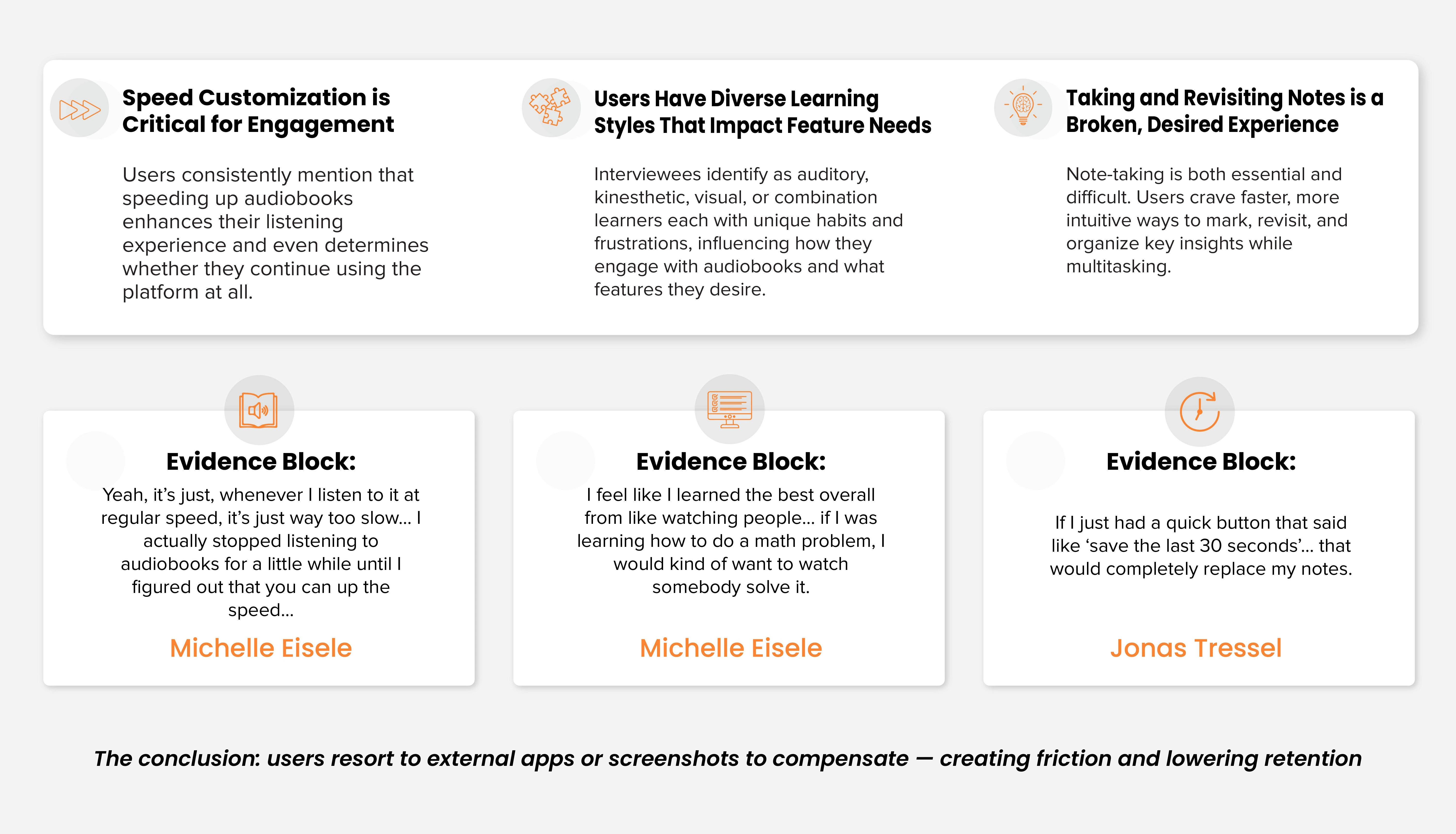 I evaluated both direct (Apple Books, Libby, Scribd) and indirect competitors (Blinkist, Headway, Rewise) to uncover feature gaps and positioning opportunities for Audible. By mapping strengths and weaknesses across each product, I identified where Audible could stand out and add the most user value.