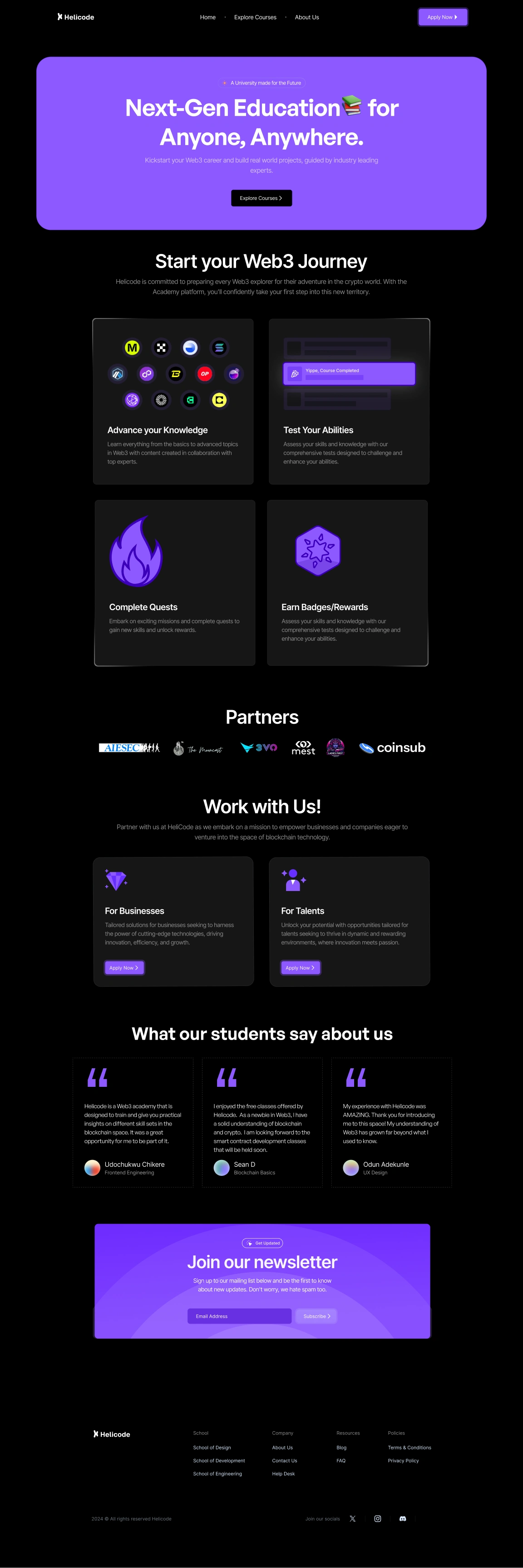 Hellocode approached me to design their comprehensive Web3 education platform after recognizing the need for accessible blockchain education in an increasingly complex digital landscape. As the lead designer, I was tasked with creating an intuitive, engaging platform that would make Web3 technologies approachable for learners at all levels while maintaining the technical depth required for professional development.