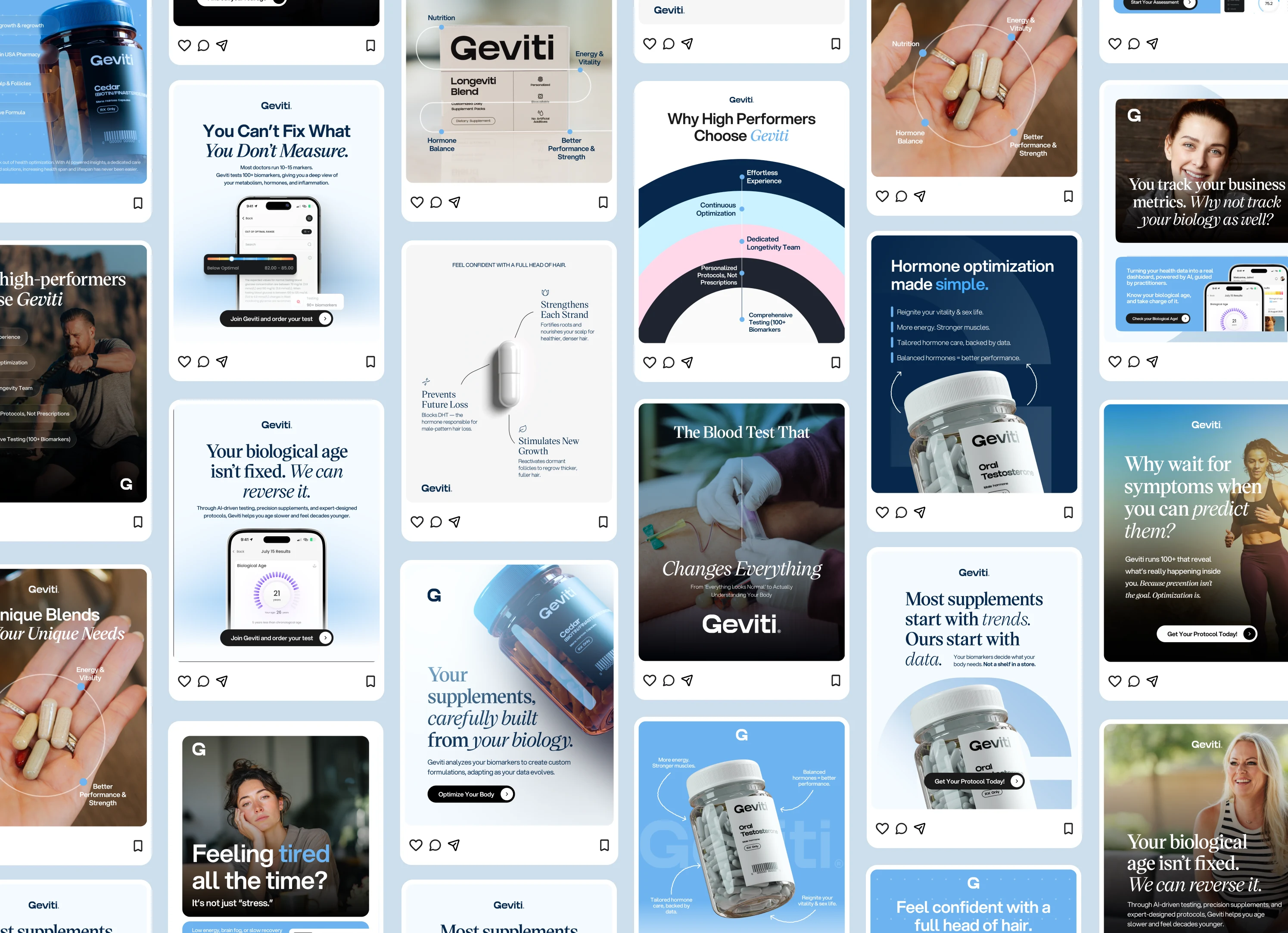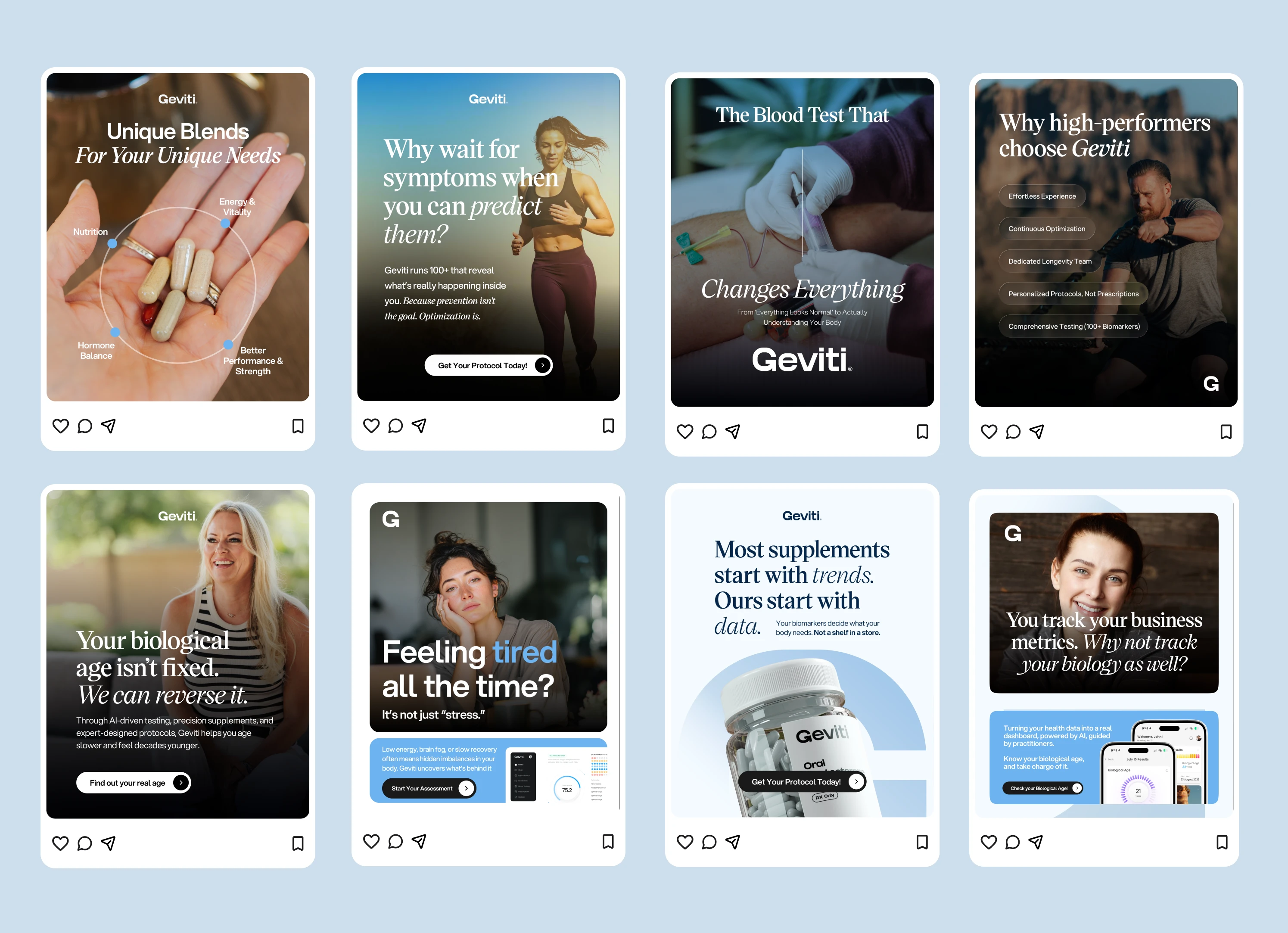 Geviti needed a consistent, high-performing ad creative system to support paid campaigns across Meta and Instagram, while testing multiple creative angles without losing brand cohesion.