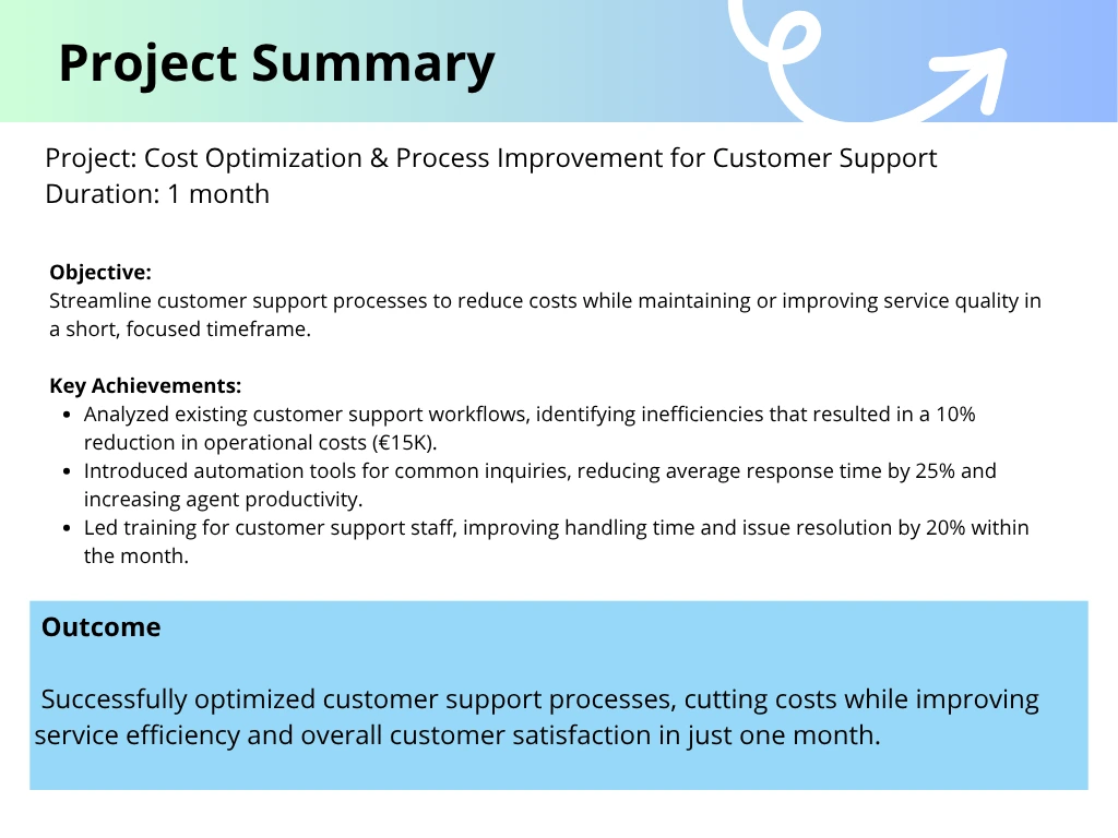 Reduced customer support costs by 10% (€15K), improved response time by 25%, and boosted productivity by 20% through process optimization in 1 month.