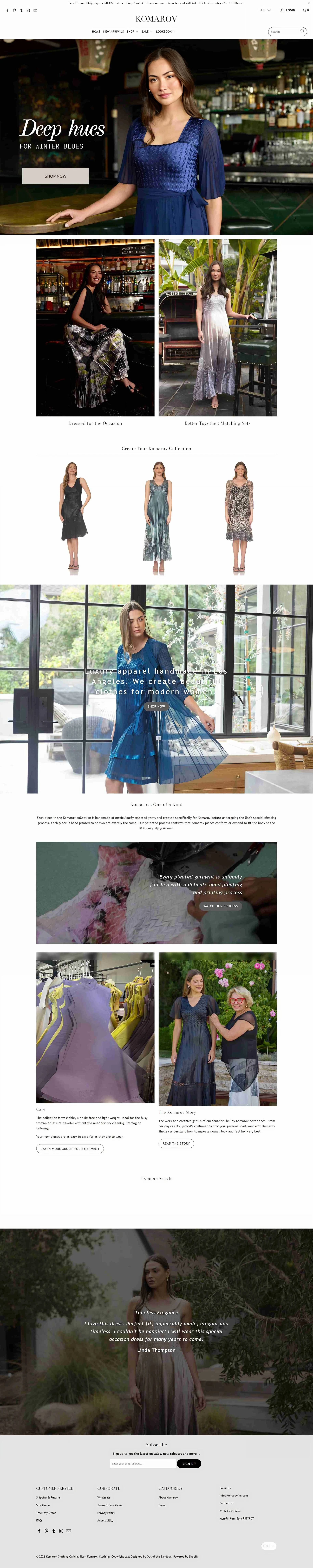 Komarov Clothing, a bespoke fashion house specializing in hand-pleated, made-to-order garments. The platform bridges artisanal craftsmanship with modern retail, featuring a high-conversion Shopify architecture, custom product filtering, and an elegant visual narrative that reflects the brand's Hollywood costume design heritage.