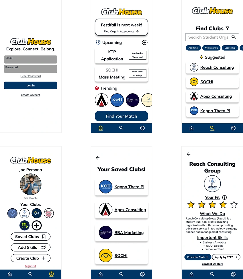 This is ClubHouse, a personal project of mine from a while back with the goal of making the club search easier for students at the University of Michigan. While I couldn't fit all of the frames in here, here is the link to the final prototype if you want to check out how it functions and the different designs: