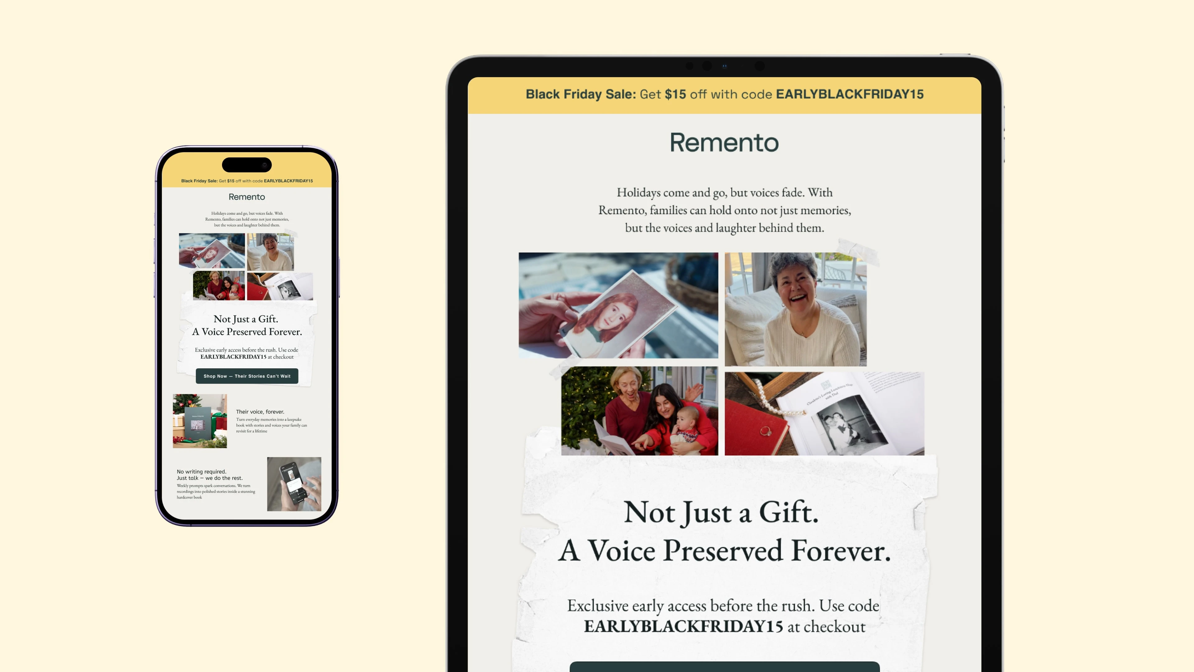 Testing emails(mobile/ web responsive) that highlights Remento’s emotional value while keeping a clear sales focus. Email balances emotional storytelling with clear conversion goals, combining warm imagery, heartfelt copy, and bold CTAs that highlight Remento’s Early Black Friday offer. Designed to be fully responsive across web and mobile, the layout maintains clarity, readability, and visual warmth on any screen, ensuring a seamless experience that feels both human and conversion-driven.
