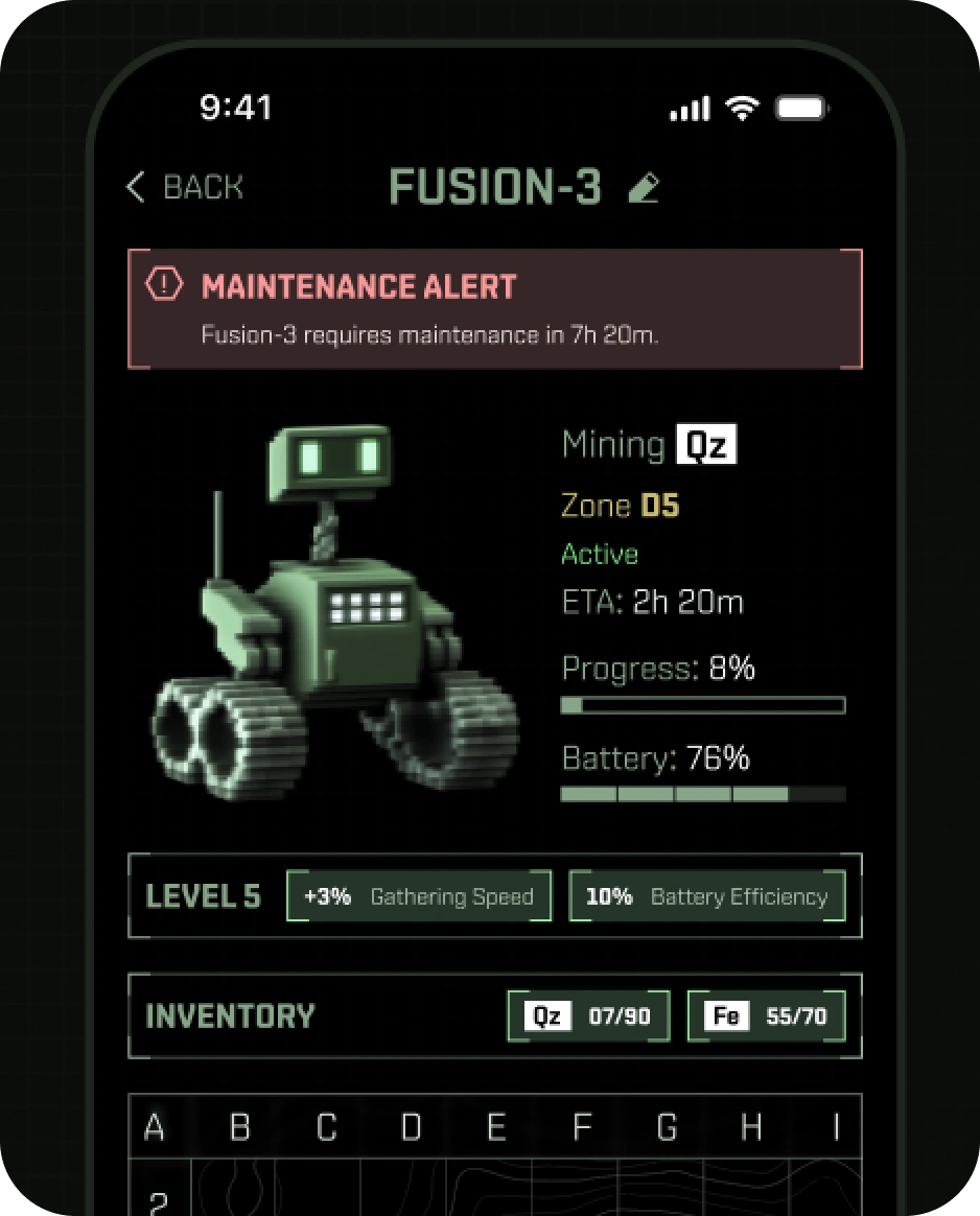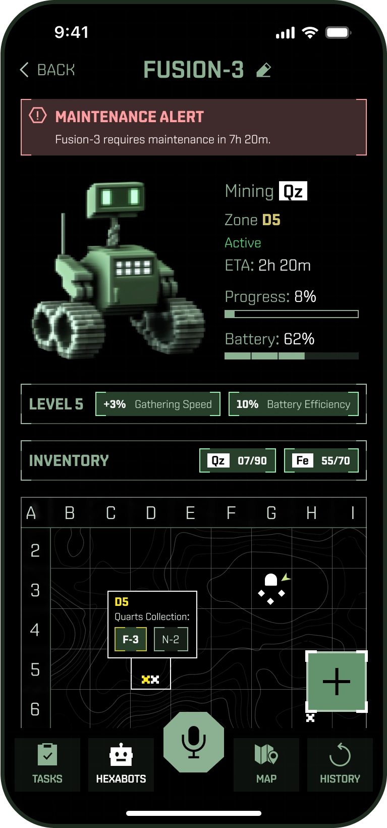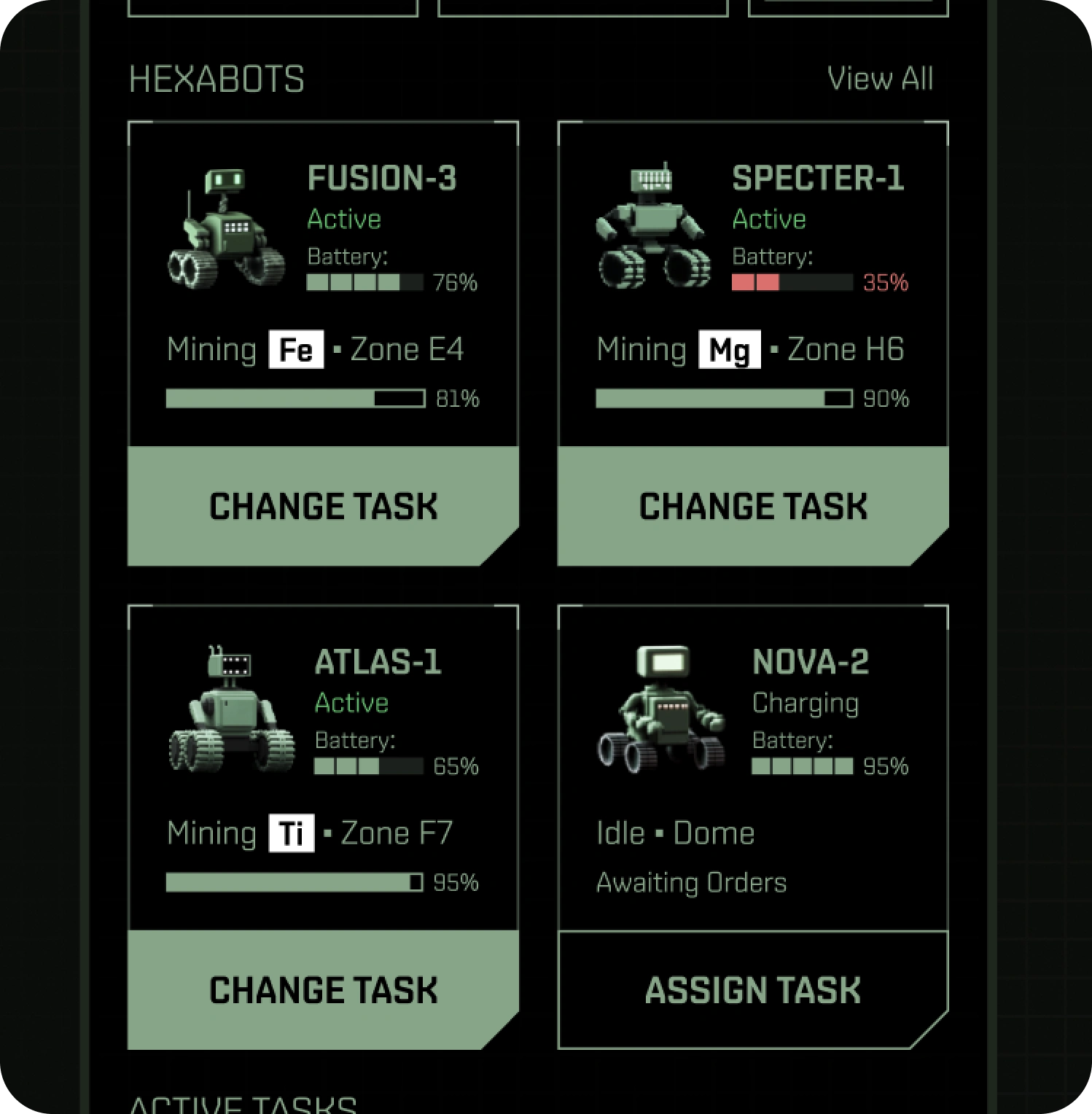 Assign one or more robots to collect minerals fast. Track them on a square grid map. Keep the UI usable with gloves and a foggy helmet visor. Serve two audiences: researchers and families.