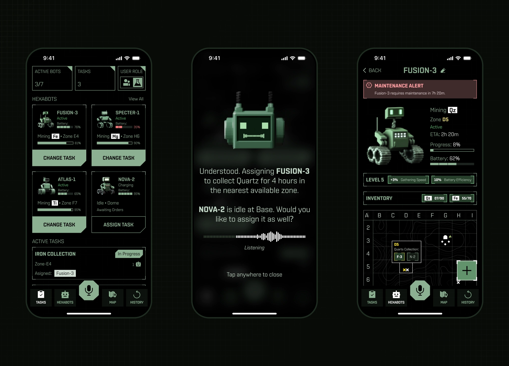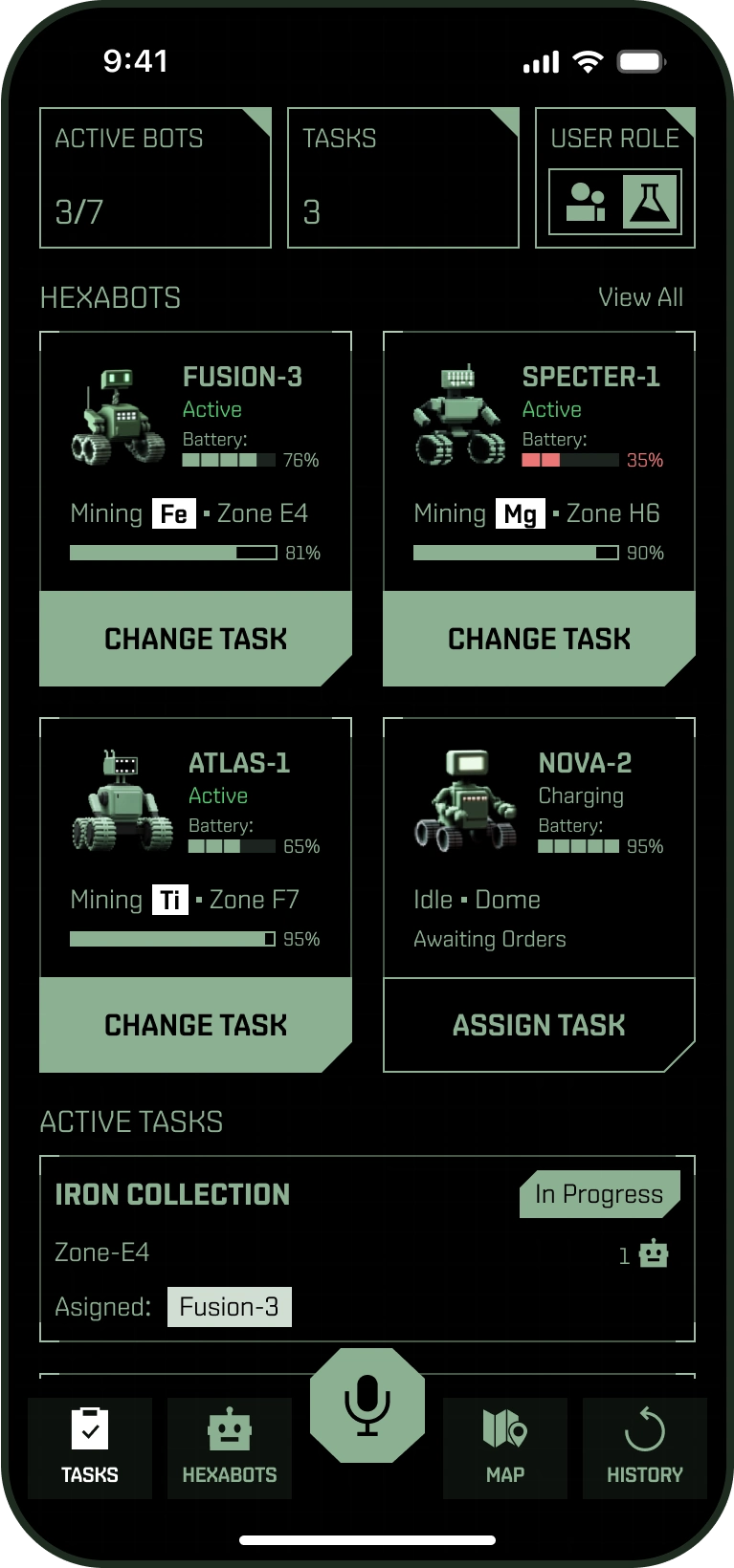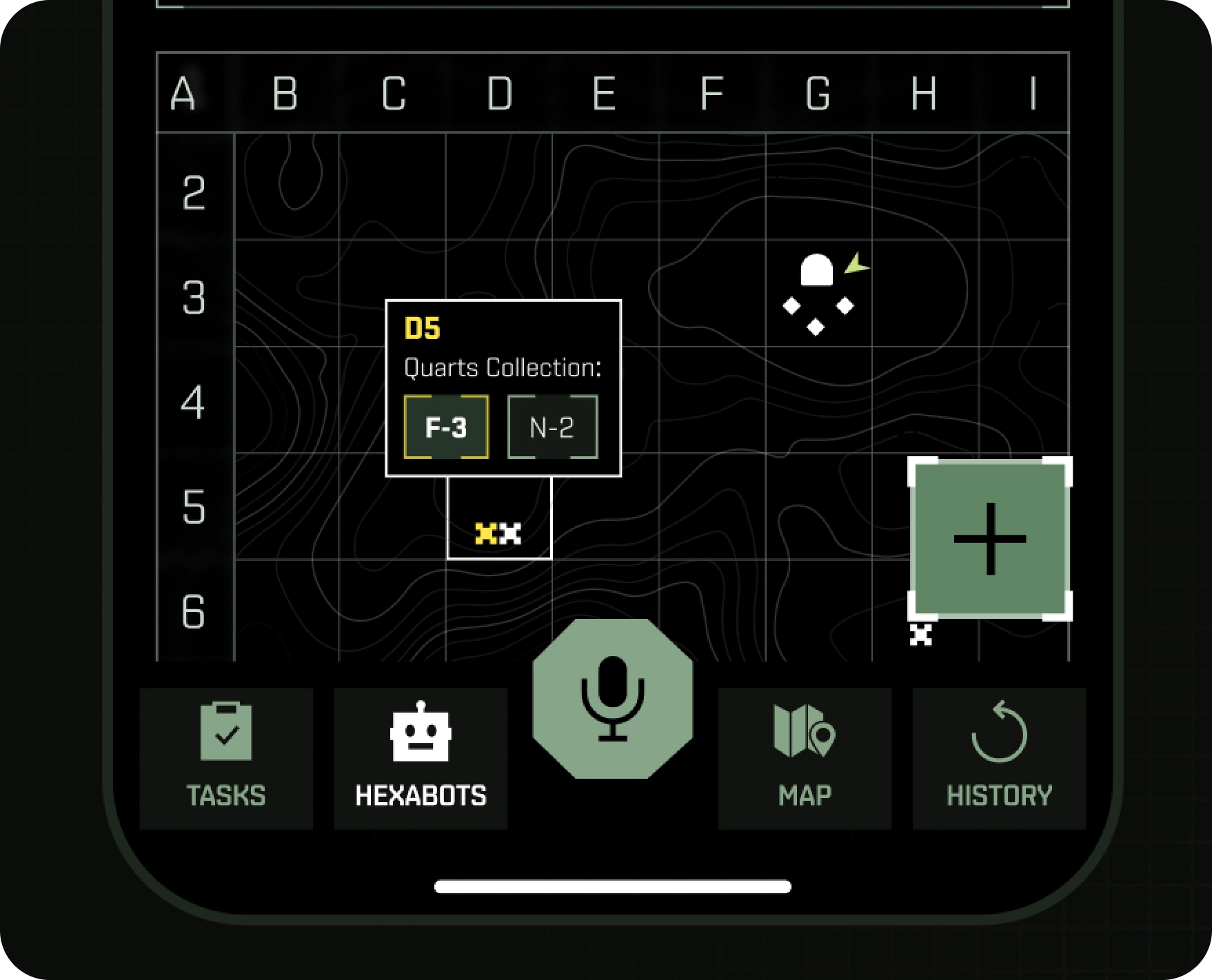 Assign one or more robots to collect minerals fast. Track them on a square grid map. Keep the UI usable with gloves and a foggy helmet visor. Serve two audiences: researchers and families.