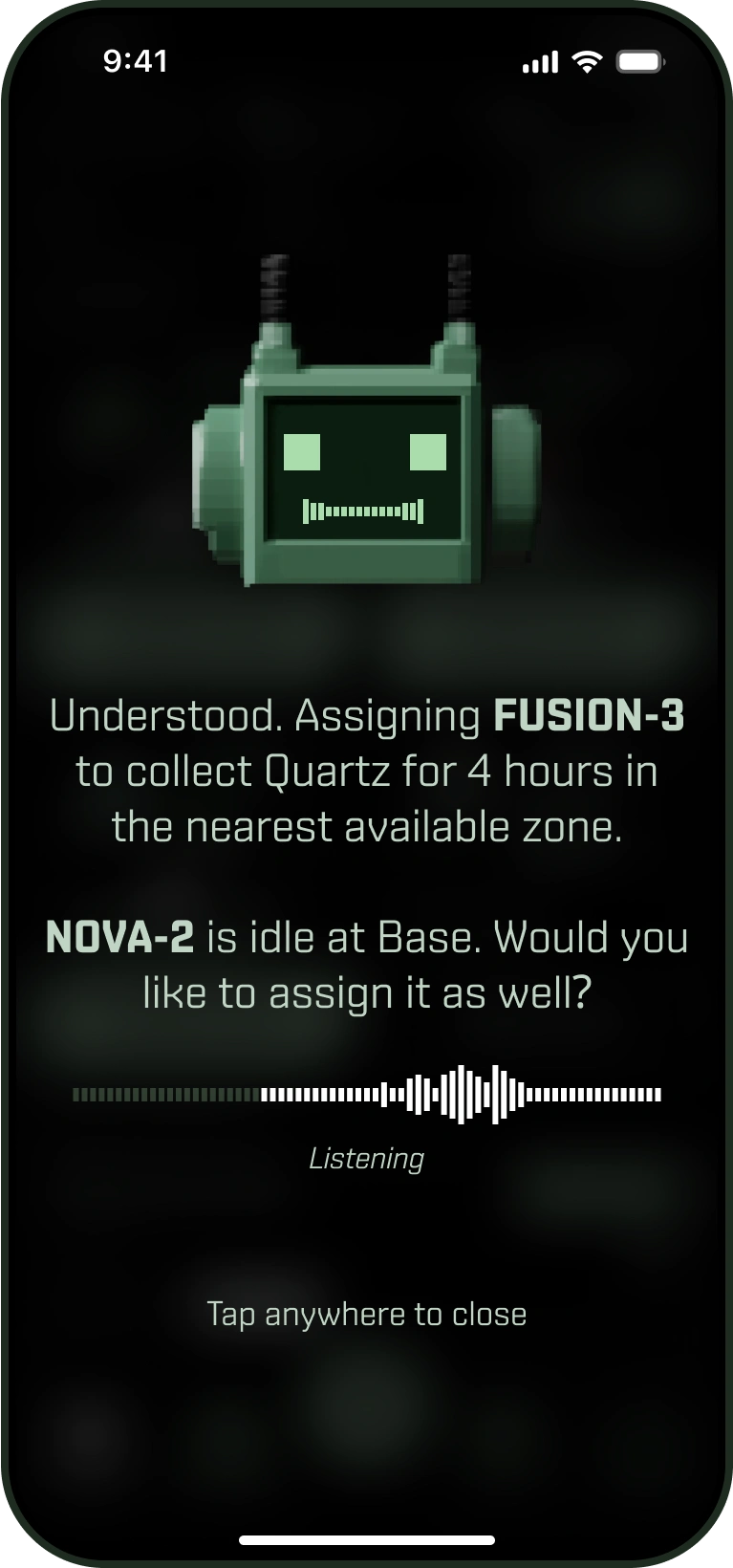 The assistant hears the command to collect Quartz for 4 hours in the nearest zone and opens a compact overlay.
