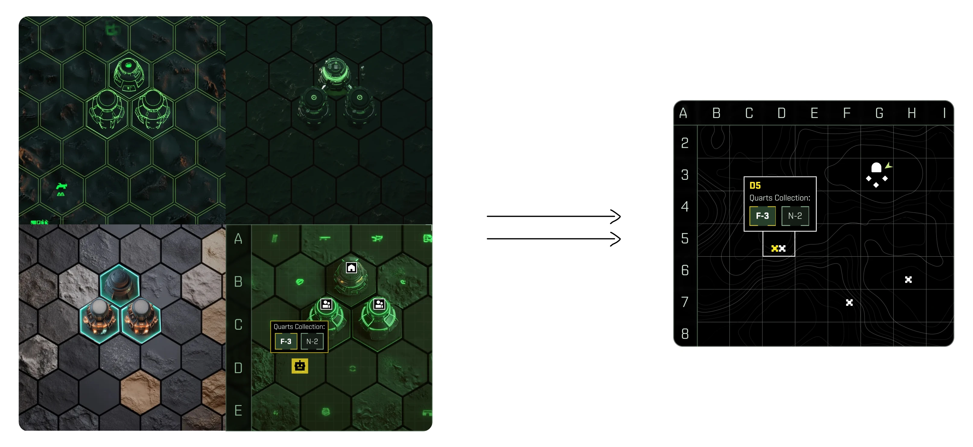 Hex map looked thematic but increased cognitive load. Replaced with a square grid.