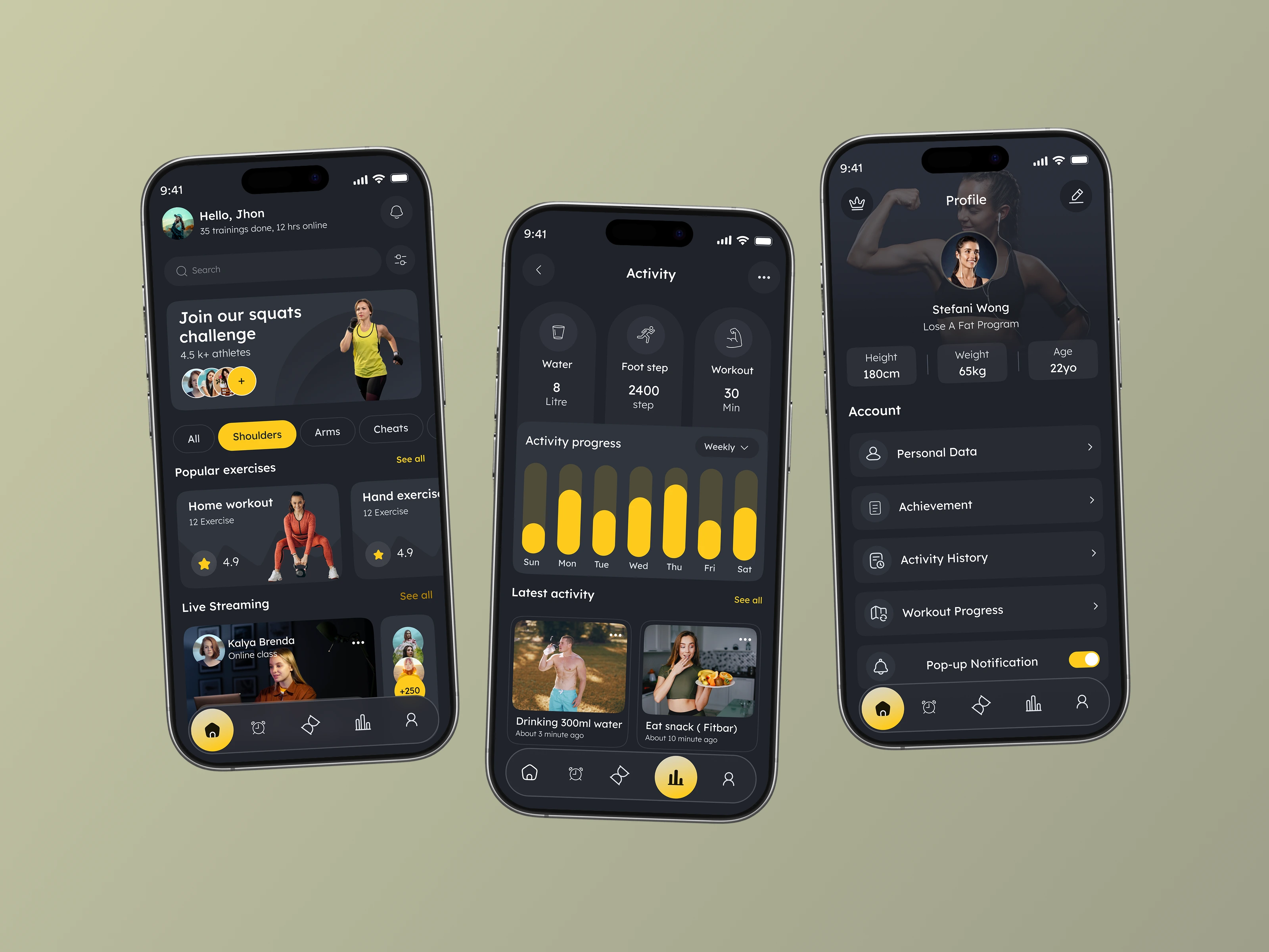 Enjoy my latest mobile exploration about Fitness Apps. It consists 3 screens, there are Home screen; Activity screen; and profile page.