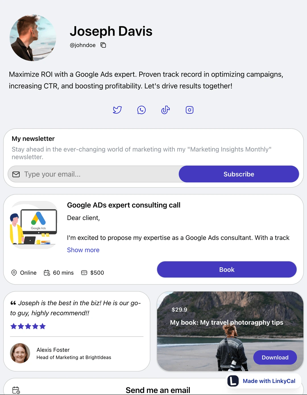 Clean and branded booking page with smart calendar, payments and reminders, right on the same link. Manage your page and availability and clients on the same tab.