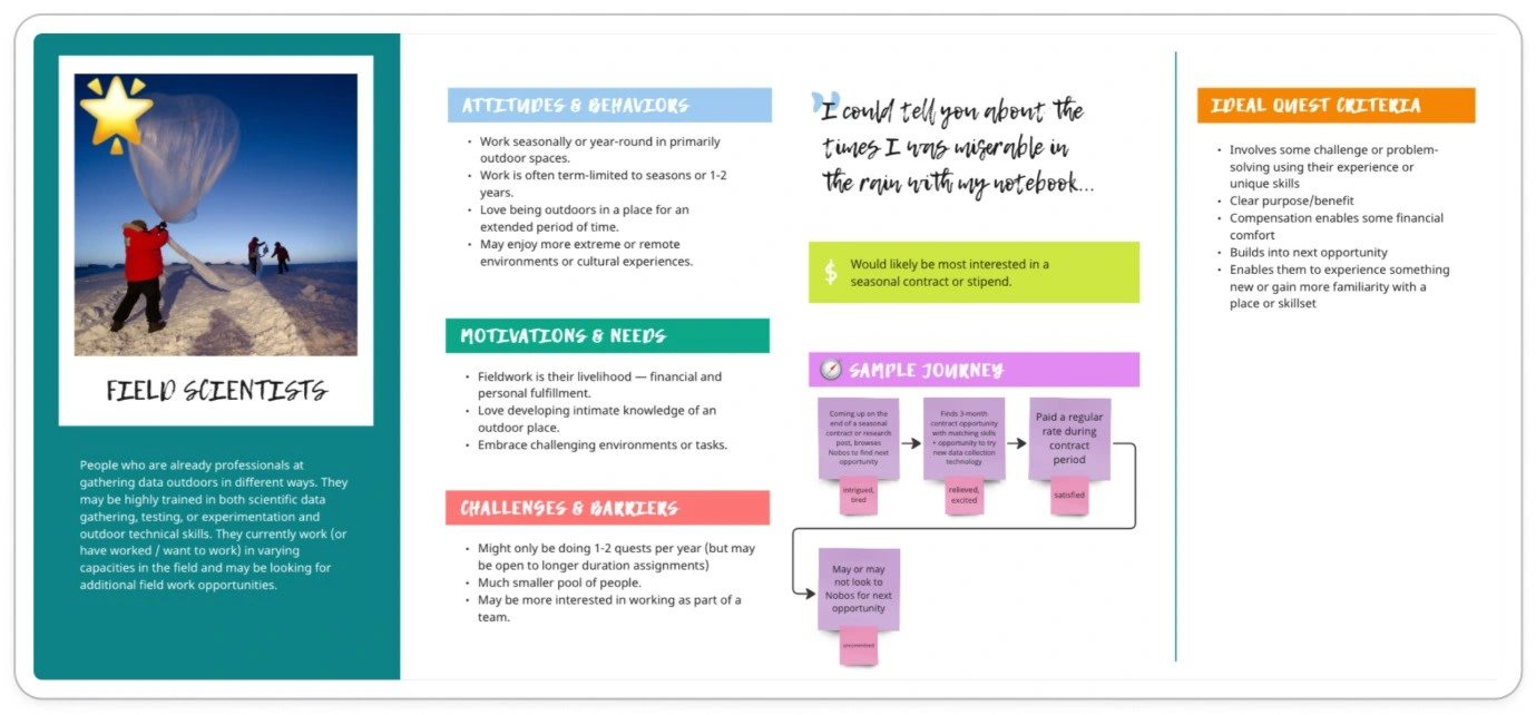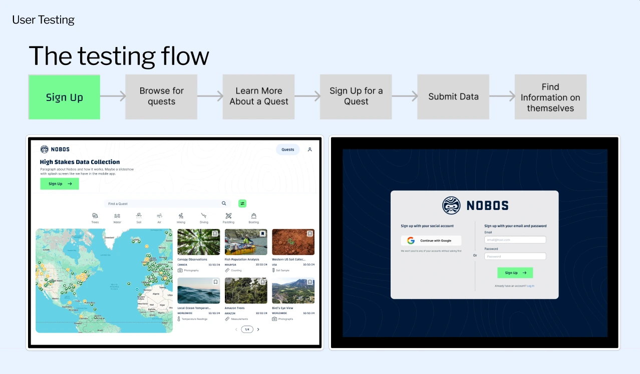 Design a web app for an environmental data collection marketplace for freelance scientists. Use the user research that has been carried out to inform your designs. Test your designs with real users. Design marketing collateral including social media posts, an email template, a one-pager, diagrams explaining Nobos, and more.