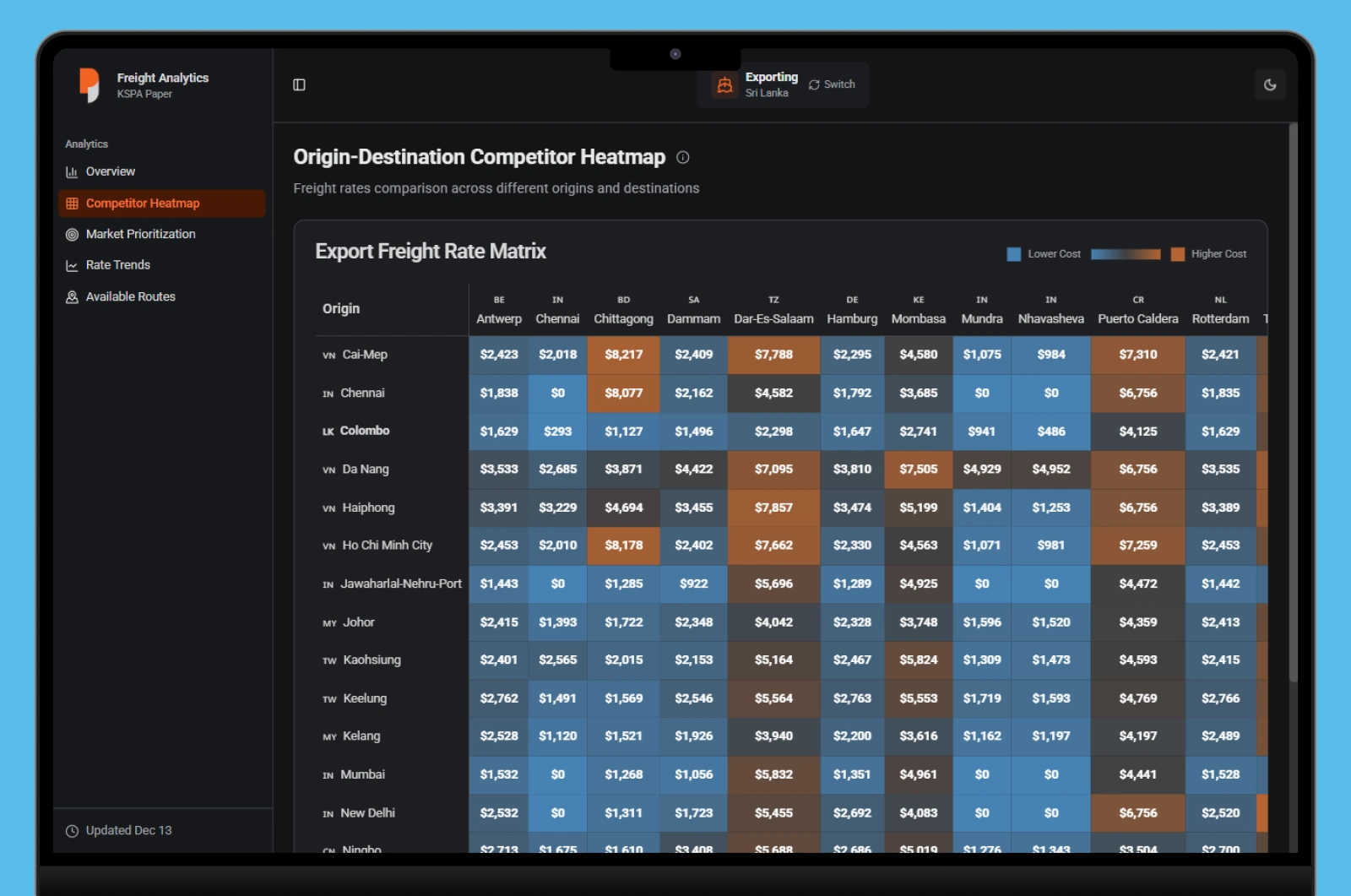 Market Heatmaps: An intuitive UI that instantly highlights which global destinations offer the best "landed-price" competitiveness.
