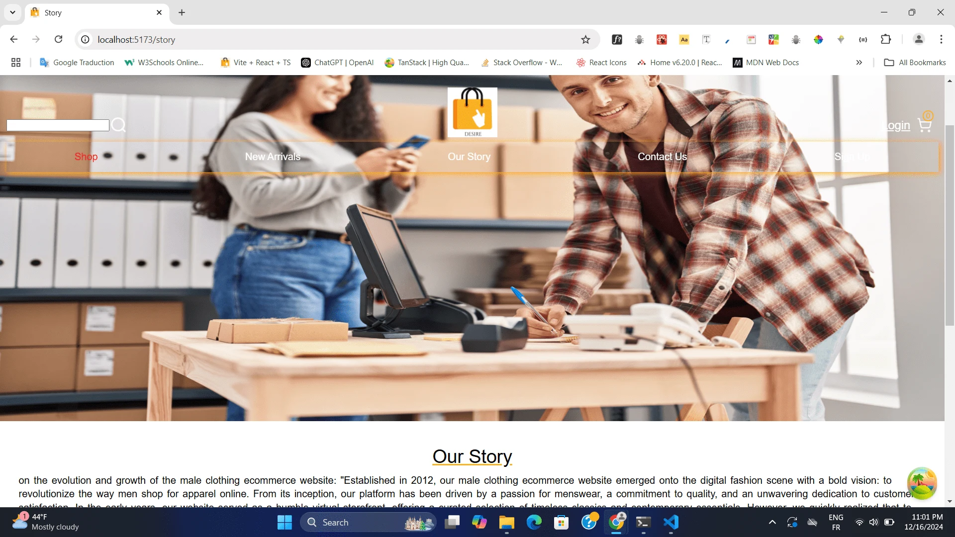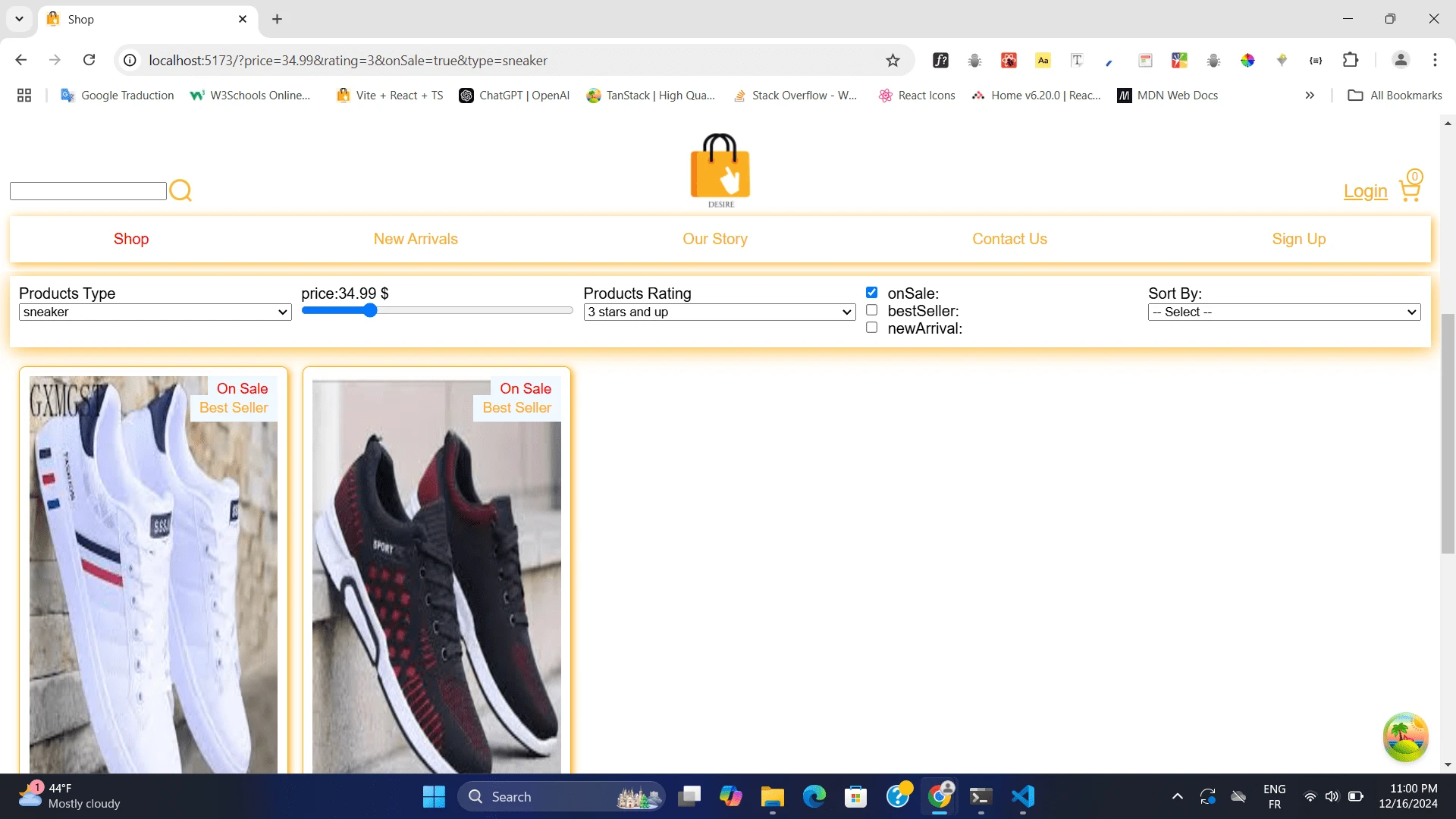 The homepage features a dynamic filter bar, enabling users to refine their searches by product type, price range, and product rating. It also includes checkboxes for filtering items based on categories such as On Sale, Bestsellers, and New Arrivals, as well as a sorting feature to arrange products by price from low to high or vice versa. The site also offers essential pages like Contact Us, Our Story, Terms and Conditions, Privacy Policy, Cookies, and a dedicated section for account management.