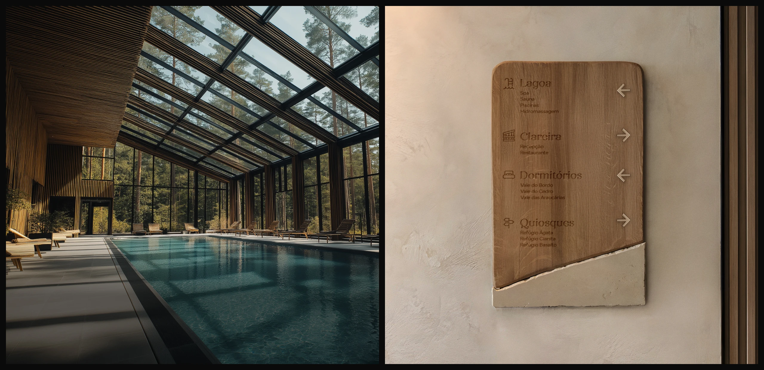 The reception and restaurant were named Clareira — the first open space within the forest. The accommodations, distributed across the Vale das Araucárias, Vale do Bordo, and Vale do Cedro blocks, evoke geography and native vegetation. The spa and wellness area was named Lagoa, in reference to its association with water.