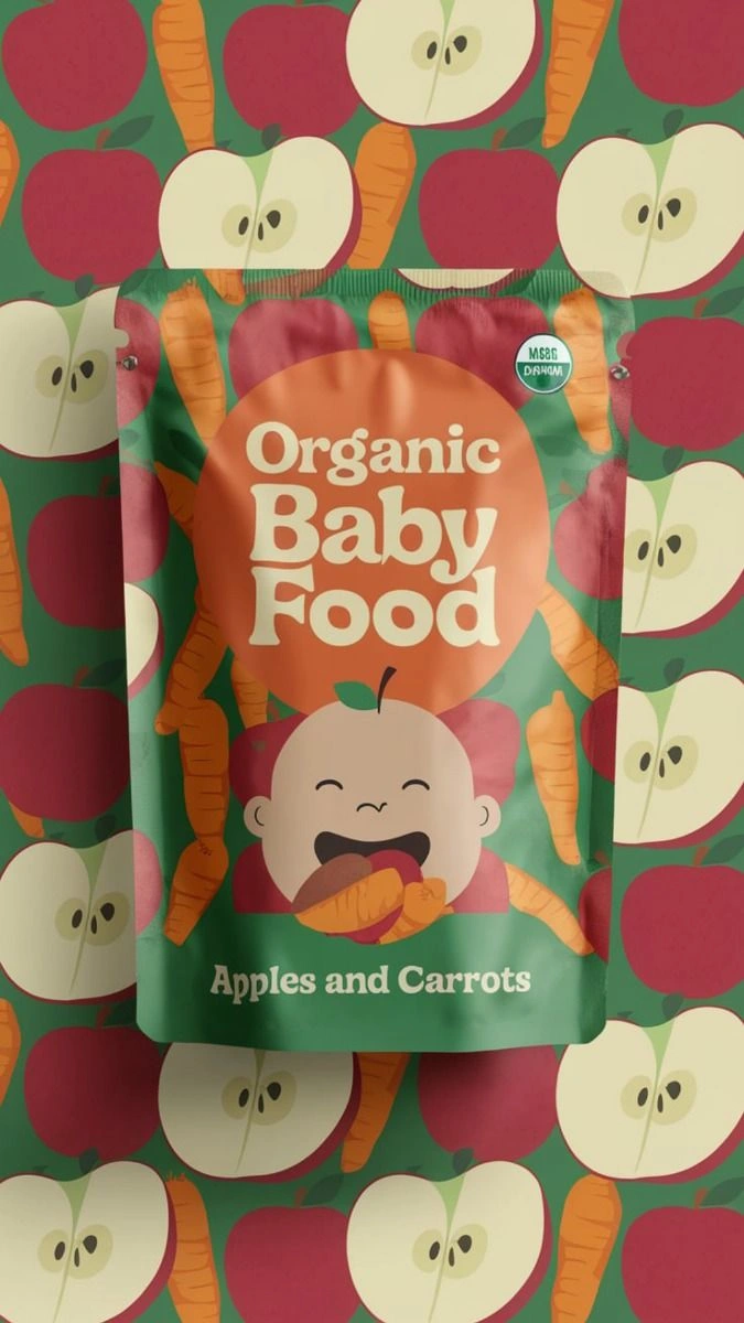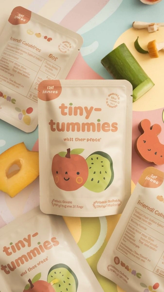 Tiny Tummies packaging uses soft pastel colors and cute, friendly graphics. The goal is to attract parents seeking healthy food for their children. The packaging design communicates the gentle and nutritious nature of the product.