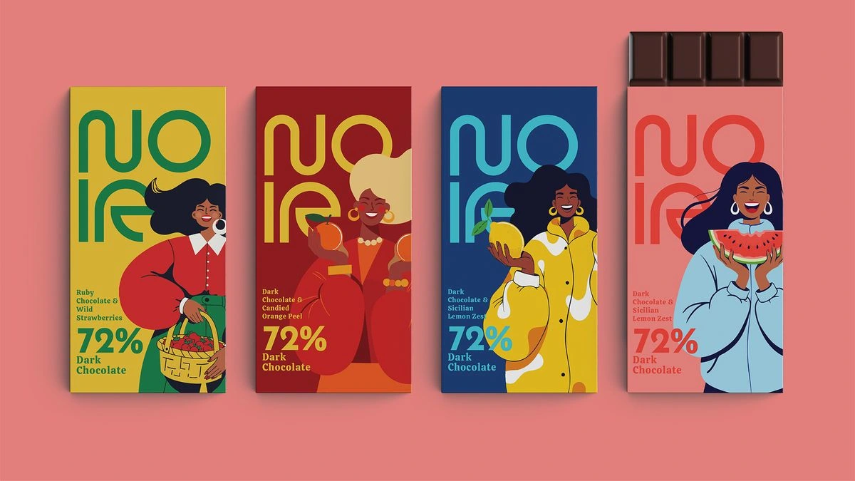 The Noir chocolate bar packaging incorporates vibrant, engaging colors and character illustrations, aimed at a young, fashionable audience. The colorful design highlights the premium nature of the chocolate while being bold and trendy.