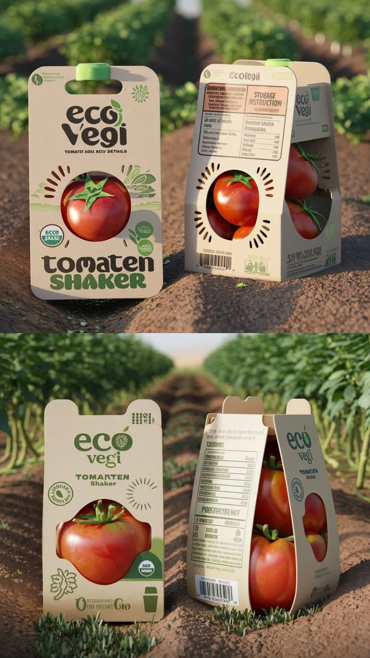 EcoVegi’s tomato packaging is designed with eco-friendly messaging and a clean, minimalistic style. The focus was on sustainability while making sure the packaging was visually appealing and functional for preserving the freshness of the tomatoes.
