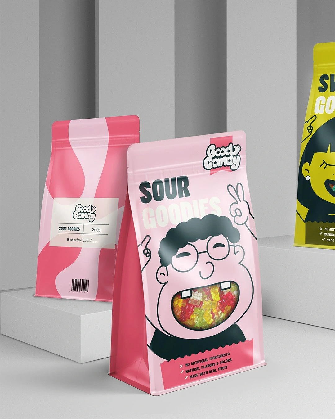 This design plays with fun and playful elements using bright colors and bold illustrations. The design aims to appeal to a younger, energetic audience and position Sour Goodies as a lighthearted and tasty treat.