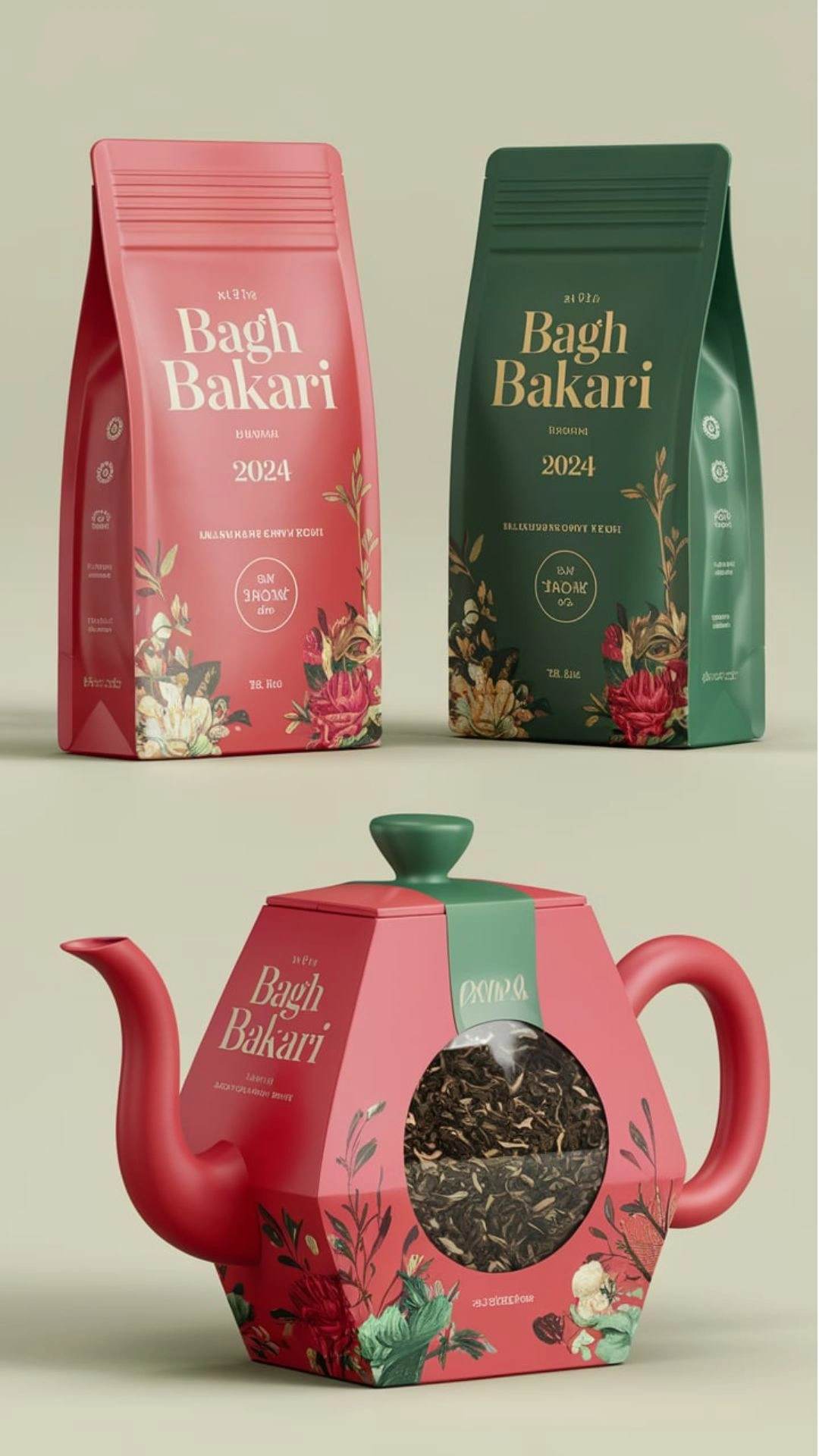 For the Bagh Bakari tea brand, I designed premium, elegant packaging with intricate floral details. The packaging aims to reflect the high-quality tea and is meant to evoke a sense of luxury while being functional with a vibrant color scheme to catch the eye of consumers.