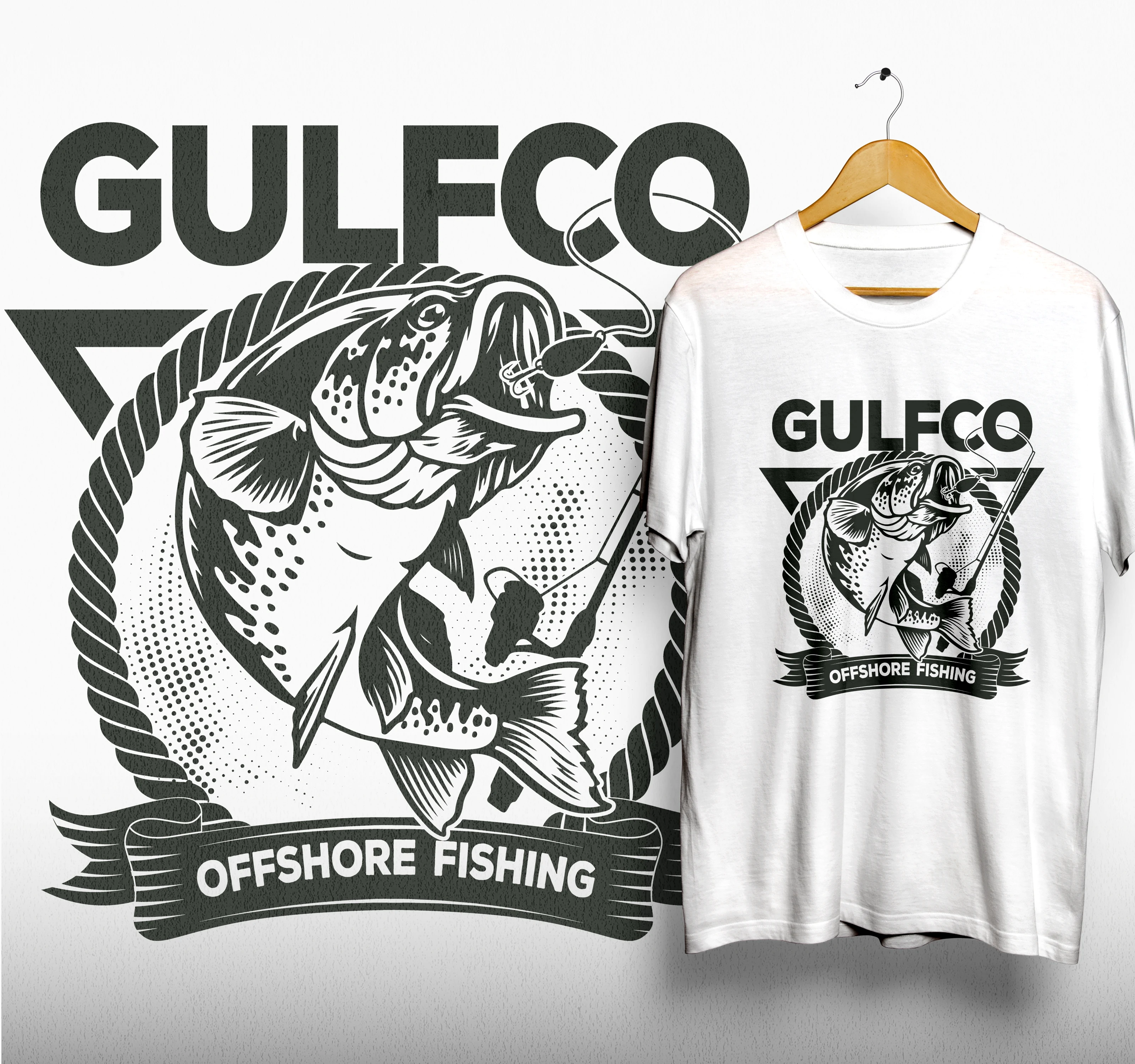 Created a dynamic t-shirt design featuring detailed bass illustration with rope border and triangular elements. Print-ready artwork optimized for commercial.