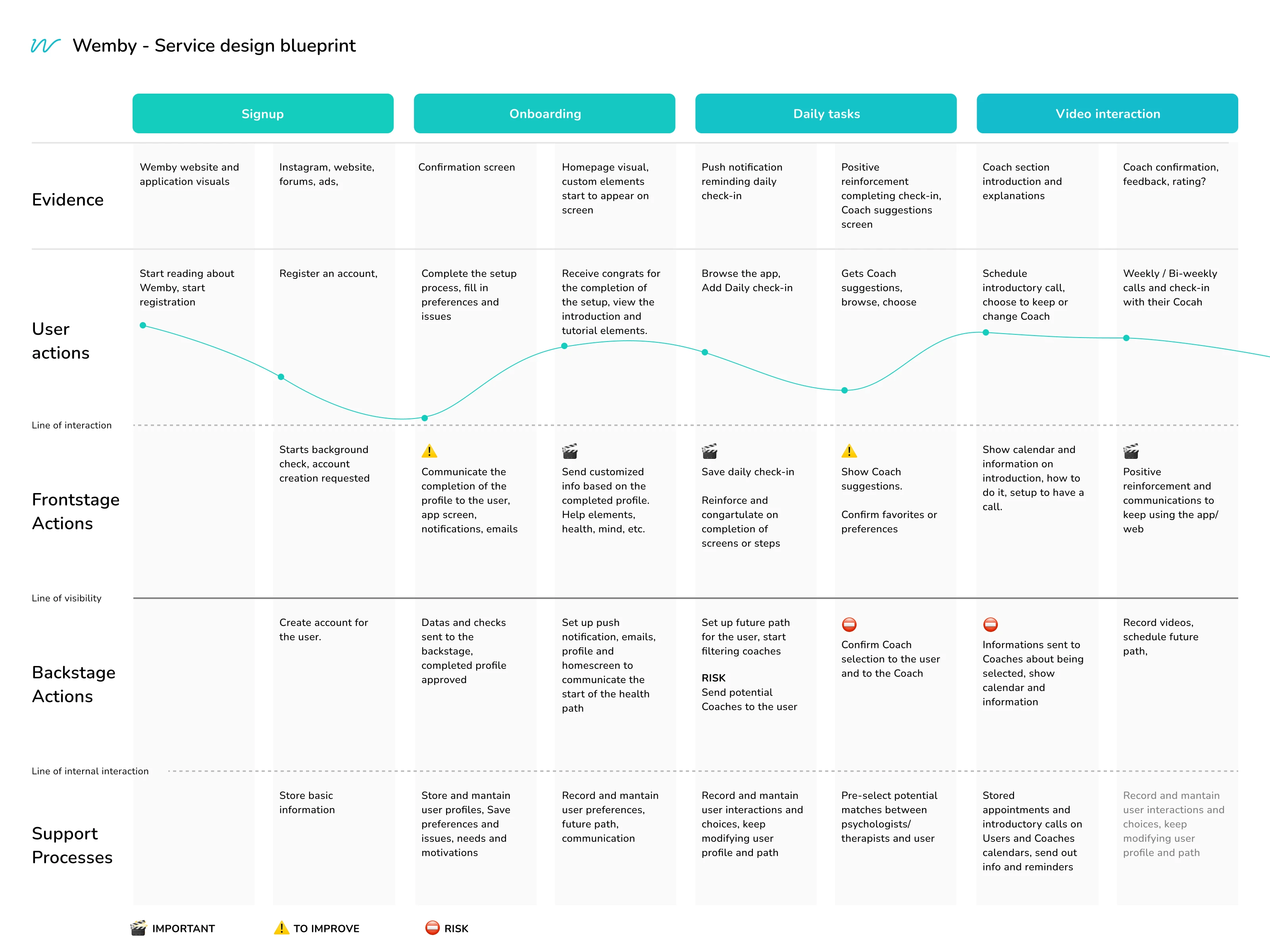 Consequently we used the results of our researches to start shaping a Service Design Blueprint of our product, we based it on prototypes and tests we did with our first users to find risks and pain points in our onboarding, setup and initial flows.