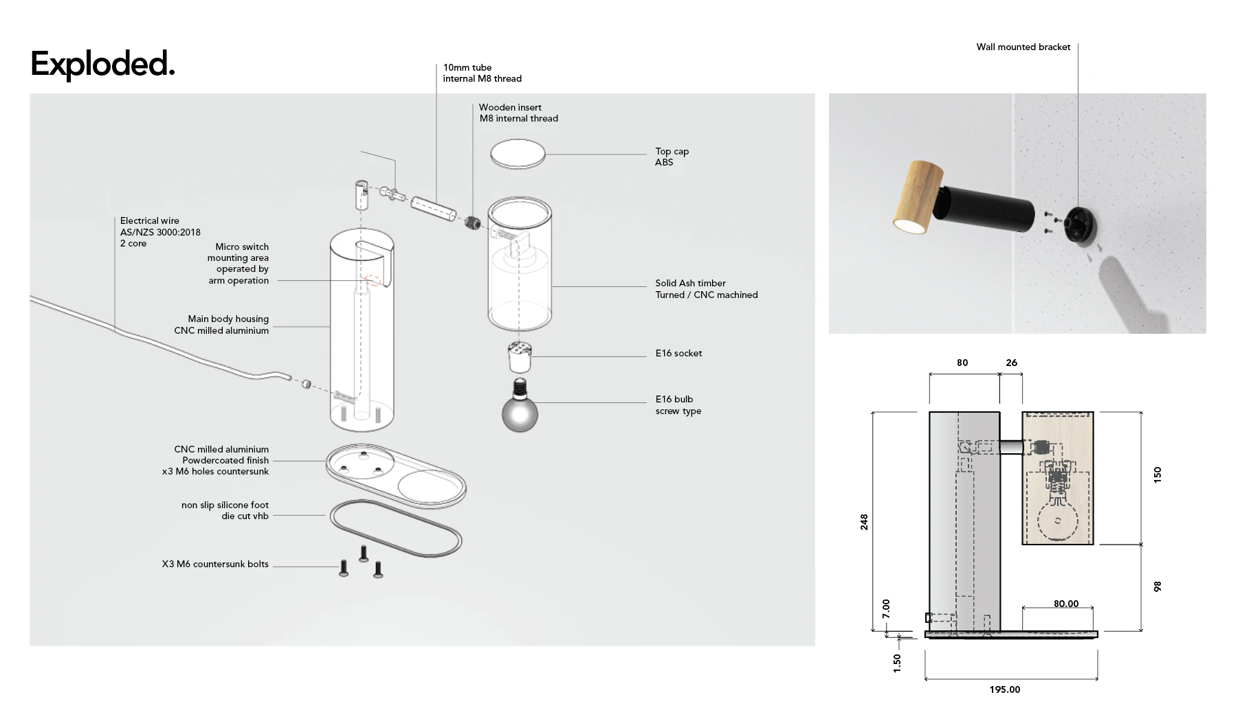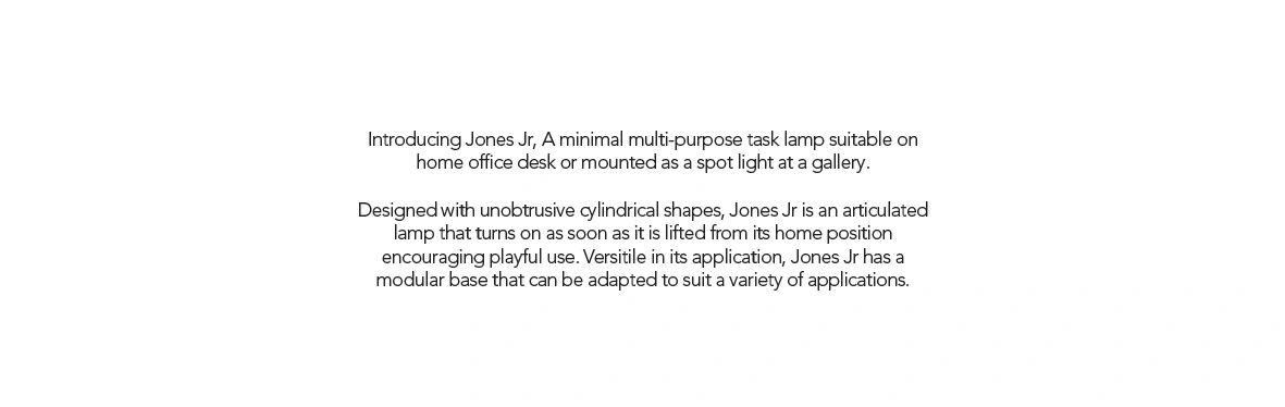 Jones Jr is a minimal multi-purpose task lamp suitable on home office desk or mounted as a spot light at a gallery.