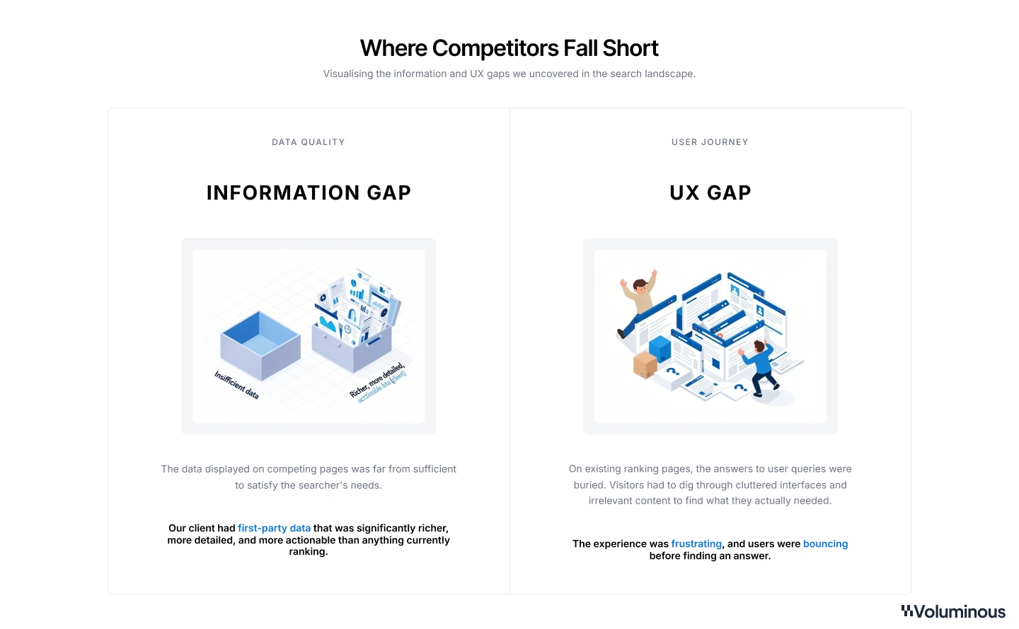 Information gap: The data on competing pages was far from enough to satisfy the searcher. Our client had first-party data that was significantly richer and more actionable than anything currently ranking.