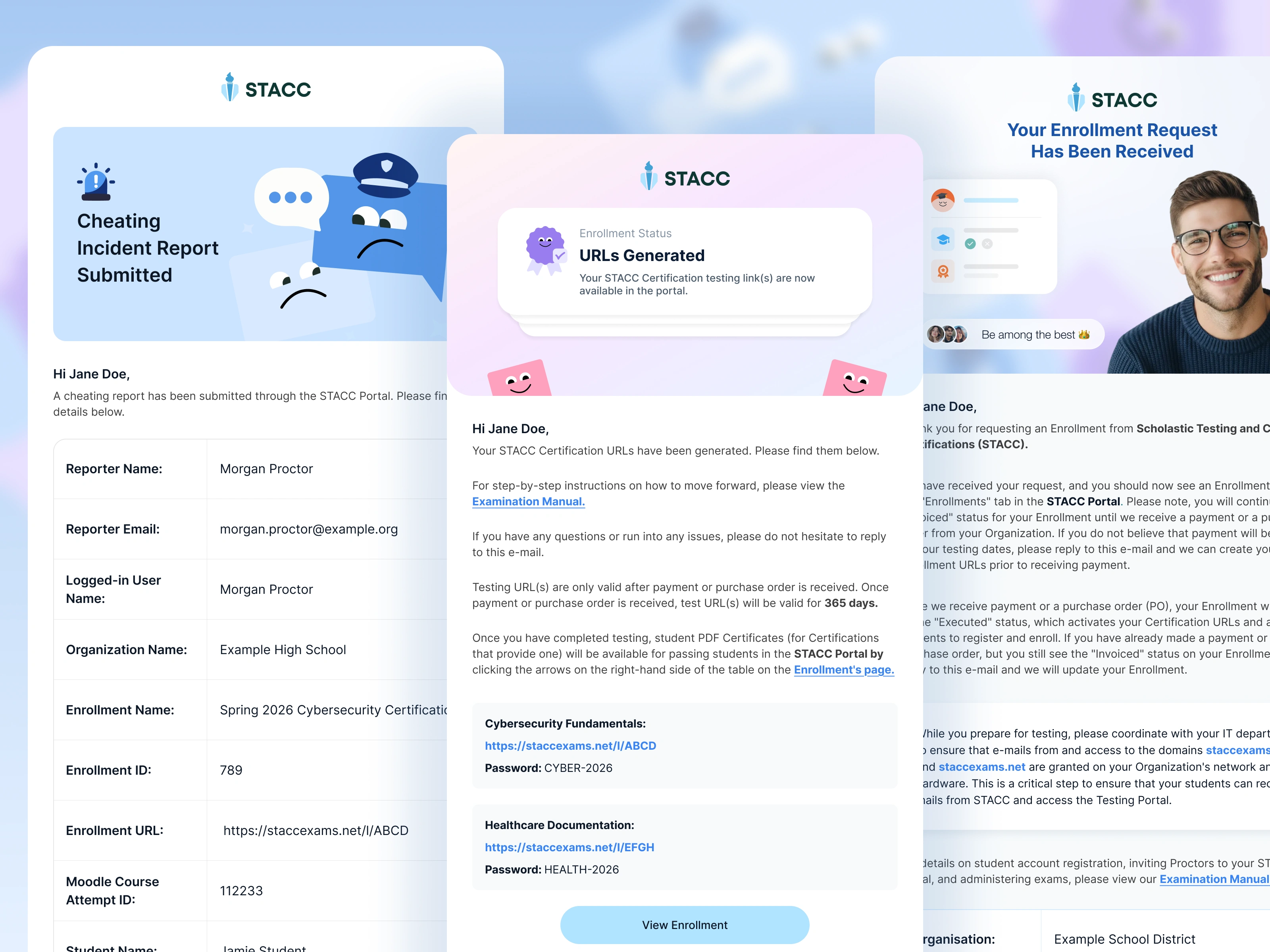 I designed transactional emails for STACC that simplify high-stakes enrollment, testing, and onboarding with calm, clear, readable layouts.