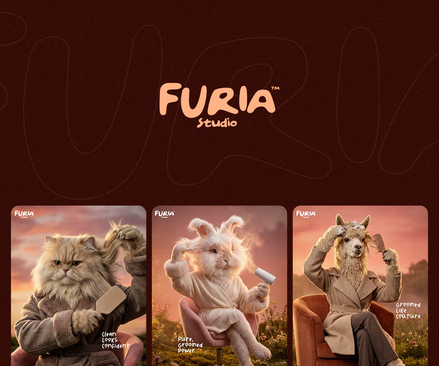 A conceptual grooming brand campaign for FURIA Studio, blending instinct and refinement through editorial visuals across social media and outdoor campaigns.