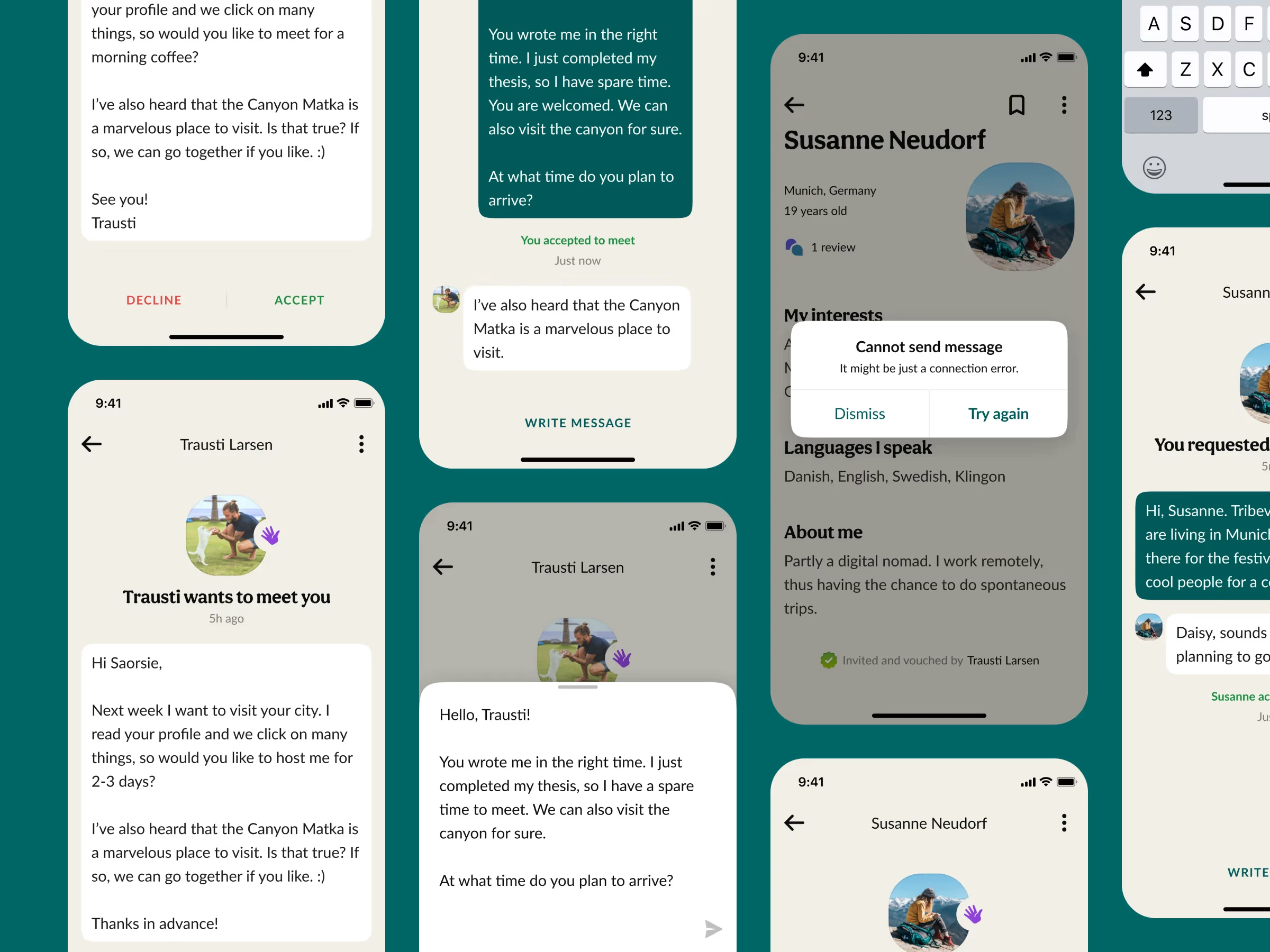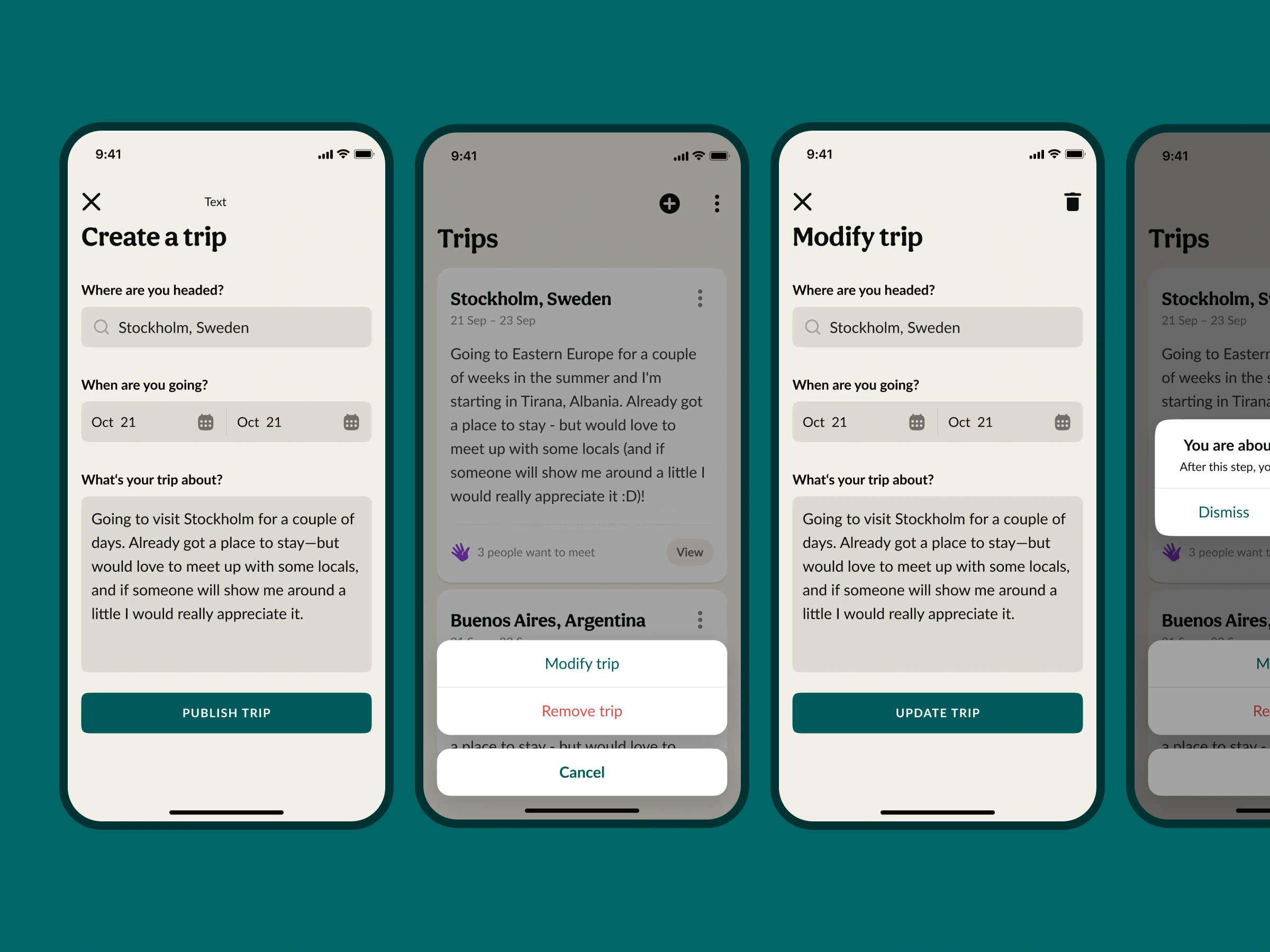 To make discovery more dynamic, I added Public Trips—a way for members to share where they’re going next. This feature allowed others to see who might be visiting their city, meet travellers with shared interests, and host newcomers in their hometown. It helped Tribevibe grow organically through movement itself—friendships formed on trains, beaches, co-working spots, and airports.