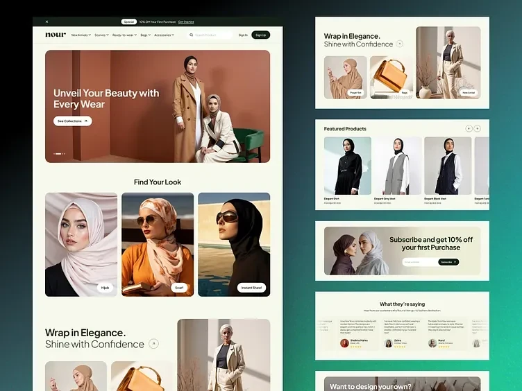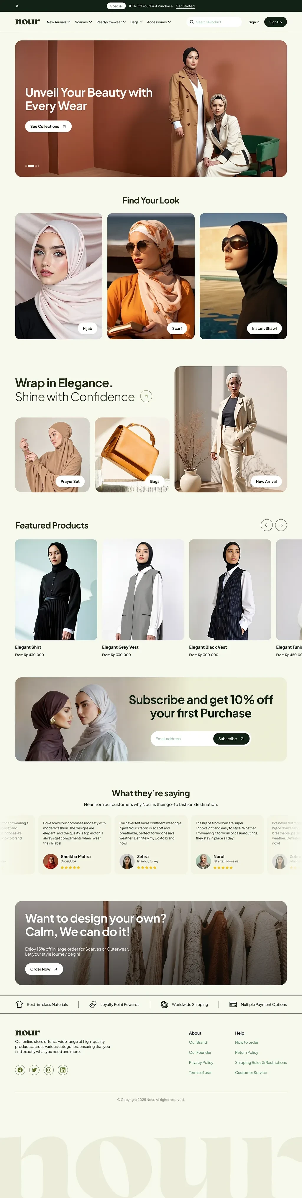 Modern fashion eCommerce for Nour, blending minimal design, bold typography, and intuitive navigation for a premium feel.