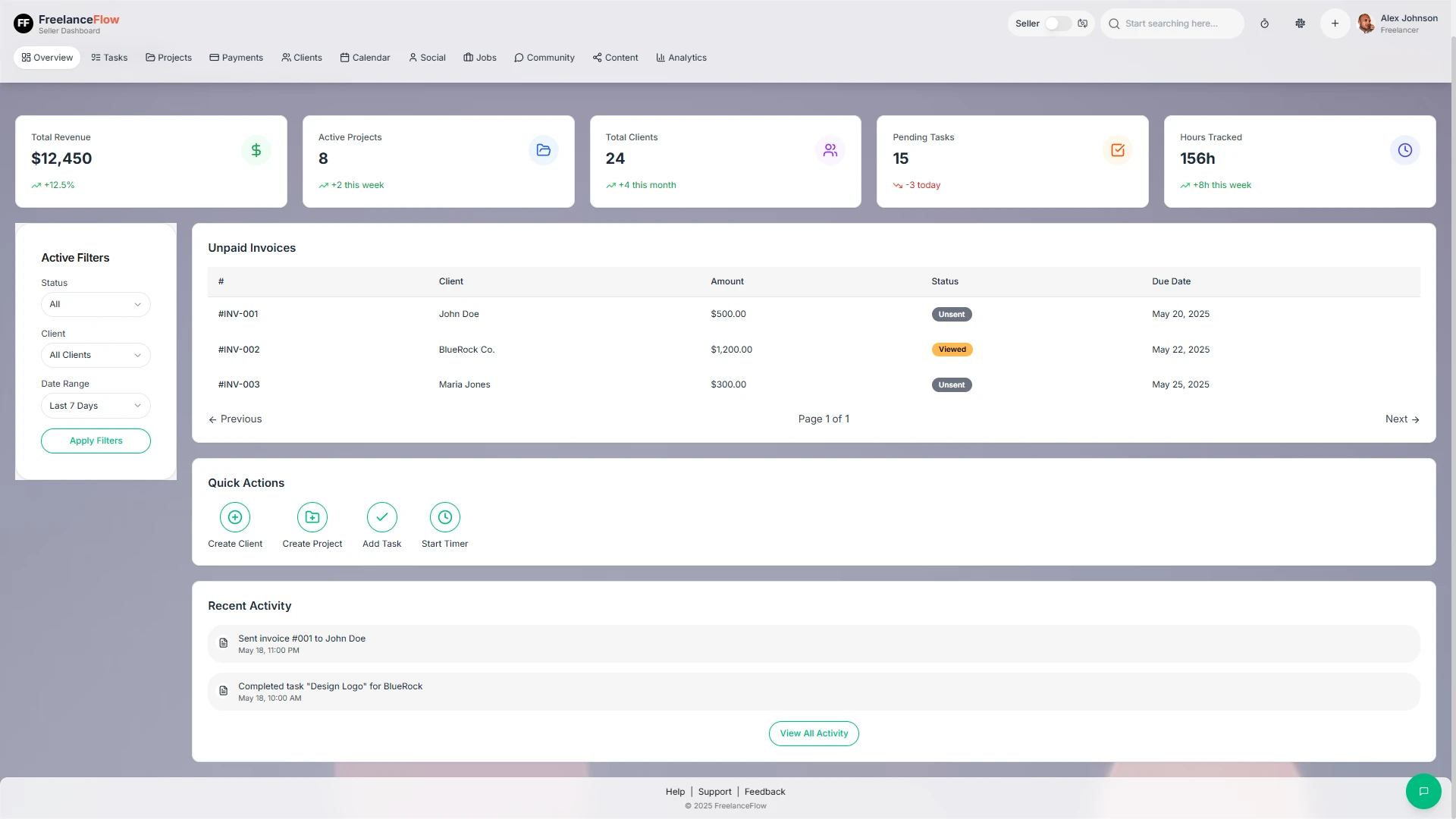 Streamlined complex freelance workflows into an intuitive system built for speed, clarity, and growth. Positioned for MVP launch with future-ready modules like smart notifications and client portals.Problem: Freelancers often juggle multiple tools for clients, tasks, invoices, and project tracking—leading to inefficiency, data loss, and burnout. There’s a lack of a unified, freelancer-centric system tailored to their workflow. Solution: FreelanceFlow is a futuristic, AI-enhanced platform designed to centralize freelance operations—from job discovery to payment tracking—within one seamless experience.