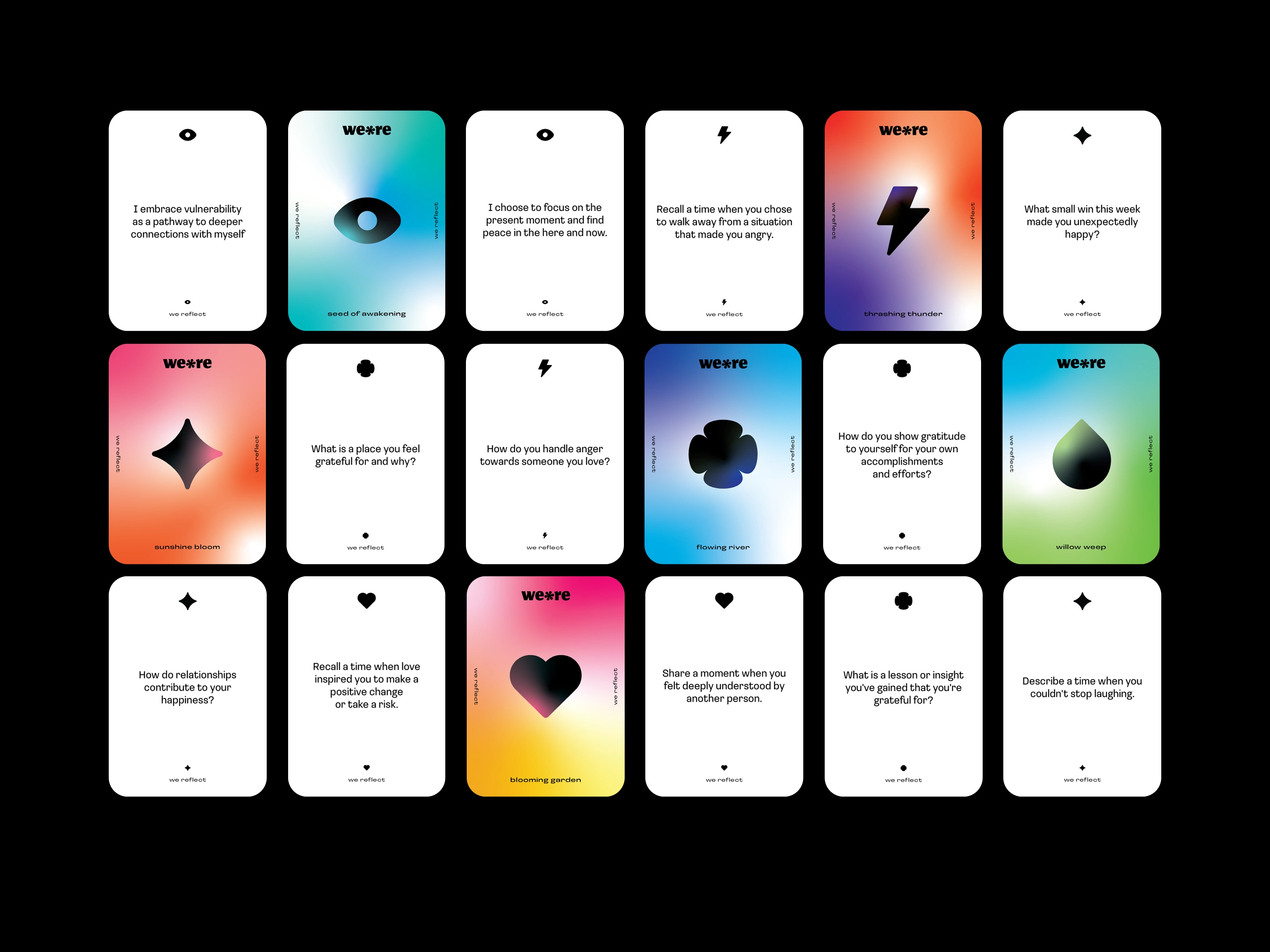 The visual identity is rooted in color theory, natural symbols, and names drawn from nature. Altogether, these choices evoke a calm mood and openness for reflection, making the deck not just a tool, but an experience that fosters emotional intelligence and authentic conversations.