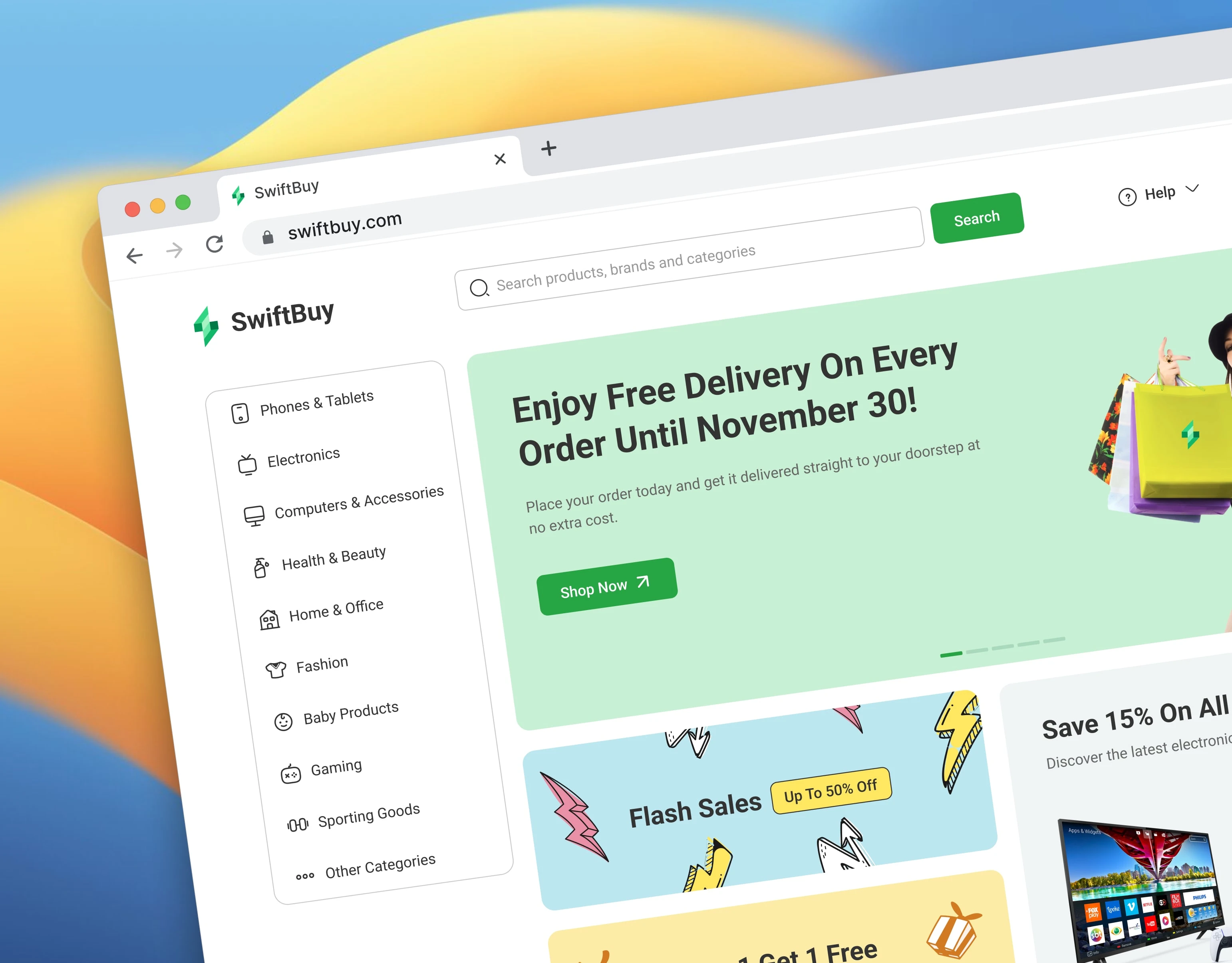 The SwiftBuy design enhances the customer journey from browsing to checkout. By combining intuitive navigation with promotional highlights, the platform not only simplifies shopping but also encourages customer retention and repeat purchases.