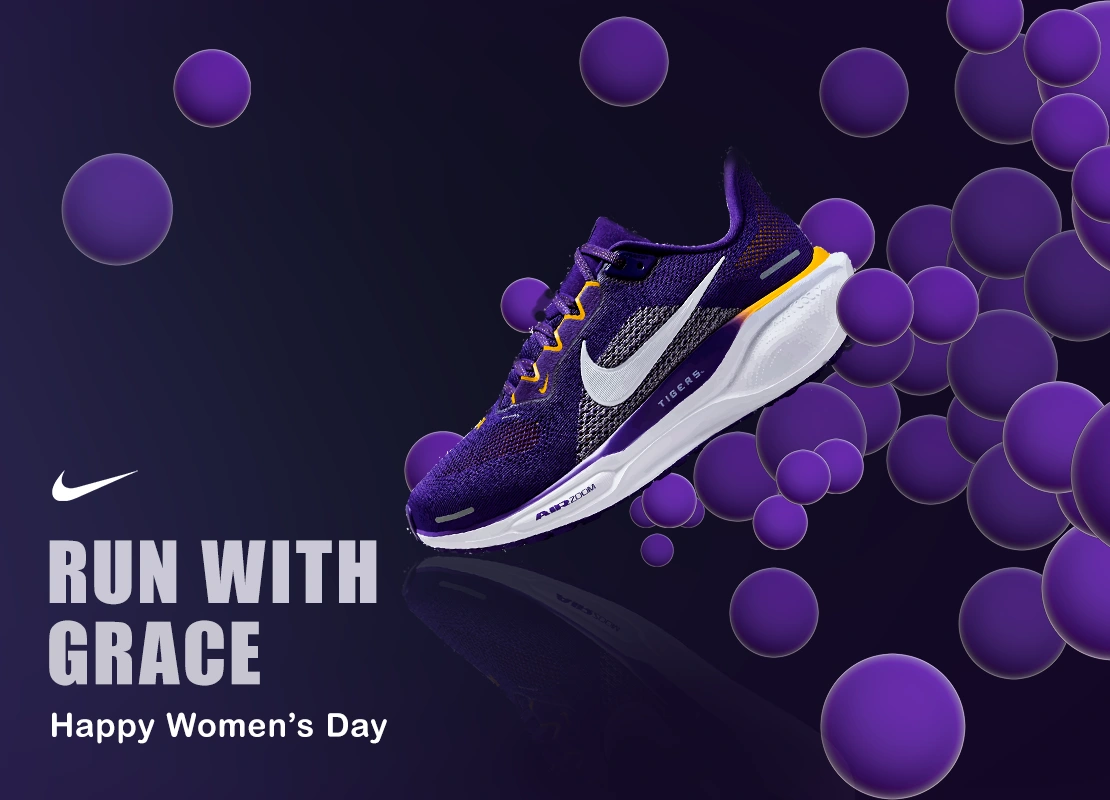 A high-energy, motivational poster celebrating female runners in honor of International Women’s Day. The design will highlight Nike latest women’s running shoes