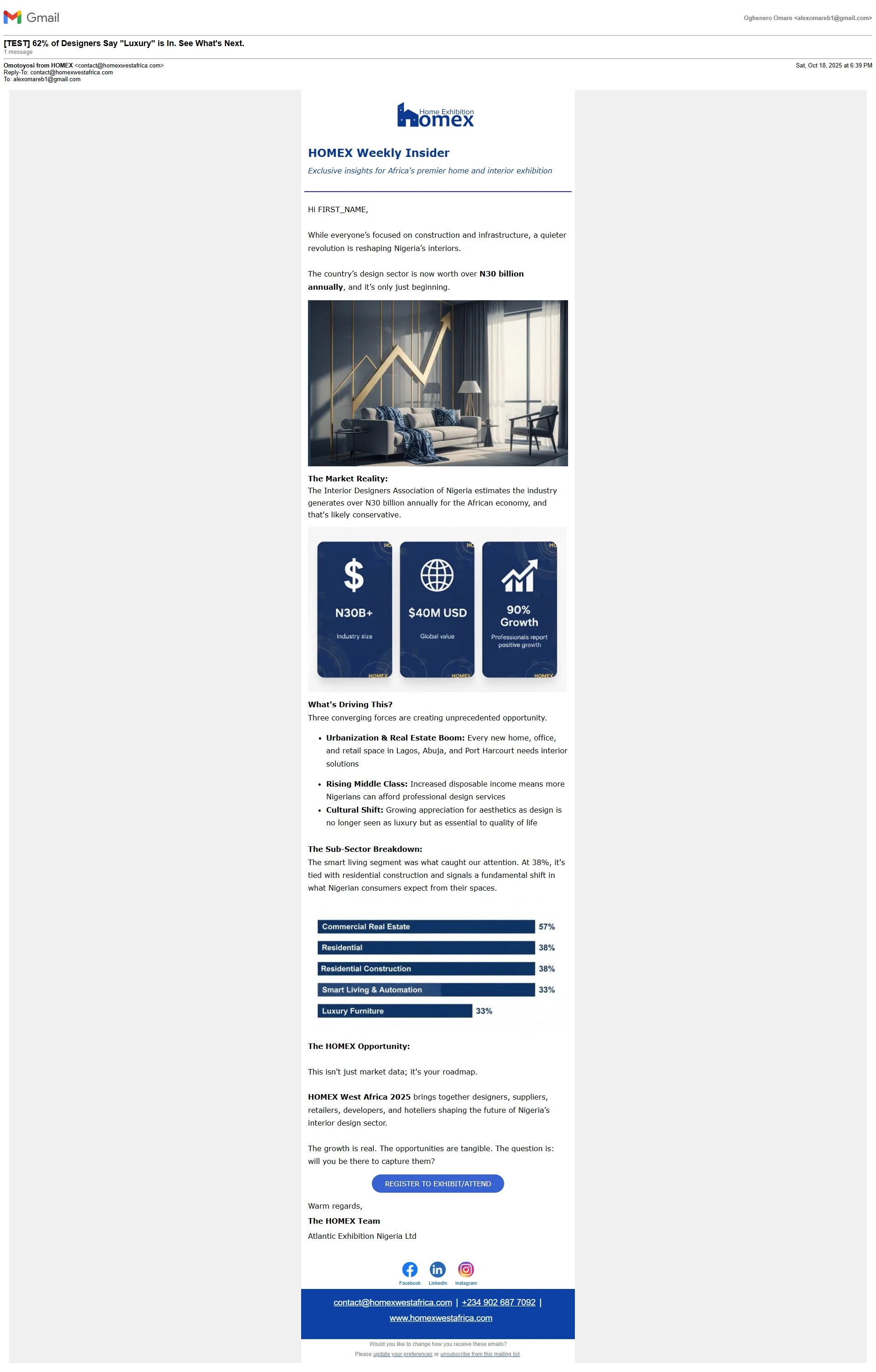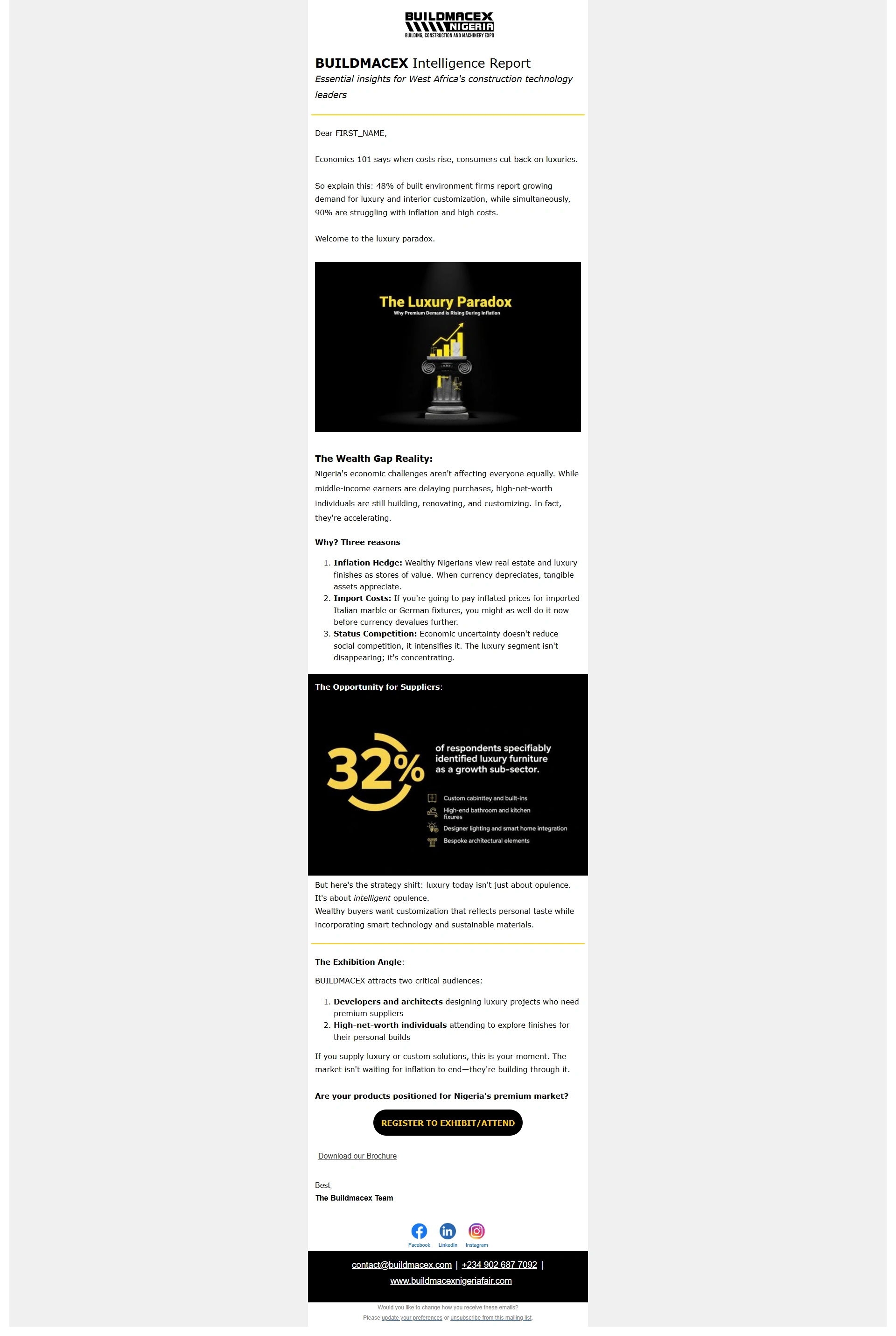 Stage Africa was launching three new B2B exhibition brands (BUILDMACEX, HOMEX, FEWA) with zero existing email marketing infrastructure. The goal was to attract 300+ exhibitors and 15,000+ attendees through targeted, scalable communication with no prior database or automated systems in place.