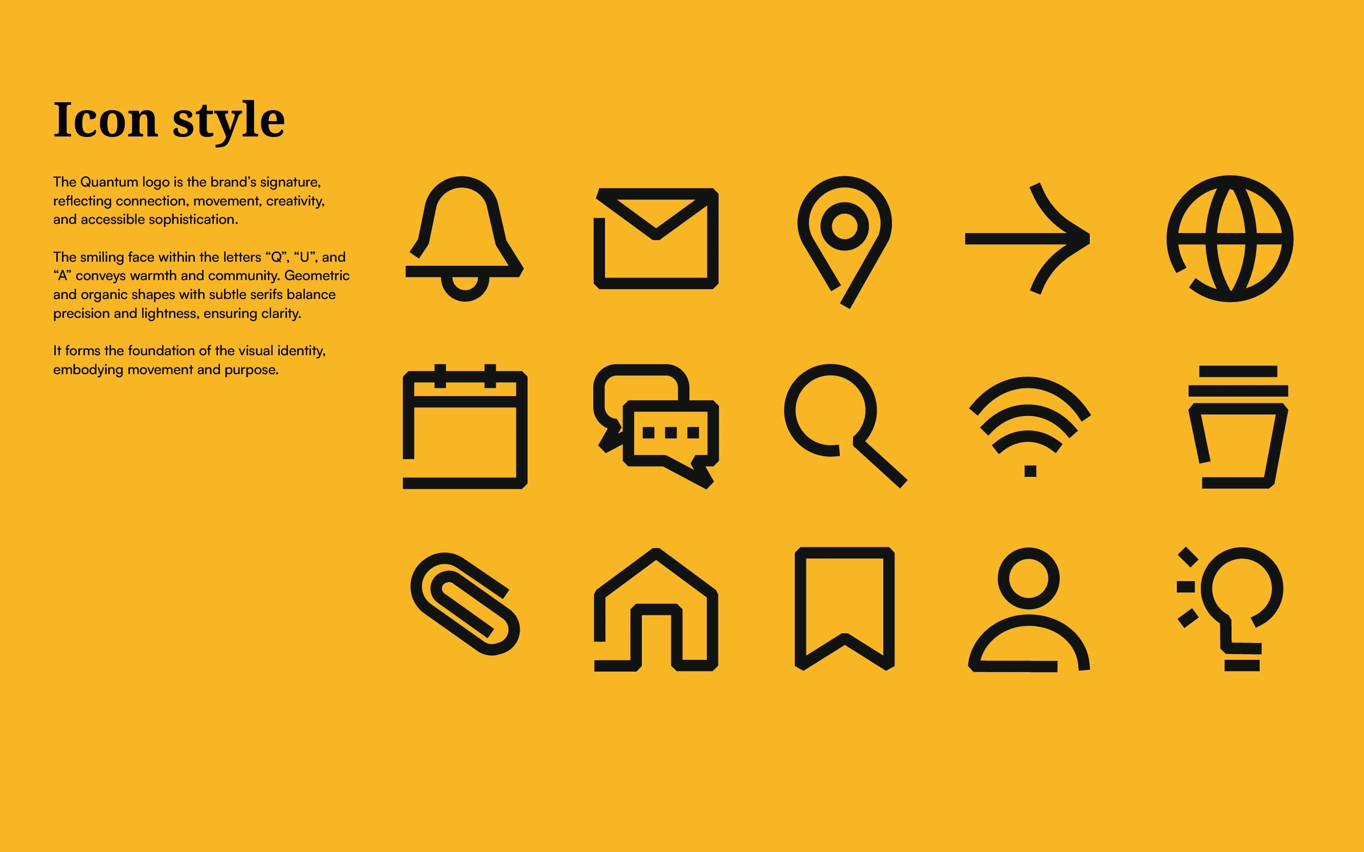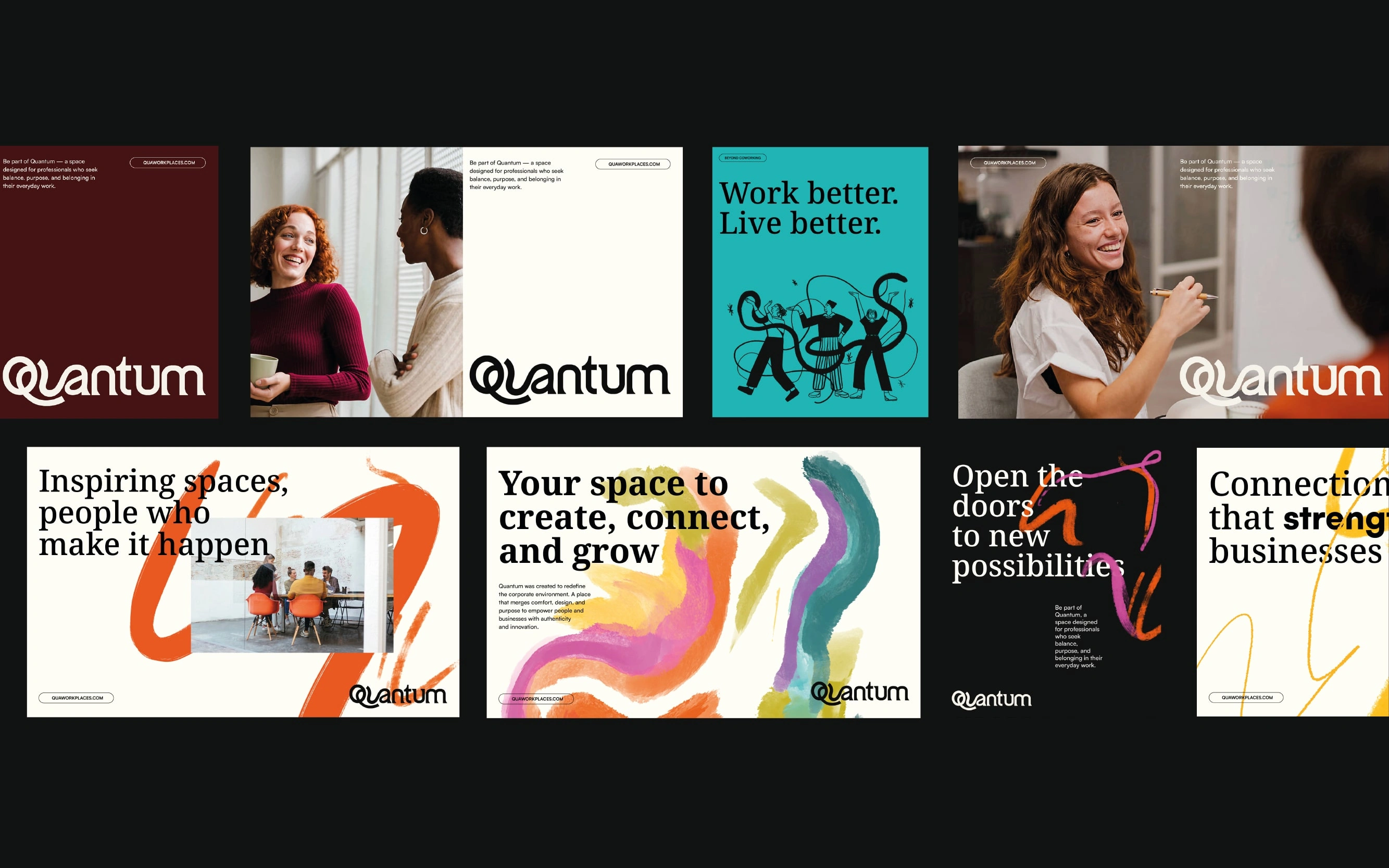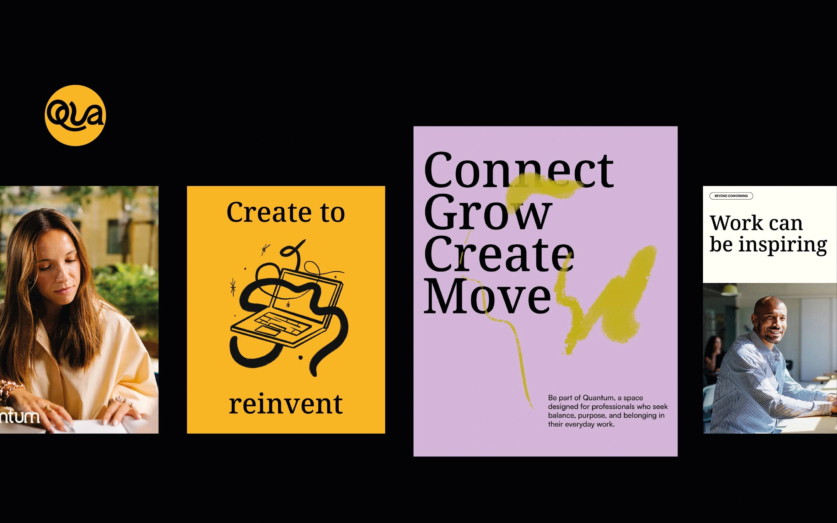 Complete visual identity for Quantum Workspace, a Miami-based coworking space conceived as an ecosystem for connection, exchange, and growth. The project brings together geometric and organic forms within a fluid, expansive, and versatile visual system. The experimental typography, combining serif and sans serif, creates a distinctive visual gesture by subtly revealing a smiling face within the letters “Q,” “U,” and “A,” reinforcing the brand’s human, collaborative, and sophisticated values.