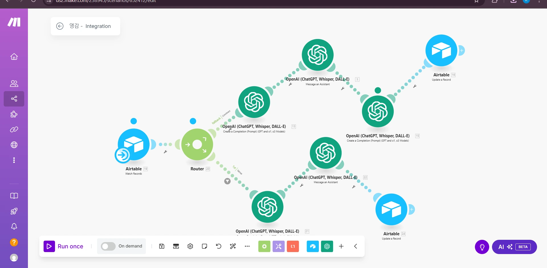 This is an automation scenario integrates Airtable with OpenAI's GPT models using Make.com to streamline data processing, enrichment, and feedback.