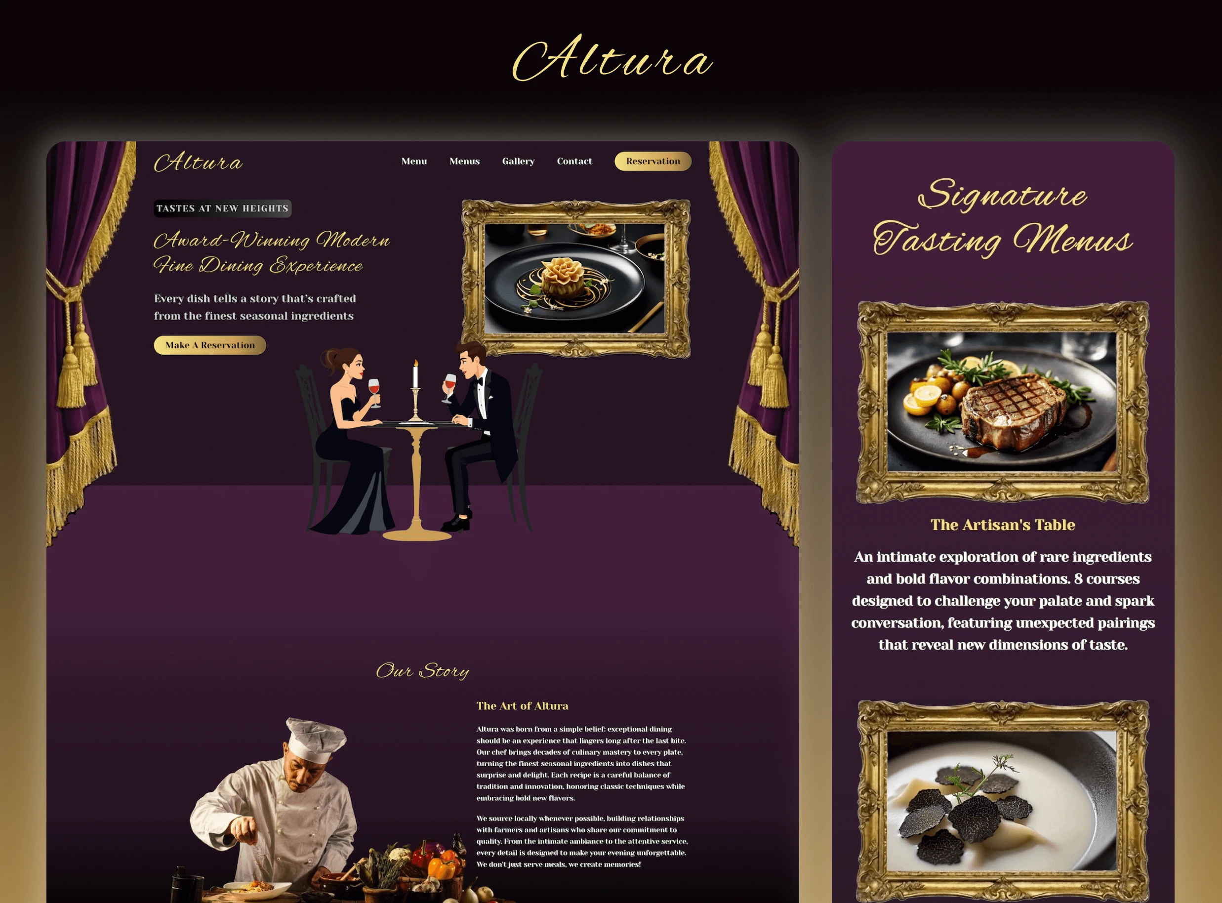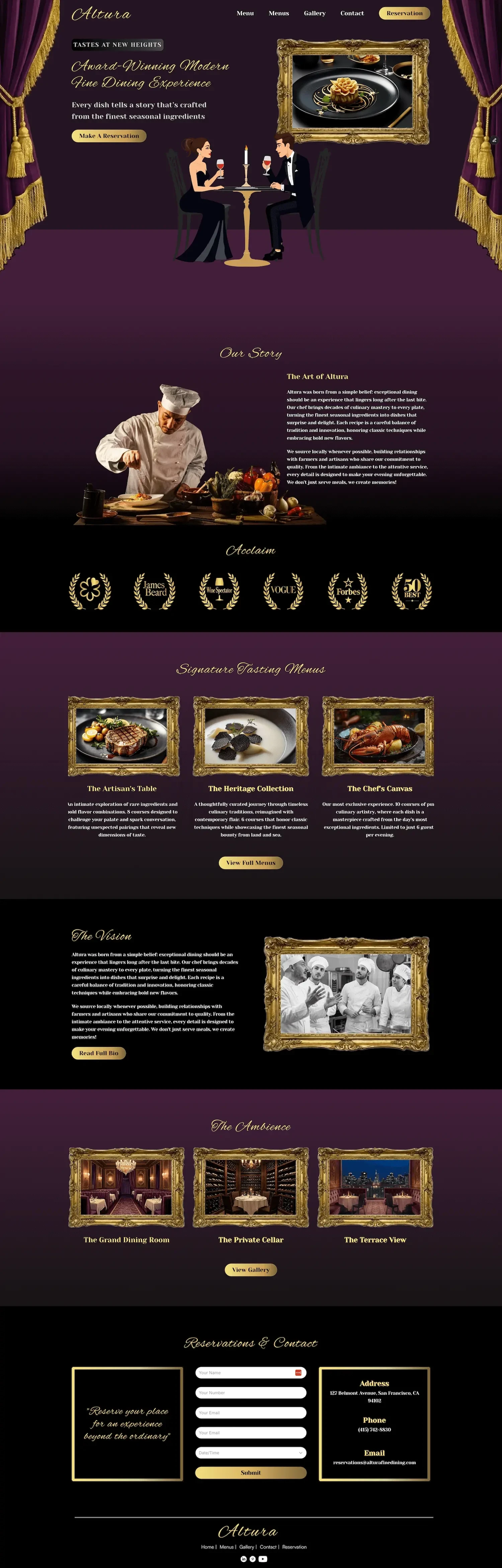 The design process started with understanding that fine dining can feel exclusive or intimidating to many people, so every decision focused on maintaining luxury while creating warmth. Instead of the typical stark minimalist aesthetic found in many high-end restaurant websites, the approach centered on theatrical presentation and storytelling. The visual language emphasizes artistry and celebration. Using rich colors and illustrated elements that make fine dining feel like a special occasion worth experiencing rather than something reserved for a select few. Every element, from the ornate frames to the illustrated diners enjoying their evening, was crafted to make visitors feel "I want to experience this" rather than "this isn't for someone like me."