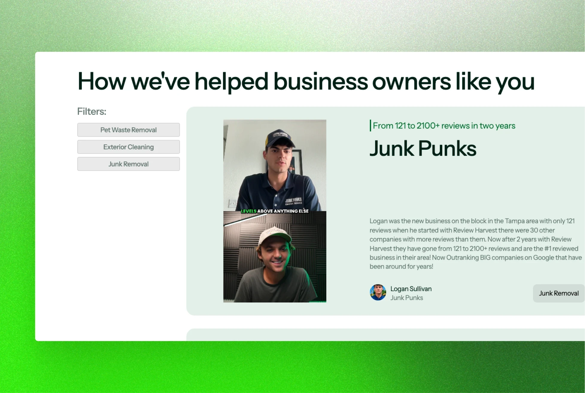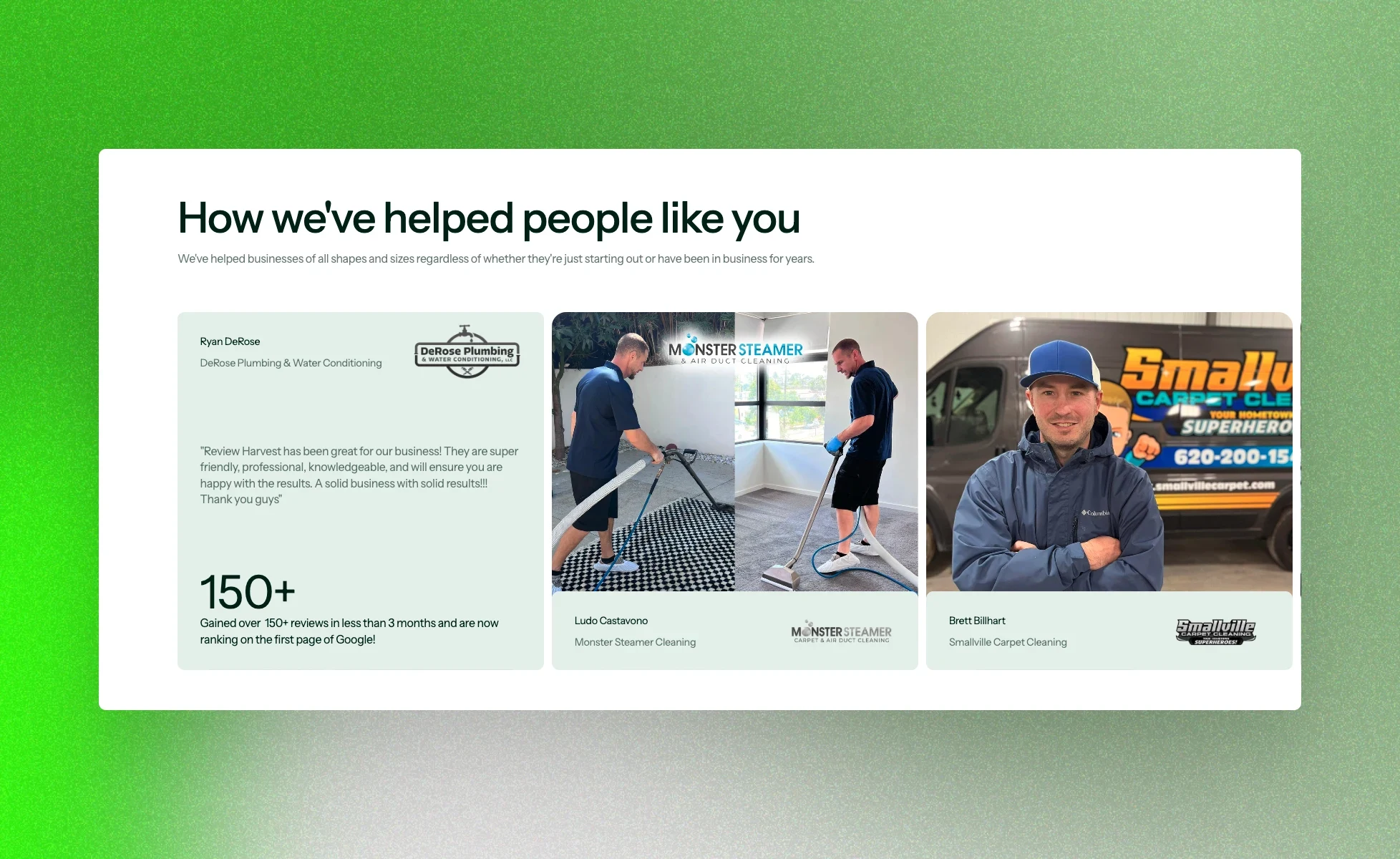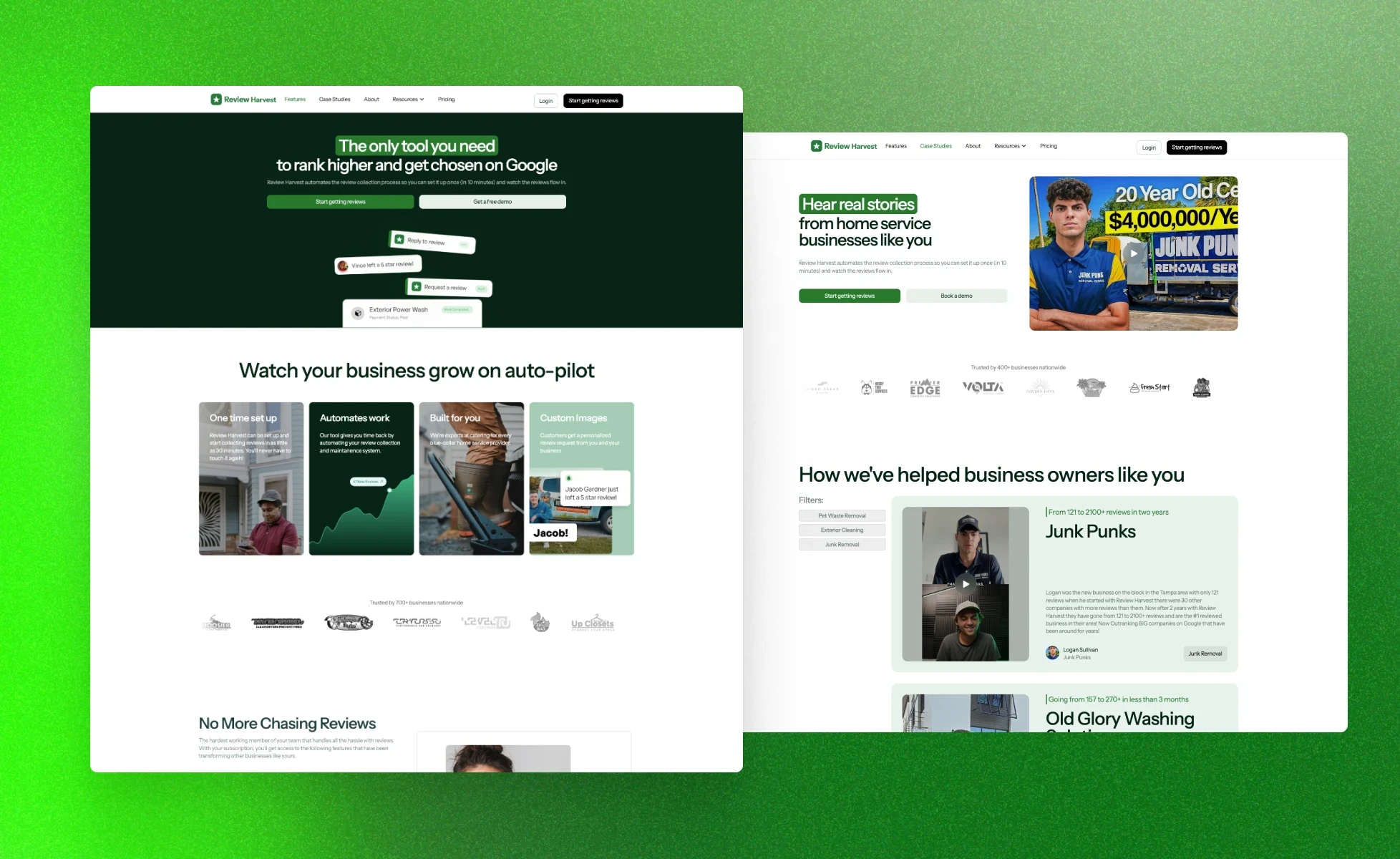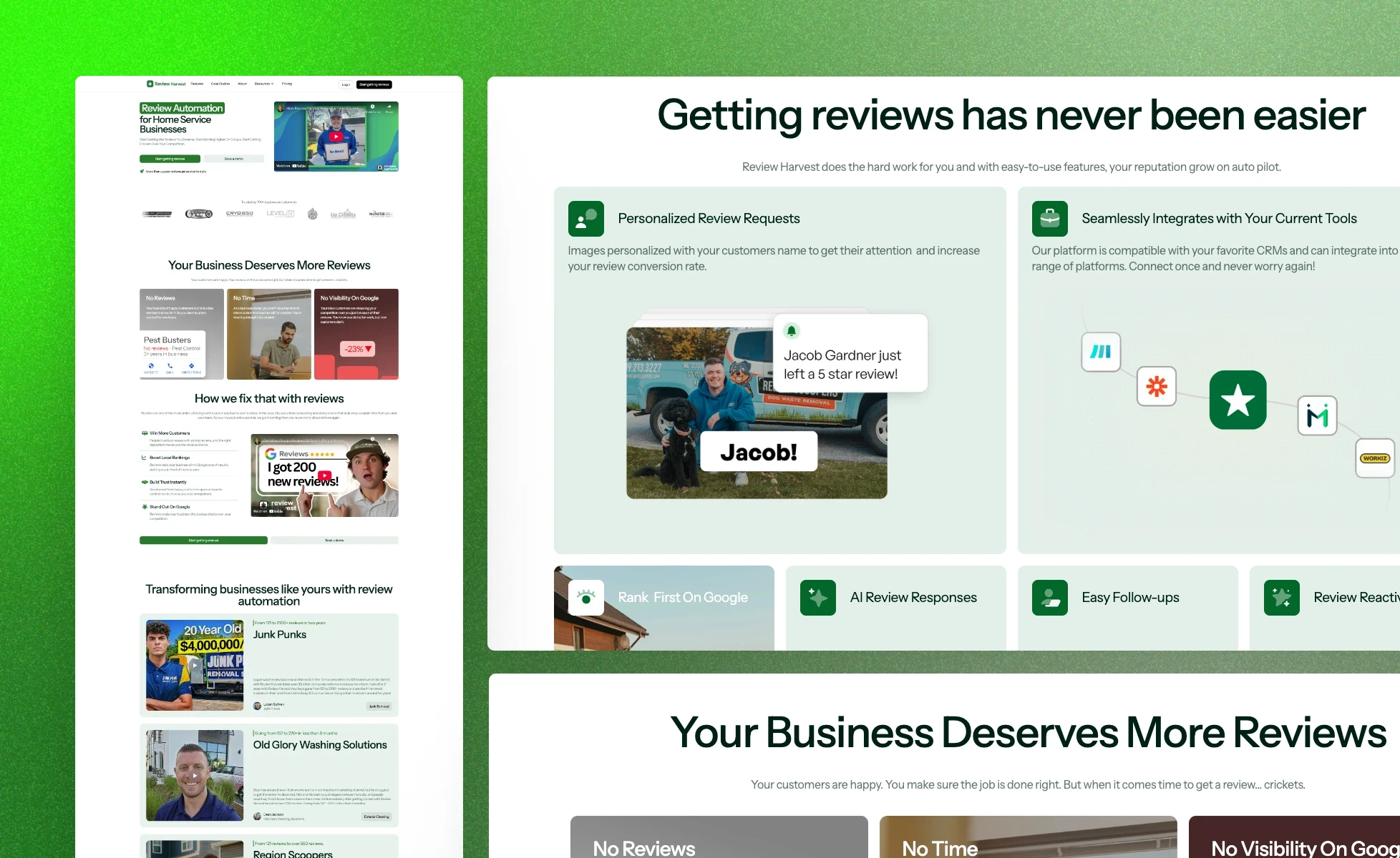 Redesigning and revamping the old website with fresh content and visuals to match Review Harvest's new branding and messaging.