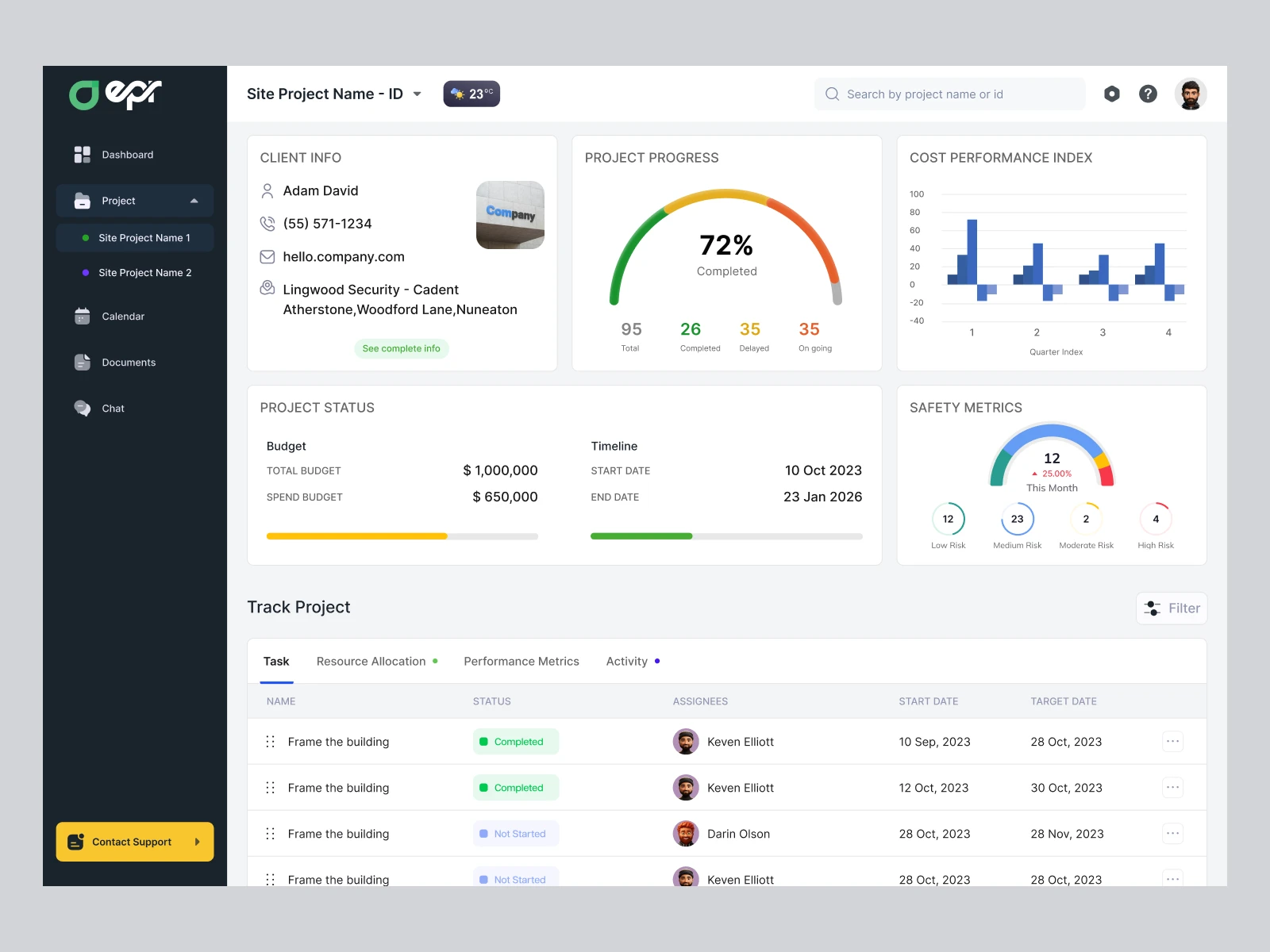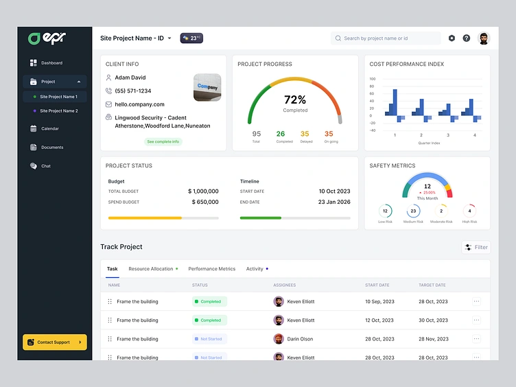 We designed this Construction ERP dashboard as an agency deeply focused on clarity, usability, and decision-speed for high-stakes project environments. Our goal was to reduce cognitive load for site managers by organizing critical data—like project progress, safety metrics, budget utilization, and task statuses—into a clean, glanceable layout. Every component, from the live cost index chart to the weather badge, was crafted to support real-time decision-making and cross-team coordination. We prioritized visual hierarchy, intuitive iconography, and modular scalability to ensure the system works seamlessly across multiple site projects